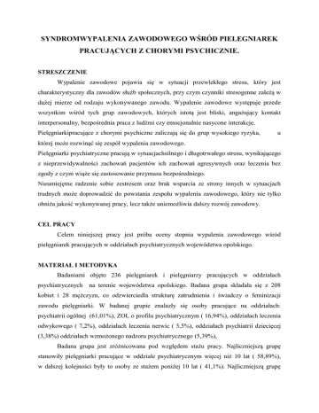 SYNDROMWYPALENIA ZAWODOWEGO WŚRÓD PIELEGNIAREK PRACUJĄCYCH Z CHORYMI PSYCHICZNIE. STRESZCZENIE Wypalenie zawodowe pojawia się w sytuacji przewlekłego stresu, który jest charakterystyczny dla zawodów służb społecznych, przy czym czynniki stresogenne zależą w dużej mierze od rodzaju wykonywanego zawodu. Wypalenie zawodowe występuje przede wszystkim wśród tych grup zawodowych, których istotą jest bliski, angażujący kontakt interpersonalny, bezpośrednia praca z ludźmi czy emocjonalnie nasycone interakcje. Pielęgniarkipracujące z chorymi psychiczne zaliczają się do grup wysokiego ryzyka, u której może rozwinąć się zespół wypalenia zawodowego. Pielęgniarki psychiatryczne pracują w sytuacjachsilnego i długotrwałego stresu, wynikającego z nieprzewidywalności zachowań pacjentów ich zachowań agresywnych oraz leczenia bez zgody z czym wiąże się zastosowanie przymusu bezpośredniego. Nieumiejętne radzenie sobie zestresem oraz brak wsparcia ze strony innych w sytuacjach trudnych może doprowadzić do powstania zespołu wypalenia zawodowego, który nie tylko obniża jakość wykonywanej pracy, lecz także uniemożliwia dalszy rozwój zawodowy. CEL PRACY Celem niniejszej pracy jest próba oceny stopnia wypalenia zawodowego wśród pielęgniarek pracujących w oddziałach psychiatrycznych województwa opolskiego. MATERIAŁ I METODYKA Badaniami objęto 236 pielęgniarek i pielęgniarzy pracujących w oddziałach psychiatrycznych na terenie województwa opolskiego. Badana grupa składała się z 208 kobiet i 28 mężczyzn, co odzwierciedla strukturę zatrudnienia i świadczy o feminizacji zawodu pielęgniarki. W badanej grupie znalazły się osoby pracujące na oddziałach: psychiatrii ogólnej (61,01%), ZOL o profilu psychiatrycznym ( 16,94%), oddziałach leczenia odwykowego ( 7,2%), oddziałach leczenia nerwic ( 5,5%), oddziałach psychiatrii dziecięcej (3,38%) oddziałach wzmożonego nadzoru psychiatrycznego (5,39%), Badana grupa jest zróżnicowana pod względem stażu pracy. Najliczniejszą grupę stanowiły pielęgniarki pracujące w oddziale psychiatrycznym więcej niż 10 lat ( 58,89%), w dalszej kolejności były to osoby ze stażem poniżej 10 lat ( 41,1%). Najliczniejszą grupę stanowiły pielęgniarki z wykształceniem średnim 61,95%, natomiast wykształcenie wyższe posiadało 14,14% ankietowanych, a 23,9% stanowiły pielęgniarki z tytułem licencjata. Materiał badawczy stanowiły dane pozyskane drogą ankietowania. WSTĘP Przemiany cywilizacyjne i wzrastające wymagania stawiane zawodom służb społecznych spowodowały, że koszty psychologiczne jakie ponoszą w swojej pracy pielęgniarki są coraz poważniejsze. Doświadczają coraz więcej stresu, z którym trudno sobie poradzić. Zjawisko wypalenia zawodowego analizuje się głównie z perspektywy osób wypalających się. Należy jednak zwrócić uwagę na koszta społeczne, jakie ono za sobą niesie. Praca osób wypalonych znacznie pogarsza jakość usług. Stres sam w sobie jest pozytywną siłą, która zachęca do działań będących reakcją na wymagania. Wysoki i stały poziom stresu pozwala przetrwać, ale staje się negatywny i szkodliwy, gdy nie można sobie poradzić z wyzwaniami. Pojawia się jako fizyczne, emocjonalne i umysłowe napięcie wtedy, gdy zachodzi rozdźwięk pomiędzy sytuacją a tym co oceniane jest jako możliwość poradzenia sobie. W pojęciu społeczno - poznawczym wypalenie zawodowe według M. Grzegorzewskiej definiowane jest jako „zespół objawów pojawiających się u osób wykonujących zawody, w których bliski kontakt interpersonalny, pełen zaangażowania i cechy osobowości profesjonalisty stanowią podstawowe instrumenty czynności zawodowych decydujące o poziomie wykonania zawodu, o sukcesach, o niepowodzeniach zawodowych.” Istotę wypalenia zawodowego najlepiej wyjaśnia trójwymiarowa teoria wypalenia, która sformułowała Christine Maslach. Do opisu wypalenia zawodowego niezbędne jest scharakteryzowanie trzech elementów składowych tego zjawiska, czyli: 1. Wyczerpania emocjonalnego, które objawia się „zniechęceniem do pracy, coraz mniejszym zainteresowaniemsprawami zawodowymi, obniżoną aktywnością, pesymizmem, stałym napięciem psychofizycznym, drażliwością, ale także chronicznym zmęczeniem, bólami głowy, bezsennością, zaburzeniami gastrycznymi iczęstymi przeziębieniami.” 2. Depersonalizacji, związanej zobojętnością i dystansowaniem się wobec problemów klienta, powierzchownością, skróceniem czasu i sformalizowaniem kontaktów, cynizmem, obwinianiem klientów za niepowodzenie w pracy. Depersonalizacja, czyli uprzedmiotowienie, jest próbą zwiększenia psychicznego dystansu wobec osoby, z którą się pracuje.” 3. Obniżeniu poczucia dokonań osobistych, a więc do tendencji „widzenia swojej pracy zklientem w negatywnym świetle. Objawia się to niezadowoleniem z osiągnięć wpracy, przeświadczeniem o braku kompetencji, utratą wiary we własne możliwości, poczuciem niezrozumienia ze strony przełożonych, stopniową utratą zdolności do rozwiązania pojawiających się problemów i niemożnością przystosowania się do trudnych warunków zawodowych. W relacji z ludźmi może ono przyjmować skrajne formy zachowań agresywnych, jak i ucieczkowych.” Obecność trzech elementów składowych wypalenia jest cechą odróżniającą syndrom wypalenia od innych następstw stresu zawodowego. Według takiej koncepcji wypalenie zawodowe najczęściej opisywane jest jako proces trójetapowy, w którym na początku pojawiają się objawy wyczerpania emocjonalnego, następnie zachowania prowadzące do depersonalizacji klientów i w końcu poczucie braku dokonań osobistych. Warto jednak pamiętać, że w praktyce rozwój wypalenia nie zawsze przebiega zgodnie teoretycznym modelem tego zjawiska. Poszczególne fazy mogą pojawiać się w innej kolejności, czasem udaje się zaobserwować rozwój kilku faz j