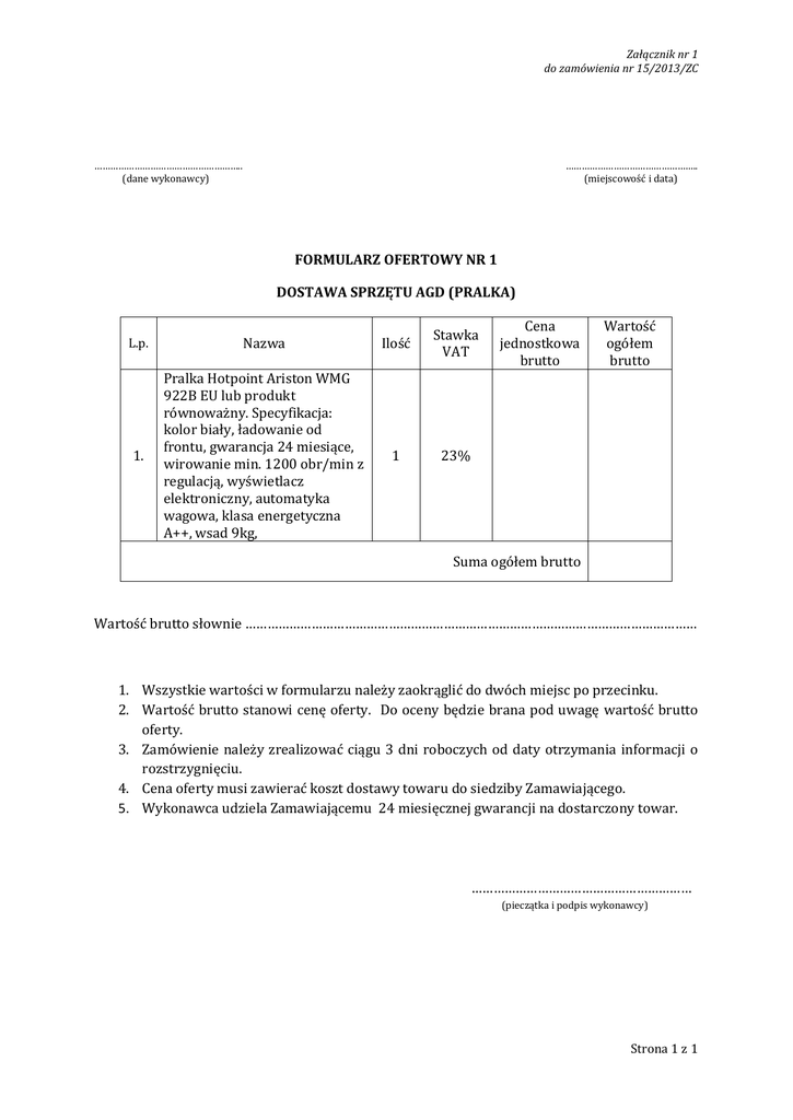 Załącznik nr 1 do zamówienia nr 15/2013/ZC ……………………………………………….. (dane wykonawcy) ………………………………………….. (miejscowość i data) FORMULARZ OFERTOWY NR 1 DOSTAWA SPRZĘTU AGD (PRALKA) L.p. Nazwa Ilość Stawka VAT 1. Pralka Hotpoint Ariston WMG 922B EU lub produkt równoważny. Specyfikacja: kolor biały, ładowanie od frontu, gwarancja 24 miesiące, wirowanie min. 1200 obr/min z regulacją, wyświetlacz elektroniczny, automatyka wagowa, klasa energetyczna A++, wsad 9kg, 1 23% Cena jednostkowa brutto Wartość ogółem brutto Suma ogółem brutto Wartość brutto słownie …………………………………………………………………………………………………………… 1. Wszystkie wartości w formularzu należy zaokrąglić do dwóch miejsc po przecinku. 2. Wartość brutto stanowi cenę oferty. Do oceny będzie brana pod uwagę wartość brutto oferty. 3. Zamówienie należy zrealizować ciągu 3 dni roboczych od daty otrzymania informacji o rozstrzygnięciu. 4. Cena oferty musi zawierać koszt dostawy towaru do siedziby Zamawiającego. 5. Wykonawca udziela Zamawiającemu 24 miesięcznej gwarancji na dostarczony towar. …………………………………………………… (pieczątka i podpis wykonawcy) Strona 1 z 1