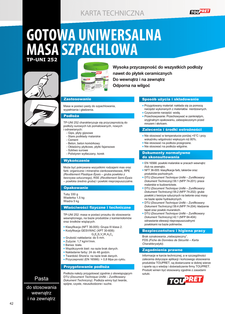 KARTA TECHNICZNA GOTOWA UNIWERSALNA MASA SZPACHLOWA TP-UNI 252 Wysoka przyczepność do wszystkich podłoży nawet do płytek ceramicznych Do wewnątrz i na zewnątrz Odporna na wilgoć Zastosowanie Sposób użycia i składowanie Masa w postaci pasty do szpachlowania, wypełniania i gładzenia. ■ Podłoża TP-UNI 252 charakteryzuje się przyczepnością do podłoży surowych lub pomalowanych, nowych i odnawianych: - Gips, płyty gipsowe - Stare podkłady malarskie - Cement - Beton, beton komórkowy - Okładziny płytkowe, płytki fajansowe - Szkliwo surowe - Polistyren wytłaczany, korek Wykończenie Może być pokrywana wszystkimi rodzajami mas oraz farb: organiczne i mineralne cienkowarstwowe, RPE (Revêtement Plastique Épais – gruba powłoka z tworzywa sztucznego), RSE (Revêtement Semi-Épais – powłoka średnio gruba) i powłoki nieprzepuszczalne. Opakowanie Tuby 330 g Wiaderka 1,5 kg Wiadra 5 kg Właściwości fizyczne i techniczne TP-UNI 252: masa w postaci proszku do stosowania wewnętrznego, na bazie produktów z kamieniołomów oraz środków wiążących. Klasyfikacja (NFT 36-005): Grupa III klasa 2. Kodyfikacja GESVWAC (XPT 30-608): G3E5S1V2W1A0C0 ■ Grubość nakładania: do 5 mm. ■ Zużycie: 1,7 kg/m2/mm. ■ Barwa: biała. ■ Współczynnik bieli: na razie brak danych. ■ Nakładanie farby: 24 do 48 godzin. ■ Twardość Shore'a: na razie brak danych. ■ Przyczepność (EN 16566): > 0,8 Mpa po cyklu. ■ ■ Przygotowanie podłoża Pasta 42 do stosowania wewnątrz i na zewnątrz Podłoża należy przygotować zgodnie z obowiązującym DTU (Document Technique Unifié – Zunifikowany Dokument Techniczny). Podłoża winny być twarde, spójne, czyste, nieuszkodzone i suche. Przygotowany materiał: nakłada się za pomocą narzędzi wykonanych z materiałów nierdzewnych. ■ Czyszczenie narzędzi: wodą. ■ Przechowywanie: Przechowywać w zamkniętym, oryginalnym opakowaniu, zabezpieczonym przed mrozem i słońcem. Zalecenia i środki ostrożności Nie stosować w temperaturze poniżej +5°C i przy wskaźniku wilgotności większym niż 80%. ■ Nie stosować na podłoża przegrzane. ■ Nie stosować na podłoża wilgotne. ■ Dokumenty normatywne do skonsultowania EN 16566: powłoki malarskie w pracach wewnątrz i/lub na zewnątrz. ■ NFT 36-005: klasyfikacja farb, lakierów oraz produktów pochodnych. ■ DTU (Document Technique Unifié – Zunifikowany Dokument Techniczny) 59.1 (NFP 74-201): prace malarskie w budownictwie. ■ DTU (Document Technique Unifié – Zunifikowany Dokument Techniczny) 59.2 (NFP 74-202): grube powłoki z tworzyw sztucznych na betonie oraz masy na bazie spoiw hydraulicznych. ■ DTU (Document Technique Unifié – Zunifikowany Dokument Techniczny) 59.4 (NFP 74-204): kładzenie tapet oraz powłok murarskich. ■ DTU (Document Technique Unifié – Zunifikowany Dokument Techniczny) 42.1 (NFP 84-404): odnawianie elewacji nieprzepuszczalnymi powłokami na bazie polimerów. ■ Bezpieczeństwo i higiena pracy Brak oznakowania „niebezpieczny”. FDS (Fiche de Données de Sécurité – Karta Charakterystyki). Zagadnienia prawne Informacje w karcie technicznej, a w szczególności zalecenia dotyczące aplikacji i końcowego stosowania produktów TOUPRET, są dostarczane w dobrej wierze i oparte są o wiedzę i doświadczenie firmy TOUPRET. Produkt winien być stosowany zgodnie z zasadami sztuki. TOUPRET POLSKA Sp. z o.o. ul. Przemysłowa 18, 62-069 Zakrzewo k/Poznania, [email protected], tel. 61 670 68 68