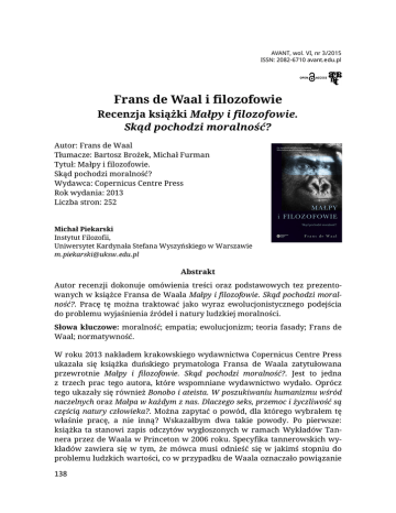 www.avant.edu.pl/en AVANT, wol. VI, nr 3/2015 ISSN: 2082-6710 avant.edu.pl Frans de Waal i filozofowie Recenzja książki Małpy i filozofowie. Skąd pochodzi moralność? Autor: Frans de Waal Tłumacze: Bartosz Brożek, Michał Furman Tytuł: Małpy i filozofowie. Skąd pochodzi moralność? Wydawca: Copernicus Centre Press Rok wydania: 2013 Liczba stron: 252 Michał Piekarski Instytut Filozofii, Uniwersytet Kardynała Stefana Wyszyńskiego w Warszawie [email protected] .pl Abstrakt Autor recenzji dokonuje omówienia treści oraz podstawowych tez prezentowanych w książce Fransa de Waala Małpy i filozofowie. Skąd pochodzi moralność?. Pracę tę można traktować jako wyraz ewolucjonistycznego podejścia do problemu wyjaśnienia źródeł i natury ludzkiej moralności. Słowa kluczowe: moralność; empatia; ewolucjonizm; teoria fasady; Frans de Waal; normatywność. W roku 2013 nakładem krakowskiego wydawnictwa Copernicus Centre Press ukazała się książka duńskiego prymatologa Fransa de Waala zatytułowana przewrotnie Małpy i filozofowie. Skąd pochodzi moralność?. Jest to jedna z trzech prac tego autora, które wspomniane wydawnictwo wydało. Oprócz tego ukazały się również Bonobo i ateista. W poszukiwaniu humanizmu wśród naczelnych oraz Małpa w każdym z nas. Dlaczego seks, przemoc i życzliwość są częścią natury człowieka?. Można zapytać o powód, dla którego wybrałem tę właśnie pracę, a nie inną? Wskazałbym dwa takie powody. Po pierwsze: książka ta stanowi zapis odczytów wygłoszonych w ramach Wykładów Tannera przez de Waala w Princeton w 2006 roku. Specyfika tannerowskich wykładów zawiera się w tym, że mówca musi odnieść się w jakimś stopniu do problemu ludzkich wartości, co w przypadku de Waala oznaczało powiązanie 138 AVANT Vol. VI, No. 2-3/2015 prymatologicznych badań z typowo filozoficznym zagadnieniem natury moralności. Taka perspektywa czyni jego rozważania filozoficznie jeszcze bardziej atrakcyjnymi. Wykłady te jednocześnie stanowią podsumowanie wieloletnich badań autora. Drugi powód jest ściśle powiązany z pierwszym. Wraz z zapisem wykładów de Waala czytelnik otrzymuje komentarze, jakie sformułowali wobec odczytów Peter Singer, Christine M. Korsgaard, Robert Wright i Philip Kitcher. Książka kończy się zwięzłą odpowiedzią autora na powyższe polemiki. Polemiki oraz odpowiedź de Waala znacznie wzbogacają treść pracy, potęgując tym samym przyjemność z jej lektury. Omawiana książka składa się z trzech części. Pierwsza zatytułowana Ewolucja moralności zawiera wykłady de Waala. Druga to Komentarze. Trzecia zaś to Odpowiedź na komentarze. Całość poprzedzona jest notką Od tłumaczy oraz pochodzącym z oryginalnego wydania Wprowadzeniem pióra Josiah Obera i Stephena Macedo. Książka kończy się Bibliografią oraz Indeksem. Podstawowym założeniem podzielanym zarówno przez autora książki, jak i przez jego komentatorów jest przekonanie o ewolucyjnym charakterze ludzkiej moralności. Przekonanie to jest wzmocnione poglądem, według którego dobro moralne jest czymś realnym, o czym można formułować sensowne sądy i wiąże się ono ściśle z właściwym ujmowanie potrzeb innych. Rozważania de Waala dobrze ilustruje uwaga: „Dobór naturalny ma potencjał do wytwarzania niezwykłego wachlarza organizmów, od najbardziej aspołecznych i nastawionych na konkurowanie, do najbardziej życzliwych i grzecznych. Proces ten nie wyznaczył naszych reguł moralnych i wartości, ale wyposażył nas w mechanizmy psychiczne, tendencje i zdolności pozwalające stworzyć kompas wyborów życiowych, który uwzględnia interesy całej wspólnoty – a to jest istota ludzkiej moralności” (84)55. Trudno się z tym przekonaniem nie zgodzić, jednak – co będę starał się wykazać – wyjaśnienie ewolucyjne w żaden sposób nie tłumaczy i nie może wytłumaczyć specyfiki ludzkiej moralności z bardzo prostego powodu. Mianowicie: opis empiryczny nie ma charakteru normatywnego, co oznacza, że nie może zdać sprawy z normatywnych elementów i warunków doświadczenia. Co to dokładnie znaczy, postaram się wyjaśnić dalej. De Waal rozpoczyna budowę swojego projektu od krytyki tak zwanej teorii fasady, według której ludzie są z natury źli, co w tym przypadku oznacza, że nie dostrzegają potrzeb innych. W takim ujęciu trudno wyjaśnić fakt, że czasem – co wiemy z codziennej obserwacji – potrafią się traktować dobrze i właściwie. Teoria fasady tłumaczy to z właściwą sobie prostotą. Dzieje się tak, ponieważ pojawia się moralność, która jest efektem „trzymania natury w ryzach” (30) wymuszonym przez kulturę i społeczeństwo. Z takiego punktu widzenia moralność nie jest jednak niczym więcej niż epifenomenem. Stanowi 55 W nawiasach podaję numery stron omawianej pozycji. 139 www.avant.edu.pl/en ona bowiem tylko sztuczną fasadę, otaczając „prawdziwą” ludzką naturę, która jest amoralna lub nawet niemoralna. Istnieje ona zatem poza naturą. Za twórcę teorii fasady de Waal uznał ucznia Darwina – Thomasa H. Huxley’a. Huxley miał twierdzić, że ludzka etyka to „dowód zwycięstwa nad krnąbrnymi, wrednymi procesami ewolucji” (30). Teoria fasady, podkreśla de Waal, stanowi znaczne przeinaczenie oryginalnej teorii Darwina, który miał włączyć moralność w obręb ludzkiej natury. Za współczesnych przedstawicieli teorii fasady de Waal chciałby uznać między innymi R. Dawkinsa, G. C. Wiliamsa, M. Ghiselina czy R. Wrighta. Pomijając powody, dla których powyżsi autorzy znaleźli się w wśród zwolenników tej teorii, większy niepokój budzi ona sama. Jak jednogłośnie podkreślają wszyscy komentatorzy, de Waal raczej konstruuje teorię fasady na potrzeby własnej argumentacji niż ją faktycznie znajduje u krytykowanych autorów. Jak sugestywnie pokazują Bartosz Brożek i Michał Furman, „nawet jeśli da się wskazać zwol