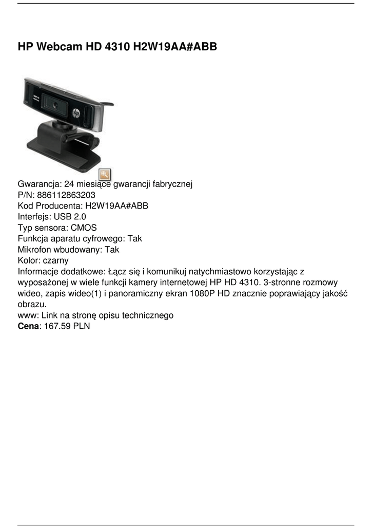 HP Webcam HD 4310 H2W19AA#ABB Gwarancja: 24 miesiące gwarancji fabrycznej P/N: 886112863203 Kod Producenta: H2W19AA#ABB Interfejs: USB 2.0 Typ sensora: CMOS Funkcja aparatu cyfrowego: Tak Mikrofon wbudowany: Tak Kolor: czarny Informacje dodatkowe: Łącz się i komunikuj natychmiastowo korzystając z wyposażonej w wiele funkcji kamery internetowej HP HD 4310. 3-stronne rozmowy wideo, zapis wideo(1) i panoramiczny ekran 1080P HD znacznie poprawiający jakość obrazu. www: Link na stronę opisu technicznego Cena: 167.59 PLN Powered by TCPDF (www.tcpdf.org)