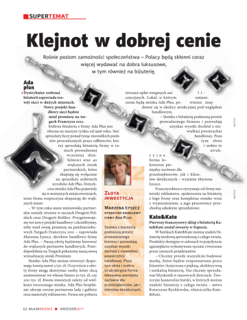 supertemat Klejnot w dobrej cenie Rośnie poziom zamożności społeczeństwa – Polacy będą skłonni coraz więcej wydawać na dobra luksusowe, w tym również na biżuterię. �� snbiznes ■ zesie����� ADA PLUS również opłat wstępnych ani Dystrybutor srebrnej l i cencyjnych. Lokal, w którym biżuterii zapowiada rozumieszwój sieci w dużych miastach. czone będą stoiska Ada Plus, powinien znajNowy projekt handować się w okolicy atrakcyjnej pod względem dlowy sieci będzie handlowym. – Stoiska z biżuterią podnoszą prestiż miał premierę na targach Franczyza 2011. prowadzonego biznesu i pozwalają Srebrna biżuteria z firmy Ada Plus jest uzyskać wysoki dochód z nieobecna na naszym rynku od 1996 roku. Sieć wielkiej powierzchni sprzedaży liczy ponad tysiąc niewielkich punkhandlowej. Poza tów prowadzonych przez odbiorców, któtym złoto i srebro to rzy sprzedają biżuterię firmy w raat ra kmach prowadzonej c y j n a wcześniej dziaforma lołalności oraz 40 kowania piewiększych stoisk partnerskich, które niędzy zarówno dla skupiają się wyłącznie przedsiębiorców, jak i klienna sprzedaży srebrnych tów detalicznych – wyjaśnia Marzena wyrobów Ady Plus. DotychŁyszcz. czas stoiska Ada Plus pojawiały Franczyzobiorca otrzymuje od firmy masię w mniejszych miejscowościach, Złota teriały reklamowe, opakowania na biżuterię inwestycja teraz firma rozpoczyna ekspansję do więkz logo firmy oraz kompletne stoisko wraz z wyposażeniem, a jego pracownicy przeszych miast. – W tym roku nasze ministoiska partnerMarzena Łyszcz chodzą szkolenie sprzedażowe. skie zostały otwarte w sieciach Drogerii Poldyrektor handlowy firmy Ada Plus skich oraz Drogerii Koliber. PrzygotowujeKate&Kate my też nowy projekt handlowy i chcielibyśmy, Pierwszy franczyzowy sklep z biżuterią Każeby miał swoją premierę na październikoStoiska z biżuterią te&Kate został otwarty w Sopocie. wych Targach Franczyza 2011 – zapowiada W butikach Kate&Kate można znaleźć bipodnoszą prestiż Marzena Łyszcz, dyrektor handlowy firmy żuterię modową sprowadzaną z całego świata. prowadzonego Ada Plus. – Naszą ofertę będziemy kierować Produkty dostępne w salonach to pojedyncze biznesu i pozwalają do większych partnerów handlowych. Prawegzemplarze wykonywane ręcznie i tworzone uzyskać wysoki dopodobnie na Targach pokażemy naszą nową przez znanych projektantów. dochód z niewielkiej – Chcemy przede wszystkim budować wizualizację stoisk Premium. powierzchni Stoisko Ada Plus można otworzyć dyspomarkę, która będzie rozpoznawana przez handlowej. Poza nując kwotą nawet 5 tys. zł. Oczywiście z oferklientów i kojarzona z piękną, ekskluzywną tym złoto i srebro ty firmy mogą skorzystać osoby, które chcą i unikalną biżuterią. Nie chcemy sprzedato atrakcyjna forma zainwestować we własny biznes 50 tys. zł, czy wać błyskotek w masowych ilościach. Twolokowania pieniędzy 200 tys. zł. Kwota inwestycji zależy od wielrzymy kameralne butiki, w których można zarówno dla kości tworzonego stoiska. Ada Plus bezpłatznaleźć biżuterię z całego świata – mówi przedsiębiorców, jak i nie oferuje swoim partnerom lady i gabloty Katarzyna Rychlewska, właścicielka Kateklientów detalicznych. &Kate. oraz materiały reklamowe. Firma nie pobiera ADA PLUS Ada plus YES sklepyjubilerskie Sklepy z logo Kate&Kate działają w Warszawie, Krakowie i Katowicach. W lipcu tego roku w Sopocie został otwarty pierwszy butik, prowadzony przez franczyzobiorcę. Biżuterię Kate&Kate można też nabyć w czterech butikach partnerskich. – Biżuterii Kate&Kate nie mogło zabraknąć w tak prestiżowym kurorcie, jakim jest Sopot. Nowe otwarcie cieszy mnie tym bardziej, iż jest to pierwszy lokal franczyzowy. Kate&Kate właśnie nad morzem nabiera wiatru w żagle – dodaje Rychlewska. Na zatowarowanie i urządzenie sklepu trzeba przeznaczyć od 80 do 100 tys. zł. W pierwszym roku działalności firma nie pobiera od swoich partnerów opłaty franczyzowej. Butiki Kate&Kate powstają w kameralnym otoczeniu, a franczyzobiorcy samodzielnie szukają odpowiedniej lokalizacji. Partnerzy mogą liczyć na pakiet materiałów marketingowych – opakowania, ulotki, certyfikaty. Yes Firma Yes Biżuteria, rozwijająca sieć sklepów jubilerskich Yes, obchodzi swoje 30. urodziny. Sklepy Jubilerskie Yes to sieć sprzedaży stworzona i rozwijana przez spółkę Yes Biżuteria. W tym roku firma obchodzi jubileusz 30-lecia istnienia. Sieć sprzedaży Yes liczy blisko sto placówek franczyzowych, które działają w centrach handlowych całego kraju. Do końca roku nowe sklepy mają zostać otwarte w Szczecinie, Kaliszu, Ostrowie Wlkp., Toruniu i Gdyni. Nienasycony jak Polak Paweł Korobacz dyrektor działu ekspansji i organizacji sieci detalicznej Yes Polski rynek dóbr luksusowych jest jeszcze młody; jesteśmy stosunkowo mało „nasyconym” społeczeństwem. Statystyczny Polak wydaje na biżuterię kilkakrotnie mniej niż mieszkaniec Europy Zachodniej. Dlatego jesteśmy bardzo perspektywicznym rynkiem i popyt na wyroby jubilerskie na pewno będzie u nas sukcesywnie wzrastał. – Od wielu lat z sukcesem stosujemy strategię stabilnego rozwoju, budując sieć naszej sprzedaży detalicznej w oparciu o franczyzę. Podobnie jak w ubiegłych latach, w przyszłym roku planujemy otworzyć 12 nowych sklepów Yes. Chcemy, aby nasze placówki pojawiły się m.in. w Chełmie, Krakowie, Opolu, Wrocławiu i Kielcach – wylicza Paweł Korobacz, dyrektor działu ekspansji i organizacji sieci detalicznej Yes. Biżuterię Yes można znaleźć w galeriach handlowych miast liczących więcej niż 100 tys. mieszkańców. Markowej sieci sprzedaży z dużym doświadczeniem na rynku łatwiej jest pozyskać atrakcyjne miejsce w centrum handlowym i negocjować warunki umowy. Dlatego franczyzobiorca nie musi na własną rękę poszukiwać odpowiedniego lokalu, bo w tej kwestii wyręcza g
