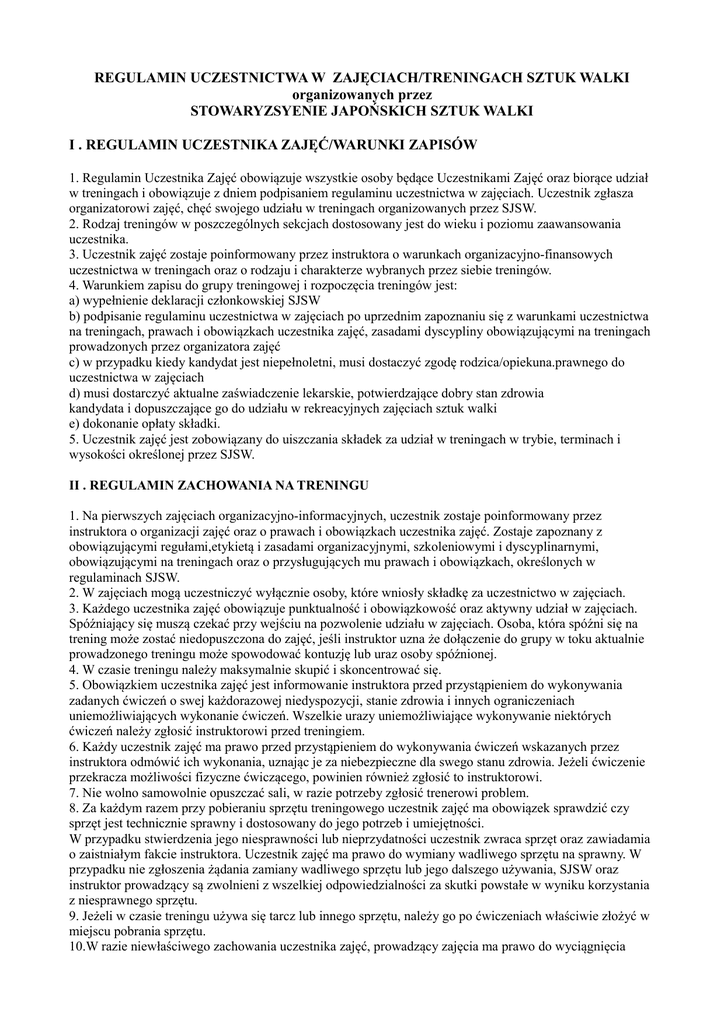 REGULAMIN UCZESTNICTWA W ZAJĘCIACH/TRENINGACH SZTUK WALKI organizowanych przez STOWARYZSYENIE JAPOŃSKICH SZTUK WALKI I . REGULAMIN UCZESTNIKA ZAJĘĆ/WARUNKI ZAPISÓW 1. Regulamin Uczestnika Zajęć obowiązuje wszystkie osoby będące Uczestnikami Zajęć oraz biorące udział w treningach i obowiązuje z dniem podpisaniem regulaminu uczestnictwa w zajęciach. Uczestnik zgłasza organizatorowi zajęć, chęć swojego udziału w treningach organizowanych przez SJSW. 2. Rodzaj treningów w poszczególnych sekcjach dostosowany jest do wieku i poziomu zaawansowania uczestnika. 3. Uczestnik zajęć zostaje poinformowany przez instruktora o warunkach organizacyjno-finansowych uczestnictwa w treningach oraz o rodzaju i charakterze wybranych przez siebie treningów. 4. Warunkiem zapisu do grupy treningowej i rozpoczęcia treningów jest: a) wypełnienie deklaracji członkowskiej SJSW b) podpisanie regulaminu uczestnictwa w zajęciach po uprzednim zapoznaniu się z warunkami uczestnictwa na treningach, prawach i obowiązkach uczestnika zajęć, zasadami dyscypliny obowiązującymi na treningach prowadzonych przez organizatora zajęć c) w przypadku kiedy kandydat jest niepełnoletni, musi dostaczyć zgodę rodzica/opiekuna.prawnego do uczestnictwa w zajęciach d) musi dostarczyć aktualne zaświadczenie lekarskie, potwierdzające dobry stan zdrowia kandydata i dopuszczające go do udziału w rekreacyjnych zajęciach sztuk walki e) dokonanie opłaty składki. 5. Uczestnik zajęć jest zobowiązany do uiszczania składek za udział w treningach w trybie, terminach i wysokości określonej przez SJSW. II . REGULAMIN ZACHOWANIA NA TRENINGU 1. Na pierwszych zajęciach organizacyjno-informacyjnych, uczestnik zostaje poinformowany przez instruktora o organizacji zajęć oraz o prawach i obowiązkach uczestnika zajęć. Zostaje zapoznany z obowiązującymi regułami,etykietą i zasadami organizacyjnymi, szkoleniowymi i dyscyplinarnymi, obowiązującymi na treningach oraz o przysługujących mu prawach i obowiązkach, określonych w regulaminach SJSW. 2. W zajęciach mogą uczestniczyć wyłącznie osoby, które wniosły składkę za uczestnictwo w zajęciach. 3. Każdego uczestnika zajęć obowiązuje punktualność i obowiązkowość oraz aktywny udział w zajęciach. Spóźniający się muszą czekać przy wejściu na pozwolenie udziału w zajęciach. Osoba, która spóźni się na trening może zostać niedopuszczona do zajęć, jeśli instruktor uzna że dołączenie do grupy w toku aktualnie prowadzonego treningu może spowodować kontuzję lub uraz osoby spóźnionej. 4. W czasie treningu należy maksymalnie skupić i skoncentrować się. 5. Obowiązkiem uczestnika zajęć jest informowanie instruktora przed przystąpieniem do wykonywania zadanych ćwiczeń o swej każdorazowej niedyspozycji, stanie zdrowia i innych ograniczeniach uniemożliwiających wykonanie ćwiczeń. Wszelkie urazy uniemożliwiające wykonywanie niektórych ćwiczeń należy zgłosić instruktorowi przed treningiem. 6. Każdy uczestnik zajęć ma prawo przed przystąpieniem do wykonywania ćwiczeń wskazanych przez instruktora odmówić ich wykonania, uznając je za niebezpieczne dla swego stanu zdrowia. Jeżeli ćwiczenie przekracza możliwości fizyczne ćwiczącego, powinien również zgłosić to instruktorowi. 7. Nie wolno samowolnie opuszczać sali, w razie potrzeby zgłosić trenerowi problem. 8. Za każdym razem przy pobieraniu sprzętu treningowego uczestnik zajęć ma obowiązek sprawdzić czy sprzęt jest technicznie sprawny i dostosowany do jego potrzeb i umiejętności. W przypadku stwierdzenia jego niesprawności lub nieprzydatności uczestnik zwraca sprzęt oraz zawiadamia o zaistniałym fakcie instruktora. Uczestnik zajęć ma prawo do wymiany wadliwego sprzętu na sprawny. W przypadku nie zgłoszenia żądania zamiany wadliwego sprzętu lub jego dalszego używania, SJSW oraz instruktor prowadzący są zwolnieni z wszelkiej odpowiedzialności za skutki powstałe w wyniku korzystania z niesprawnego sprzętu. 9. Jeżeli w czasie treningu używa się tarcz lub innego sprzętu, należy go po ćwiczeniach właściwie złożyć w miejscu pobrania sprzętu. 10.W razie niewłaściwego zachowania uczestnika zajęć, prowadzący zajęcia ma prawo do wyciągnięcia wobec niego konsekwencji aż do usunięcia z zajęć włącznie. W takim przypadku nie przysługuje uczestnikowi zajęć zwrot kosztów. 11. Zabrania się uczestnictwa w zajęciach po spożyciu jakiejkolwiek dawki alkoholu lub innych środków odurzających oraz w przypadku złego samopoczucia. 12. Nie wolno w trakcie treningu spożywać pokarmów, dozwolone jest picie płynów. 13. Nie wolno bez zgody instruktora wykonywać żadnych ćwiczeń na sali 14. W czasie treningów obowiązuje bezwzględny zakaz noszenia wszelkiej biżuterii, zegarków oraz innych ozdób mogących stanowić zagrożenie dla zdrowia któregokolwiek z ćwiczących. Paznokcie rąk i stóp powinny byc obcięte. 15. SJSW oraz instruktor prowadzący zajęcia nie ponoszą odpowiedzialności za wypadki zaistniałe w czasie trwania ćwiczeń, wynikające ze złego stanu zdrowia oraz niestosowania się do poleceń instruktora lub korzystania z wadliwego sprzętu oraz będące wynikiem nie stosowania się do programu i zaleceń instruktora, oraz wykonywania ćwiczeń samodzielnie podczas nieobecności i bez nadzoru instruktora. 16. Uczestnika zajęć obowiązuje dbałość o porządek i dobry stan urządzeń, udostępnianego sprzętu sportowego oraz miejsca treningowego. Za wszelkie szkody powstałe z winy uczestnika zajęć ponosi on odpowiedzialność finansową, a w przypadku osób niepełnoletnich jego rodzice lub opiekun prawny. 17.SJSW nie ponosi odpowiedzialności za rzeczy pozostawione, uszkodzone lub zgubione w szatni lub innych pomieszczeniach i salach sportowych. Przedmioty wartościowe ćwiczący może oddać prowadzącemu w depozyt. 18. W przypadku odniesienia urazu, kontuzji lub 