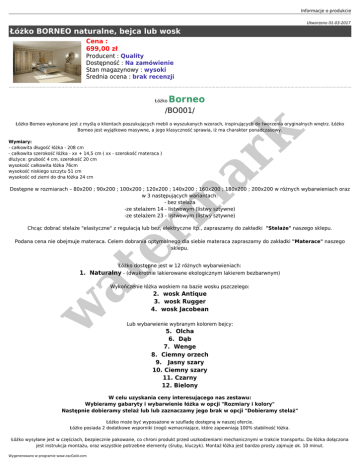 Informacje o produkcie Utworzono 01-03-2017 Łóżko BORNEO naturalne, bejca lub wosk Cena : 699,00 zł Producent : Quality Dostępność : Na zamówienie Stan magazynowy : wysoki Średnia ocena : brak recenzji Łóżko Borneo /BO001/ er m ar k Łóżko Borneo wykonane jest z myślą o klientach poszukujących mebli o wyszukanych wzorach, inspirujących do tworzenia oryginalnych wnętrz. Łóżko Borneo jest wyjątkowo masywne, a jego klasyczność sprawia, iż ma charakter ponadczasowy. Wymiary: - całkowita długość łóżka - 208 cm - całkowita szerokość łóżka - xx + 14,5 cm ( xx - szerokość materaca ) dłużyce: grubość 4 cm, szerokość 20 cm wysokość całkowita łóżka 76cm wysokość niskiego szczytu 51 cm wysokość od ziemi do dna łóżka 24 cm Dostępne w rozmiarach – 80x200 ; 90x200 ; 100x200 ; 120x200 ; 140x200 ; 160x200 ; 180x200 ; 200x200 w różnych wybarwieniach oraz w 3 następujących wariantach: - bez stelaża -ze stelażem 14 - listwowym (listwy sztywne) -ze stelażem 23 - listwowym (listwy sztywne) Chcąc dobrać stelaże "elastyczne" z regulacją lub bez, elektryczne itp., zapraszamy do zakładki "Stelaże" naszego sklepu. Podana cena nie obejmuje materaca. Celem dobrania optymalnego dla siebie materaca zapraszamy do zakładki "Materace" naszego sklepu. at Łóżko dostępne jest w 12 różnych wybarwieniach: 1. Naturalny - (dwukrotnie lakierowane ekologicznym lakierem bezbarwnym) w Wykończenie łóżka woskiem na bazie wosku pszczelego: 2. wosk Antique 3. wosk Rugger 4. wosk Jacobean Lub wybarwienie wybranym kolorem bejcy: 5. Olcha 6. Dąb 7. Wenge 8. Ciemny orzech 9. Jasny szary 10. Ciemny szary 11. Czarny 12. Bielony W celu uzyskania ceny interesującego nas zestawu: Wybieramy gabaryty i wybarwienie łóżka w opcji "Rozmiary i kolory" Następnie dobieramy stelaż lub lub zaznaczamy jego brak w opcji "Dobieramy stelaż" Łóżko może być wyposażone w szufladę dostępną w naszej ofercie. Łóżko posiada 2 dodatkowe wsporniki (nogi) wzmacniające, które zapewniają 100% stabilność łóżka. Łóżko wysyłane jest w częściach, bezpiecznie pakowane, co chroni produkt przed uszkodzeniami mechanicznymi w trakcie transportu. Do łóżka dołączona jest instrukcja montażu, oraz wszystkie potrzebne elementy (śruby, kluczyk). Montaż łóżka jest bardzo prosty zajmuje ok. 10 minut. Wygenerowano w programie www.oscGold.com Do ceny należy doliczyć koszt transportu 55 zł (do rozmiaru 100x200 włącznie), lub 90 zł (powyżej rozmiaru 100x200). TERMIN REALIZACJI ZAMÓWIENIA TO 3 - 4 TYGODNIE. PRZY ZAMÓWIENIU PROSZĘ PODAĆ: - WYBRANY ROZMIAR ŁÓŻKA - WYBRANY KOLOR ŁÓŻKA - WYBRANY WARIANT - BEZ STELAŻA, STELAŻ 14-LISTWOWY LUB 23-LISTWOWY Dostępne opcje Łóżko BORNEO naturalne, bejca lub wosk » Wybieramy rozmiar i kolor: 80x200 kolory od 1. do 12., 90x200 kolory od 1. do 12. (+37,00 zł), 100x200 kolory od 1. do 12. w at er m ar k (+156,00 zł), 120x200 kolory od 1. do 12. (+434,00 zł), 140x200 kolory od 1. do 12. (+506,00 zł), 160x200 kolory od 1. do 12. (+747,00 zł), 180x200 kolory od 1. do 12. (+988,00 zł), 200x200 kolory od 1. do 12. (+1.229,00 zł). » Dobieramy stelaż: Bez stelaża, 80x200 stel. 14-list. (+41,00 zł), 80x200 stel. 23-list. (+74,00 zł), 90x200 stel. 14-list. (+47,00 zł), 90x200 stel. 23-list. (+76,00 zł), 100x200 stel. 14-list. (+53,00 zł), 100x200 stel. 23-list. (+86,00 zł), 120x200 stel. 14-list. (+62,00 zł), 120x200 stel. 23-list. (+102,00 zł), 140x200 stel. 14-list. (+74,00 zł), 140x200 stel. 23-list. (+120,00 zł), 160x200 stel. 14-list. (+84,00 zł), 160x200 stel. 23-list. (+138,00 zł), 180x200 stel. 14-list. (+95,00 zł), 180x200 stel. 23-list. (+153,00 zł), 200x200 stel. 14-list. (+105,00 zł), 200x200 stel. 23-list. (+170,00 zł). » Dostępne kolory: 1. Naturalny, 2. wosk Antique, 3. wosk Rugger, 4. wosk Jacobean, 5. Olcha, 6. Dąb, 7. Wenge, 8. Ciemny orzech, 9. Jasny szary, 10. Ciemny szary, 11. Czarny, 12. Bielony.