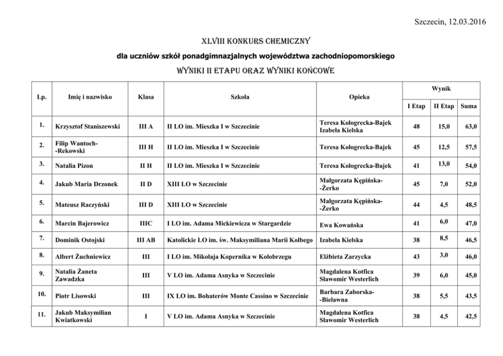 Szczecin, 12.03.2016 XLVIII Konkurs chemiczny dla uczniów szkół ponadgimnazjalnych województwa zachodniopomorskiego WYNIKI II ETAPU ORAZ WYNIKI KoŃcowe Wynik Lp. Imię i nazwisko Szkoła Klasa Opieka I Etap II Etap Suma 1. Krzysztof Staniszewski III A II LO im. Mieszka I w Szczecinie Teresa Kołogrecka-Bajek Izabela Kielska 48 15,0 63,0 2. Filip Wantoch-Rekowski III H II LO im. Mieszka I w Szczecinie Teresa Kołogrecka-Bajek 45 12,5 57,5 3. Natalia Pizon II H II LO im. Mieszka I w Szczecinie Teresa Kołogrecka-Bajek 41 13,0 54,0 4. Jakub Maria Drzonek II D XIII LO w Szczecinie Małgorzata Kępińska-Żerko 45 7,0 52,0 5. Mateusz Raczyński III D XIII LO w Szczecinie Małgorzata Kępińska-Żerko 44 4,5 48,5 6. Marcin Bajerowicz IIIC I LO im. Adama Mickiewicza w Stargardzie Ewa Kowańska 41 6,0 47,0 7. Dominik Ostojski Katolickie LO im. św. Maksymiliana Marii Kolbego Izabela Kielska 38 8,5 46,5 8. Albert Żuchniewicz III I LO im. Mikołaja Kopernika w Kołobrzegu Elżbieta Zarzycka 43 3,0 46,0 9. Natalia Żaneta Zawadzka III V LO im. Adama Asnyka w Szczecinie Magdalena Kotfica Sławomir Westerlich 39 6,0 45,0 10. Piotr Lisowski III IX LO im. Bohaterów Monte Cassino w Szczecinie Barbara Zaborska-Bielawna 38 5,5 43,5 11. Jakub Maksymilian Kwiatkowski V LO im. Adama Asnyka w Szczecinie Magdalena Kotfica Sławomir Westerlich 38 4,5 42,5 III AB I LISTA LAUREATÓW: Imię i nazwisko Szkoła Klasa Opieka Suma Krzysztof Staniszewski II LO im. Mieszka I w Szczecinie III A Teresa Kołogrecka-Bajek Izabela Kielska 63,0 Filip Wantoch-Rekowski II LO im. Mieszka I w Szczecinie III H Teresa Kołogrecka-Bajek 57,5 Natalia Pizon II LO im. Mieszka I w Szczecinie II H Teresa Kołogrecka-Bajek 54,0 Jakub Maria Drzonek XIII LO w Szczecinie II D Małgorzata Kępińska-Żerko 52,0 WYRÓŻNIENIA: Szkoła Imię i nazwisko Klasa Opieka Suma Mateusz Raczyński XIII LO w Szczecinie III D Małgorzata Kępińska-Żerko 48,5 Marcin Bajerowicz I LO im. Adama Mickiewicza w Stargardzie IIIC Ewa Kowańska 47,0 LAUREACI KLASYFIKACJI DRUŻYNOWEJ: Szkoła Opieka Suma uzyskanych punktów I miejsce II LO im. Mieszka I w Szczecinie Teresa Kołogrecka-Bajek Izabela Kielska 174,5 II miejsce XIII LO w Szczecinie Małgorzta Kępińska-Żerko 137,5 III miejsce V LO im. Adama Asnyka w Szczecinie Magdalena Kotfica Sławomir Westerlich 122,5 Lokata Wiedza nie jest wcale dziedzictwem, które się otrzymuje, to całkiem nowy nabytek, po który sięgać trzeba… Bernard Fontenelle W imieniu organizatorów oraz członków komisji dziękujemy wszystkim uczestnikom za w tegorocznym oraz serdeczne gratulacje. Organizatorzy konkursu składają szczególne podziękowania wszystkim opiekunom: i rodzicom za motywację, trud, wysiłek, pasję oraz czas poświęcony przy przygotowywaniu do w niełatwym konkursie wiedzy. Podziękowania składamy również tym uczniom, którzy sumiennie i rzetelnie starali się pogłębiać wiedzę, ale z różnych powodów tym razem nie osiągnęli oczekiwanego wyniku. Życzymy wielu sukcesów w szkole i innych konkursach oraz zapraszamy w przyszłym roku. dr Anna Szady-Chełmieniecka Przewodnicząca XLVIII Konkursu Chemicznego