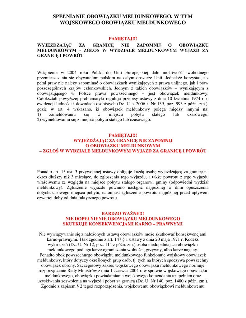 SPEŁNIANIE OBOWIĄZKU MELDUNKOWEGO, W TYM WOJSKOWEGO OBOWIĄZKU MELDUNKOWEGO PAMIĘTAJ!!! WYJEŻDŻAJĄC ZA GRANICĘ NIE ZAPOMNIJ O OBOWIĄZKU MELDUNKOWYM - ZGŁOŚ W WYDZIALE MELDUNKOWYM WYJAZD ZA GRANICĘ I POWRÓT Wstąpienie w 2004 roku Polski do Unii Europejskiej dało możliwość swobodnego przemieszczania się obywatelom polskim na całym obszarze Unii. Jednakże korzystając z pełni praw nie należy zapominać o obowiązkach wynikających z prawa unijnego, jak i praw poszczególnych krajów członkowskich. Jednym z takich obowiązków – wynikającym z obowiązującego w Polsce prawa powszechnego – jest obowiązek meldunkowy. Całokształt powyższej problematyki regulują przepisy ustawy z dnia 10 kwietnia 1974 r. o ewidencji ludności i dowodach osobistych (Dz. U. z 2006 r. Nr 139, poz. 993 z późn. zm.), gdzie w art. 4 wskazano, iż obowiązek meldunkowy polega między innymi na: 1) zameldowaniu się w miejscu pobytu stałego lub czasowego; 2) wymeldowaniu się z miejsca pobytu stałego lub czasowego. PAMIĘTAJ!!! WYJEŻDŻAJĄC ZA GRANICĘ NIE ZAPOMNIJ O OBOWIĄZKU MELDUNKOWYM – ZGŁOŚ W WYDZIALE MELDUNKOWYM WYJAZD ZA GRANICĘ I POWRÓT Ponadto art. 15 ust. 3 przywołanej ustawy obliguje każdą osobę wyjeżdżającą za granicę na okres dłuższy niż 3 miesiące, do zgłoszenia tego wyjazdu, a także powrotu z tego wyjazdu właściwemu ze względu na miejsce pobytu stałego organowi gminy (odpowiedni wydział meldunkowy). Zgłoszenie wyjazdu powinno nastąpić najpóźniej w dniu opuszczenia dotychczasowego miejsca pobytu, natomiast zgłoszenie powrotu najpóźniej przed upływem czwartej doby od dnia faktycznego powrotu. BARDZO WAŻNE!!! NIE DOPEŁNIENIE OBOWIĄZKU MELDUNKOWEGO SKUTKUJE KONSEKWENCJAMI KARNO – PRAWNYMI Nie wywiązywanie się z nałożonych ustawą obowiązków może skutkować konsekwencjami karno-prawnymi. I tak zgodnie z art. 147 § 1 ustawy z dnia 20 maja 1971 r. Kodeks wykroczeń (Dz. U. Nr 12, poz. 114 z późn. zm.) osoba niedopełniająca obowiązku meldunkowego podlega karze ograniczenia wolności, grzywny, albo karze nagany. Ponadto obok powszechnego obowiązku meldunkowego funkcjonuje wojskowy obowiązek meldunkowy, który dotyczy określonych grup osób, tj. tych na których spoczywa powszechny obowiązek obrony. Szczegółowy zakres wojskowego obowiązku meldunkowego normuje rozporządzenie Rady Ministrów z dnia 1 czerwca 2004 r. w sprawie wojskowego obowiązku meldunkowego, obowiązku powiadamiania wojskowego komendanta uzupełnień oraz uzyskiwania zezwolenia na wyjazd i pobyt za granicą (Dz. U. Nr 140, poz. 1480 z późn. zm.). Zgodnie z zapisem § 2 tegoż rozporządzenia, wojskowemu obowiązkowi meldunkowemu podlegają: 1) mężczyźni – począwszy od dnia 1 stycznia roku, w którym kończą 18 lat do dnia 31 grudnia roku, w którym kończą 50 lat. Obowiązek nie dotyczy mężczyzn, którzy zostali uznani za trwale niezdolnych do służby wojskowej; 2) kobiety przeniesione do rezerwy począwszy od dnia przeniesienia do rezerwy do dnia 31 grudnia roku, w którym kończą 40 lat. Organami właściwymi przy spełnianiu wojskowego obowiązku meldunkowego są: -wójt lub burmistrz (prezydent miasta) w obszarze wynikającym z przepisów o ewidencji ludności i dowodach osobistych; -wojskowy komendant uzupełnień w zakresie prowadzenia ewidencji wojskowej dla potrzeb powszechnego obowiązku obrony. W pierwszym przypadku, spełnienie wojskowego obowiązku meldunkowego polega na zgłoszeniu do wydziału meldunkowego urzędu gminy lub miasta informacji o: 1)miejscu pobytu stałego lub czasowego trwającego ponad 2 miesiące (zameldowanie); 2)przedłużeniu pobytu czasowego trwającego ponad 2 miesiące; 3) wymeldowaniu się z miejsca pobytu stałego lub czasowego trwającego ponad 2 miesiące; 4)wyjeździe za granicę na okres dłuższy niż 2 miesiące i powrocie z tego wyjazdu. Ponadto obowiązek ten obejmuje również zgłoszenie wojskowemu komendantowi uzupełnień następujących danych: 1)zmiany imienia lub nazwiska; 2)podwyższenia lub zdobycia dodatkowego wykształcenia; 3)uzyskania kwalifikacji zawodowych lub zawodu innych niż uzyskane wraz z wykształceniem o którym mowa powyżej, oraz utraty prawa do wykonywania zawodu. Zakres przedmiotowy pozyskiwanych i przetwarzanych danych wymaganych w ramach wojskowego obowiązku meldunkowego wynika wprost z przepisów ustawy z dnia 21 listopada 1967 r. o powszechnym obowiązku obrony Rzeczypospolitej Polskiej (Dz. U. z 2004 r. Nr 241, poz. 2416, z późn. zm.). Wiąże się to również z uzyskiwaniem zgody wojskowego komendanta uzupełnień na wyjazd i pobyt za granicą, której udzielenie jest wymagane w stosunku do: -osób, które nie stawiły się do poboru – od dnia 1 stycznia roku, w którym kończą 19 lat; -osób, które zostały powołane do odbycia czynnej służby wojskowej (służby zastępczej) – od dnia doręczenia karty powołania (skierowania); -żołnierzy rezerwy, którym nadano przydział mobilizacyjny; -osób, którym nadano pracowniczy przydział mobilizacyjny. Istotnym zagadnieniem związanym z niespełnieniem obowiązku meldunkowego oraz wojskowego obowiązku meldunkowego – szczególnie w przypadkach wyjazdów za granicę – jest w szczególności nie dopełnianie przez poborowych, podlegających powszechnemu obowiązkowi obrony Rzeczypospolitej Polskiej, obowiązku osobistego stawienia się na wezwanie wojskowego komendanta uzupełnień w określonym terminie i miejscu w następujących sprawach: -uregulowania stosunku do powszechnego obowiązku obrony w przypadku, nie stawiania się do poboru do końca roku kalendarzowego, w którym osoba kończy 24 lata życia; -założenia lub uzupełnienia ewidencji wojskowej; -odebrania, wymiany lub wydania nowej książeczki wojskowej; -skierowania do wojskowej komisji lekarskiej, w tym na specjalistyczne badania lekarskie lub badania psychologiczne; -powołania do czynnej służby wojskowej lub służby w ob