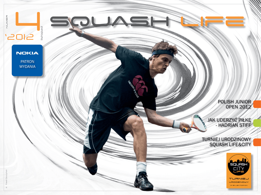 ‘2012 listopad numer 4 PATRON WYDANIA POLISH JUNIOR OPEN 2012 JAK UDERZYĆ PIŁKĘ - HADRIAN STIFF Paweł Dziurzyński TURNIEJ URODZINOWY SQUASH LIFE&CITY turniej urodzinowy 17-18 lisytopada SPIS TREŚCI o5 13 17 35 38 65 SQUASH LIFE GUIDE Teksty, grafiki oraz inne treści opublikowane na łamach „SquashLife” są chronione prawami autorskimi wydawcy magazynu, ich autorów lub osób trzecich. Znaki towarowe i wszelkie inne oznaczenia o charakterze odróżniającym, umieszczone w „SquashLife” podlegają ochronie prawnej na rzecz wydawcy magazynu „SquashLife” lub innych uprawnionych osób trzecich. Używanie bądź korzystanie z utworów, znaków towarowych lub oznaczeń, o których mowa wyżej, jest zabronione bez uzyskania uprzedniej pisemnej zgody właściwego podmiotu uprawnionego, z wyjątkiem wykorzystania ich zgodnie z prawem dla celów prywatnych i niekomercyjnych. Redakcja nie zwraca niezamówionych tekstów i fotografii oraz zastrzega sobie prawo do skracania i redagowania nadesłanych materiałów. Zdjęcia z zasobów autorów. Klubów lub redakcji. Redakcja nie odpowiada za treść zamieszczanych reklam i ogłoszeń. by wypełniania protokołu turniejowego, zagłębiamy Jak może zauważyliście wróciliśmy do tradycyjnej dla wiamy potencjalne kontuzje w artykule Rafała Kac- nas wersji elektronicznej. Postanowiliśmy w miejsce przaka. wersji drukowanej zaangażować się w rozwój kolejnych wersji elektronicznych. Rozpoczęliśmy pracę nad bardziej interaktywnymi wersjami SquashLife na tablety. Jest to, według nas, przyszłość nowoczesnej prasy, 2 szczególnie dla naszego profilu czytelników, dla których komputery, tablety i internet są już codziennością. Na koniec odrobina polityki w naszych felietonach. A w aktualny numerze opisujemy wydarzenia z począt- Zapraszam. ku sezonu w kraju i na świecie. Z sylwetek tym razem prezentujemy dwóch zawodników zagranicznych, jed- Bartek Wysocki nak obecnych na naszych kortach. LJ Anjeme – czo- Redaktor Naczelny łowego zawodnika świata mogliśmy oglądać na kortach klubu SquashCity podczas Turnieju Urodzinowego Squash Life&City. Drugim zawodnikiem jest Nadav Tannen, jeden z najlepszych graczy w Polsce, grający na co dzień w Szczecinie. Z wywiadów mamy dla Was rozmowę z Krzysztofem Tymą, ojcem Konrada i Kariny, którzy rozpoczęli naukę squasha w Polsce, aby obecnie kontynuować ją w Anglii. Squash life SQUASHLIFE - ZASADY nowym sezonie 2012/13. Kuba Rybicki Ta ikona umieszczona na zdjęciu oznacza, że są dostępne inne zdjęcia na dany temat. Należy kliknąć symbol aby przejść do danej galerii. Konieczne jest połączenie z internetem. A w poradni tym razem przedstawiamy m.in. spososekrety techniki z Hadrianem Siff’em gry oraz oma- Squash’s life Ta ikona umieszczona na zdjęciu oznacza, że na ten temat jest dostępny materiał filmowy. Aby go obejrzeć należy kliknąć na zdjęciu. Konieczne jest połączenie z internetem. Witajcie w kolejnym numerze SquashLife, pierwszym w SPIS TREŚCI o5 13 17 35 38 65 WYDARZENIA ŚWIAT red. nacz. BARTOSZ WYSOCKI o5 US OPEN 2012 2-5.05.2012r. – Delaware Investments U.S. Open 2012 – Philadelphia USA WYDARZENIA ŚWIAT WYDARZENIA KRAJ 17 WYDARZENIA KRAJ ŚWIATOWY DZIEŃ SQUASHA – 20.10.2012R. - Bartek Wysocki Witajcie w jedenastym z kolei numerze SquashLife, obejmującego wydarzenia z początku nowego sezonu 2012/13. Kolejnego numeru spodziewajcie się w styczniu 2013r.” 11 21 PREZENTACJE 13 27 PREZENTACJE TURNIEJ URODZINOWY SQUASH LIFE&CITY 17-18.11.2012r. – Turniej Urodzinowy Squash Life&City kat.A – SquashCity Warszawa WYWIAD METRYCZKA - Nadav Tannen 15 KARAKAL KAHUNA CUP 22-23.09.2012r. – Karakal Kahuna Cup kat. A Kahuna Warszawa WYDARZENIA KRAJ METRYCZKA - Laurens Jan Anjema Zespół redakcyjny: Bartosz Wysocki, Jakub Rybicki, Arkadiusz Saliński Stali współpracownicy: Maciej Chądzyński, Michał Dobrowolski, Jarek Duda, Krzysztof Dymel, Rafał Kacprzak, Jagoda Podkowska, Rosanna Radlińska-Tyma, Hadrian Stiff. Projekt graficzny i skład: Arkadiusz Saliński Współpraca projektowa: mojoStudio Joanna Modrzewska Wydawca: AMS Media Arkadiusz Saliński E: [email protected] www.squashlife.pl POLISH JUNIOR OPEN 2012 9-10.11.2012r. – Polish Junior Open - Kahuna Warszawa KRZYSIEK TYMA OJCIEC JUNIORÓW - WYWIAD - Bartek Wysocki 35 SPIS TREŚCI o5 13 17 35 38 PORADNIA PORADNIA JAK UDERZYĆ PIŁKĘ Z SIŁĄ I ŁATWOŚCIĄ - Hadrian Stiff 56 38 PORADNIA PORADNIA DOSKONALENIE GRY: - SERWIS - Michał Dobrowolski 6O KURS ESF LEVEL1 KRAKÓW - Maciek Chądzyński 48 PORADNIA SĘDZIOWANIE - PROTOKÓŁ MECZU cz.1 - Arek Saliński 51 SPIS TREŚCI 43 PORADNIA URAZY SKRĘTNE STAWU KOLANOWEGO - Rafał Kacprzak FELIETON WITAMINY I MINERAŁY W ŻYWIENIU SPORTOWCÓW - Jagoda Podkowska DWA LATA … I TROCHĘ WIĘCEJ - Arek Saliński 65 FELIETON 67 BYĆ JAK NEWSWEEK US - Bartek Wysocki 65 o5 13 17 35 38 65 US OPEN 2012 SPIS TREŚCI US OPEN 2012 Bartek Wysocki 2-5.05.2012r. – Delaware Investments U.S. Open 2012 – Philadelphia USA US Open to turniej z historią sięgającą 1954r. (jeszcze jako hardball). To też najważniejsza impreza squashowa w USA. W tym sezonie był to też pierwszy turniej z cyklu PSA World Series, z pulą nagród 115.000 USD. SPIS TREŚCI o5 13 17 35 38 W drabince wszyscy czołowi zawodnicy świata, m.in. James Willstrop, Nick Matthew, Gregory Gaultier, Ramy Ashour, Mohamed El Shorbagy, Karim Darwish, Amr Shabana (obrońca tytułu z ubiegłego roku), Laurens Jan Anjema. Pierwsze rundy w tak mocno obsadzonych turniejach zwykle są tylko formalnością, łatwo wygrywają rozstawieni zawodnicy. Z rozstawionych zawodników tylko J.Willstrop, N.Matthew i M.El W drugiej rundzie najwięcej czasu na korcie, i najwięcej setów, rozegrał wspomniany Egipcjanin w meczu z Cameronem Pilley. Sztuka urwania choć seta udała się także Darylowi Selby (w meczu z J.Willstropem) oraz L.J. Anjema w meczu z A.Shabaną. W ten sposób cała rozstawiona 