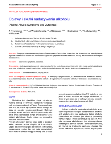 Journal of Clinical Healthcare 1(2015) Page 2 of 43 ————————————————————————————————————– 2 -6 ARTYKUŁY POGLĄDOWE (REVIEW PAPERS) Objawy i skutki nadużywania alkoholu (Alcohol Abuse: Symptoms and Outcomes) A Ryszkowski 1,A,B,D,, A Wojciechowska 1,F, Z Kopański 1,2,E , I Brukwicka 3,B , Y Lishchynskyy 4,B , M Mazurek 1,C 1. Collegium Masoviense – Wyższa Szkoła Nauk o Zdrowiu 2. Wydział Nauk o Zdrowiu Collegium Medicum Uniwersytet Jagielloński 3. Państwowa Wyższa Szkoła Techniczno-Ekonomiczna w Jarosławiu 4. Lwowski Uniwersytet Narodowy im. Danylo Halytskiego Abstract— The paper characterises the phases of development of alcoholism. It describes the factors that can intensify human organism’s addiction to alcohol and discusses the types and symptoms of alcohol addictions. Finally, the outcomes of drinking are also described.. Key words — alcoholism, symptoms, outcomes. Streszczenie— Autorzy scharakteryzowali etapy rozwoju choroby alkoholowej, omówili czynniki, które mogą nasilać uzależnienie organizmu od alkoholu, omówili typy i objawy uzależnienia alkoholowego, jak również skutki nadużywania alkoholu. Słowa kluczowe — choroba alkoholowa, objawy, skutki. Wkład poszczególnych autorów w powstanie pracy— A-Koncepcja i projekt badania, B-Gromadzenie i/lub zestawianie danych, C-Analiza i interpretacja danych, D-Napisanie artykułu , E-Krytyczne zrecenzowanie artykułu, F-Ostateczne zatwierdzenie artykułu Adres do korespondencji — Prof. dr Zbigniew Kopański, Collegium Masoviense – Wyższa Szkoła Nauk o Zdrowiu, Żyrardów, ul. G. Narutowicza 35, PL-96-300 Żyrardów, e-mail: [email protected] Zaakceptowano do druku: 7.01.2015. WSTĘP Alkoholizm jest zjawiskiem ciągle zajmującym wysoką pozycję w rankingu najczęściej występujących przejawów patologii w Polsce. Problemy alkoholowe w dużej mierze są wynikiem bardzo łatwego dostępu do napojów wysokoprocentowych. Statystyki pokazują wzrost spożycia alkoholu przez osoby nieletnie oraz przerażające tempo zmniejszenia wieku inicjacji alkoholowej. Osoby młode są szczególnie narażone na uzależnienie. Problem alkoholowy dotyczy także osób w starszym wieku, zarówno z rodzin ubogich, jak i zamożnych. Często powodem sięgnięcia po kieliszek jest depresja, rozczarowanie życiem lub zbyt duża odpowiedzialność. Warto tu zwrócić uwagę na istotny fakt, iż dzieci uczą się poprzez naśladownictwo! W związku z tym, jeżeli w domu spożywa się napoje alkoholowe, to dzieci z tych rodzin są w większym stopniu predestynowane do problemów alkoholowych. [1-4] CZYM JEST ALKOHOLIZM? Jednym z nałogów występujących nie tylko w naszym w społeczeństwie jest uzależnienie od alkoholu, czyli utrata kontroli nad spożywaną ilością alkoholu. Uzależnienie od alkoholu jest chorobą przewlekłą, która postępuje i może zakończyć się zgonem. Choroba nazwana alkoholizmem jest wieloczynnikowa, oddziałuje na zdrowie fizyczne i psychiczne człowieka, jak również na środowisko społeczne chorego. Nie można całkowicie jej wyleczyć, można jedynie posta2 Journal of Clinical Healthcare 1(2015) Page 3 of 43 ————————————————————————————————————– rać się, aby szkody były zminimalizowane, a objawy kontrolowane. Choroba alkoholowa rozwija się zwykle w czterech etapach [5-7]: etap wstępny – trwa od kilku miesięcy do kilku lat, stopniowo wzrasta tolerancja na alkohol, który łagodzi przykre emocje i picie go sprawia przyjemność, etap ostrzegawczy – zaczyna się w momencie pojawienia się luk pamięciowych, etap krytyczny – utrata kontroli nad piciem, etap przewlekły – wielodniowe ciągi alkoholowe. Do postawienia prawidłowej diagnozy dotyczącej choroby alkoholowej pomocne są kryteria Międzynarodowej Klasyfikacji Chorób, które określają, że choroba alkoholowa zdiagnozowana jest wtedy, jeśli wystąpią przynajmniej trzy z podanych niżej objawów, w okresie przynajmniej jednego miesiąca lub w ciągu ostatniego roku w kilkukrotnych okresach krótszych niż miesiąc i są to [8,9]: silne pragnienie lub poczucie przymusu picia (głód alkoholowy), upośledzenie zdolności kontrolowania zachowań związanych z piciem, upośledzenie zdolności powstrzymywania się od picia, trudności w jego zakończeniu trudności w ograniczaniu ilości wypijanego alkoholu, fizjologiczne objawy zespołu abstynencyjnego w sytuacji ograniczenia lub przerywania picia (drżenie, nadciśnienie tętnicze, nudności, wymioty, biegunka, bezsenność, niepokój, w krańcowej postaci majaczenie I drżenie) lub używanie alkoholu w celu uwolnienia się od objawów abstynencyjnych, zmieniona (nzwykle zwiększona) tolerancja alkoholu, potrzeba spożywania zwiększonych dawek dla osiągnięcia oczekiwanego efektu, koncentracja życia wokół picia kosztem zainteresowań i obowiązków, uporczywe picie alkoholu mimo oczywistych dowodów występowania szkodliwych następstw picia. Wyodrębniono kilka czynników, które mogą być odpowiedzialne za uzależnianie się organizmu od alkoholu, są to [9-11]: alkohol działa na wiele różnych rejonów w mózgu, pobudzając jedne, a hamując inne, w rezultacie prowadzi to do stanów zmienionej percepcji rzeczywistości, po wypiciu alkoholu uwalniają się endorfiny i dopamina odpowiedzialne za uczucie przyjemności i nagrody po wypiciu alkoholu, aktywność serotoniny w mózgu u alkoholików jest mniejsza, podczas picia zwiększa się jej ilość, co równoznaczne jest z uczuciem tzw. nagrody w związku z piciem, regularne nadużywanie alkoholu powoduje, że niektóre receptory w mózgu stają się zbyt aktywne, co w efekcie daje objawy zespołu abstynencji. UZALEŻNIENIA I OBJAWY Uzależnienie od alkoholu jest problemem, którym zajmuje się medycyna, psychologia, socjologia i inne nauki pokrewne. Przyczyny cho