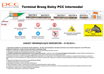 Terminal Brzeg Dolny PCC Intermodal Brzeg Dolny ZASADY OBOWIĄZUJĄCE KIEROWCÓW – 01.09.2015 r. 1. Ograniczenie prędkości na wewnętrznej drodze dojazdowej – 30 km/h oraz bezwzględny obowiązek stosowania się do znaków drogowych w tym STOP przed przejazdami kolejowymi z uwagi na bramy automatyczne zamykające drogę. 2. Wjazd na terminal tylko za zgodą pracownika PCC Intermodal lub upoważnionego pracownika ochrony. 3. Obowiązek stosowania się do oznakowania poziomego i pionowego. 4. Urządzenia przeładunkowe (Reachstackery) oraz inne pojazdy terminala z „kogutem” barwy żółtej mają bezwzględne pierwszeństwo. Uwaga! Operator reachstackera ma ograniczoną widoczność w szczególności do tyłu, przejeżdżając w jego pobliżu należy zachować szczególną ostrożność. 5. Obowiązek prowadzenia nasłuchu na kanale 16 CB radia jeśli pojazd jest w nie wyposażony. Przy przejeździe obok reachstackera nawiązać kontakt wzrokowy z operatorem. Odjazd kierowcy z pod reachstackera po rozładunku/załadunku kontenera możliwy tylko i wyłącznie po uzyskaniu wyraźnej akceptacji od operatora (sygnał dźwiękowy lub zgody na CB). 6. Ograniczenie prędkości przy poruszaniu się po terminalu- 20 km/h. 7. Całkowity zakaz palenia na terenie terminala. 8. Bezwzględny obowiązek noszenia kamizelek odblaskowych. 9. Zakaz wychodzenia z kabiny w obszarze pracy urządzenia przeładunkowego bez zgody operatora. 10. Uwaga! W poprzek terminala oraz pomiędzy blokami składowymi mogą poruszać się reachstackery. Kierowcy zobowiązani są zachować szczególną ostrożność się przed skrzyżowaniami i upewnić się o możliwości bezpiecznego przejazdu. 11. Zawracanie możliwe tylko w wyznaczonych miejscach. 12. Zakaz przejeżdżania w zbyt bliskiej odległości od kontenerów, budynków, torów i pod poniesionymi kontenerami. 13. Zakaz prowadzenia rozmów przez telefon komórkowy podczas jazdy. 14. Kierowca pojazdu odpowiada za zanieczyszczenia i uszkodzenia spowodowane podczas jazdy i przez swój pojazd. 15. Parkowanie na terenie terminalu jest dopuszczalne dla 2-óch zestawów samochodowych max. do 30 min. na łuku przed bramą wyjazdową z terminalu. Pozostałe auta oczekujące dłużej jak 30 min. na przeładunek muszą opuścić teren terminala. Zabrania się również parkowania na drodze dojazdowej do terminalu oraz przyległym chodniku z kruszywa. W ustaleniu z Kierującym Zmianą na terminalu mogą nastąpić ustępstwa od nn zasady. 16. Kierowców oczekujących na bramie (przyjazd/ wyjazd) obowiązuje taka sama zasada jak na terminalu, czyli zakaz wychodzenia z auta do momentu opisania kontenera przez pracownika bramowego. Po opisaniu kierowcy podchodzą do okna bramowego po odbiór dokumentów. W holu przed okienkiem bramowym może znajdować się max. 2-4 kierowców po odbiór dokumentów. 1-2 z przyjazdu + 1-2 na wjazd. 17. Kierowca ma obowiązek otworzyć oraz przymknąć drzwi w kontenerze pracownikowi bramowemu w celu oceny stanu technicznej kontenera jak również zamknąć po zakończeniu kontroli/ opisie kontenera. 18. Przy postoju dłuższym jak 5 min silnik w samochodzie ciężarowym nakazuje się wyłączyć. 19. Zasady ruchu na bramach: wjazd: brama nr 4 (4-ta od budynku) transport zewnętrzny (kierowcy nie zatrudnieni na terminalu); brama nr.3 (3-cia od budynku) tylko transport wewnętrzny (kierowcy zatrudnieni na terminalu i obsługujący PCC R). wyjazd: brama nr.1 (1-sza od budynku) transport zewnętrzny (kierowcy nie zatrudnieni na terminalu); brama nr.2 (2-ga od budynku) tylko transport wewnętrzny (kierowcy zatrudnieni na terminalu i obsługujący PCC R) Inspektorzy ds. terminalowych (bramowi) decydują o ewentualnej zmianie organizacji ruchu czyli wjazd/ wyjazd transportu zew. na dwie bramy w momencie wystąpienia obsługi priorytetowej (czyli pilne/ opóźnione podstawienia) lub braku podstawień wewnętrznych. Dodatkowo ZABRANIA SIĘ jazdy pod prąd ! W wyjątkowych sytuacjach może być dopuszczony przejazd pod prąd ale tylko po wcześniejszym uzyskaniu zgody od Inspektora ds. terminalowych (zgoda/ decyzja o przejeździe musi być odpowiednio uzasadniona). 20. W przypadku konieczności wjazdu na terminal z pasażerem obowiązuje go zakaz opuszczania kabiny, ew. poruszanie się po obiekcie zgodne z zasadami dotyczącymi kierowców. Kierowca ponosi pełną odpowiedzialność za swojego pasażera w tym za przestrzeganie przez niego wszystkich zasad obowiązujących na terenie Terminala Kontenerowego. 21. Zabrania się robienia zdjęć, kręcenia filmów za pomocą kamer lub telefonów komórkowych na terenie całego obiektu. RAŻĄCE ZANIEDBANIE W/W ZASAD BĘDZIE SKUTKOWAŁO ZABLOKOWANIEM SYSTEMOWYM WJAZDU NA TERMINALE PCC INTERMODAL ! Przyjąłem do wiadomości i stosowania: …………………………………………………………………………………………………………………………………………………………..……………………………………………………………..……………………… Imię i nazwisko Data i podpis Seria i numer dowodu tożsamości Wersja nr. 5, data publikacji 30.11.2016 r.