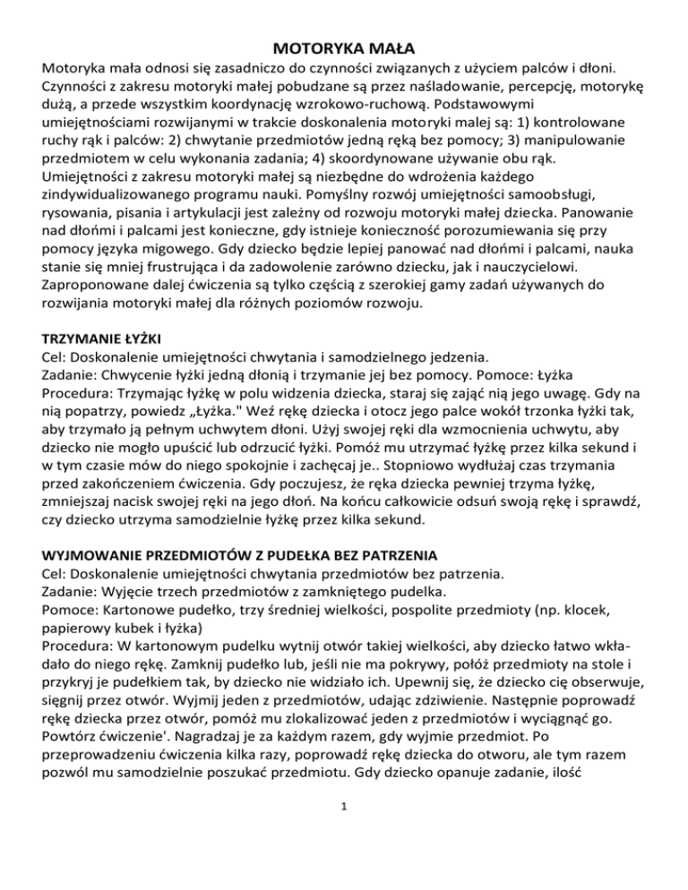MOTORYKA MAŁA Motoryka mała odnosi się zasadniczo do czynności związanych z użyciem palców i dłoni. Czynności z zakresu motoryki małej pobudzane są przez naśladowanie, percepcję, motorykę dużą, a przede wszystkim koordynację wzrokowo-ruchową. Podstawowymi umiejętnościami rozwijanymi w trakcie doskonalenia motoryki malej są: 1) kontrolowane ruchy rąk i palców: 2) chwytanie przedmiotów jedną ręką bez pomocy; 3) manipulowanie przedmiotem w celu wykonania zadania; 4) skoordynowane używanie obu rąk. Umiejętności z zakresu motoryki małej są niezbędne do wdrożenia każdego zindywidualizowanego programu nauki. Pomyślny rozwój umiejętności samoobsługi, rysowania, pisania i artykulacji jest zależny od rozwoju motoryki małej dziecka. Panowanie nad dłoomi i palcami jest konieczne, gdy istnieje koniecznośd porozumiewania się przy pomocy języka migowego. Gdy dziecko będzie lepiej panowad nad dłoomi i palcami, nauka stanie się mniej frustrująca i da zadowolenie zarówno dziecku, jak i nauczycielowi. Zaproponowane dalej dwiczenia są tylko częścią z szerokiej gamy zadao używanych do rozwijania motoryki małej dla różnych poziomów rozwoju. TRZYMANIE ŁYŻKI Cel: Doskonalenie umiejętności chwytania i samodzielnego jedzenia. Zadanie: Chwycenie łyżki jedną dłonią i trzymanie jej bez pomocy. Pomoce: Łyżka Procedura: Trzymając łyżkę w polu widzenia dziecka, staraj się zająd nią jego uwagę. Gdy na nią popatrzy, powiedz „Łyżka." Weź rękę dziecka i otocz jego palce wokół trzonka łyżki tak, aby trzymało ją pełnym uchwytem dłoni. Użyj swojej ręki dla wzmocnienia uchwytu, aby dziecko nie mogło upuścid lub odrzucid łyżki. Pomóż mu utrzymad łyżkę przez kilka sekund i w tym czasie mów do niego spokojnie i zachęcaj je.. Stopniowo wydłużaj czas trzymania przed zakooczeniem dwiczenia. Gdy poczujesz, że ręka dziecka pewniej trzyma łyżkę, zmniejszaj nacisk swojej ręki na jego dłoo. Na koocu całkowicie odsuo swoją rękę i sprawdź, czy dziecko utrzyma samodzielnie łyżkę przez kilka sekund. WYJMOWANIE PRZEDMIOTÓW Z PUDEŁKA BEZ PATRZENIA Cel: Doskonalenie umiejętności chwytania przedmiotów bez patrzenia. Zadanie: Wyjęcie trzech przedmiotów z zamkniętego pudelka. Pomoce: Kartonowe pudełko, trzy średniej wielkości, pospolite przedmioty (np. klocek, papierowy kubek i łyżka) Procedura: W kartonowym pudelku wytnij otwór takiej wielkości, aby dziecko łatwo wkładało do niego rękę. Zamknij pudełko lub, jeśli nie ma pokrywy, połóż przedmioty na stole i przykryj je pudełkiem tak, by dziecko nie widziało ich. Upewnij się, że dziecko cię obserwuje, sięgnij przez otwór. Wyjmij jeden z przedmiotów, udając zdziwienie. Następnie poprowadź rękę dziecka przez otwór, pomóż mu zlokalizowad jeden z przedmiotów i wyciągnąd go. Powtórz dwiczenie'. Nagradzaj je za każdym razem, gdy wyjmie przedmiot. Po przeprowadzeniu dwiczenia kilka razy, poprowadź rękę dziecka do otworu, ale tym razem pozwól mu samodzielnie poszukad przedmiotu. Gdy dziecko opanuje zadanie, ilośd 1 przedmiotów powinna byd zwiększana lub zmniejszana, a pudełko należy zamienid na większe, aby znalezienie przedmiotu wymagało poszukiwao na większej przestrzeni. CHWYTANIE PRZEDMIOTU Cel: Doskonalenie chwytania palcami. Zadanie: Podnoszenie 10 przedmiotów o różnych rozmiarach i wkładanie ich do miski. Pomoce: Mała miska, 10 małych przedmiotów (np. rodzynek, orzech, guzik, klocek, koralik, śrubka, pióro, klucz, piłeczka i moneta) Procedura: Posadź dziecko przy stole i daj mu znad, że nadszedł czas pracy. Połóż przed dzieckiem przedmioty, upewniając się, że są w jego zasięgu. Podnieś jeden z przedmiotów precyzyjnym uchwytem kciuka i dwóch pierwszych palców. Powiedz „Włóż" i sam umieśd przedmiot w misce. Weź rękę dziecka i naprowadź jego kciuk i pierwsze dwa palce na przedmiot. Powiedz „Włóż" i przesuo jego rękę do miski. Pomóż dziecku rozluźnid rękę. Powtarzaj dwiczenie wiele razy, aż dziecko zacznie samodzielnie wykonywad odpowiednie ruchy. Odnotuj, które przedmioty chwyta z największą trudnością i pomagaj mu przy nich. Każdorazowo przypominaj mu o konieczności włożenia przedmiotu do miski. CHWYTANE PALCAMI Cel: Nauka prawidłowego chwytania palcami i poprawa panowania nad motoryką małą. Zadanie: Odrywanie małych kawałków plasteliny i wkładanie ich do puszki. Pomoce: Plastelina, puszka Procedura: Posadź dziecko przy stole i połóż przed nim plastelinę. Wyjmij ją z puszki, ale pozostaw puszkę w jego zasięgu. Pomóż dziecku utoczyd wałeczek centymetrowej grubości. Upewnij się, że dziecko cię obserwuje i zademonstruj mu precyzyjnymi ruchami kciuka i palca wskazującego, jak oderwad mały kawałek plasteliny z kooca wałeczka. Potrzymaj ten kawałek przed oczami dziecka. Następnie powiedz „Włóż" i umieśd go w puszce. Weź kciuk i wskazujący palec dziecka i pomóż mu oderwad maty kawałek. Powiedz „Włóż" i pomóż mu rozluźnid palce i umieścid plastelinę w puszce. Powtarzaj dwiczenie wiele razy, zmniejszając swoją kontrolę w miarę, jak dziecko będzie coraz poprawniej operowało palcami. Daj mu znad, ile razy ma powtarzad czynnośd przez położenie przed nim odpowiedniej ilości małych nagród. Po każdym włożeniu kawałka plasteliny do puszki, nagradzaj dziecko. NABIERANIE CUKRU ŁYŻKĄ Cel: Doskonalenie chwytania i manipulowania przyrządami oraz rozwój umiejętności samodzielnego jedzenia. Zadanie: Używanie łyżki do przenoszenia cukru z jednego pojemnika do drugiego. Pomoce: Łyżka, cukier (albo inny sypki materiał), dwie miseczki albo inne pojemniki Procedura Gdy dziecko opanowało już trzymanie łyżki przez krótki czas (dwiczenie 94), zacznij uczyd je używania łyżki. Postaw przed nim dwie miseczki, jedną z cukrem, drugą pustą. Włóż dziecku 2 łyżkę do ręki i wzmocnij jego uchwyt swoją ręką.