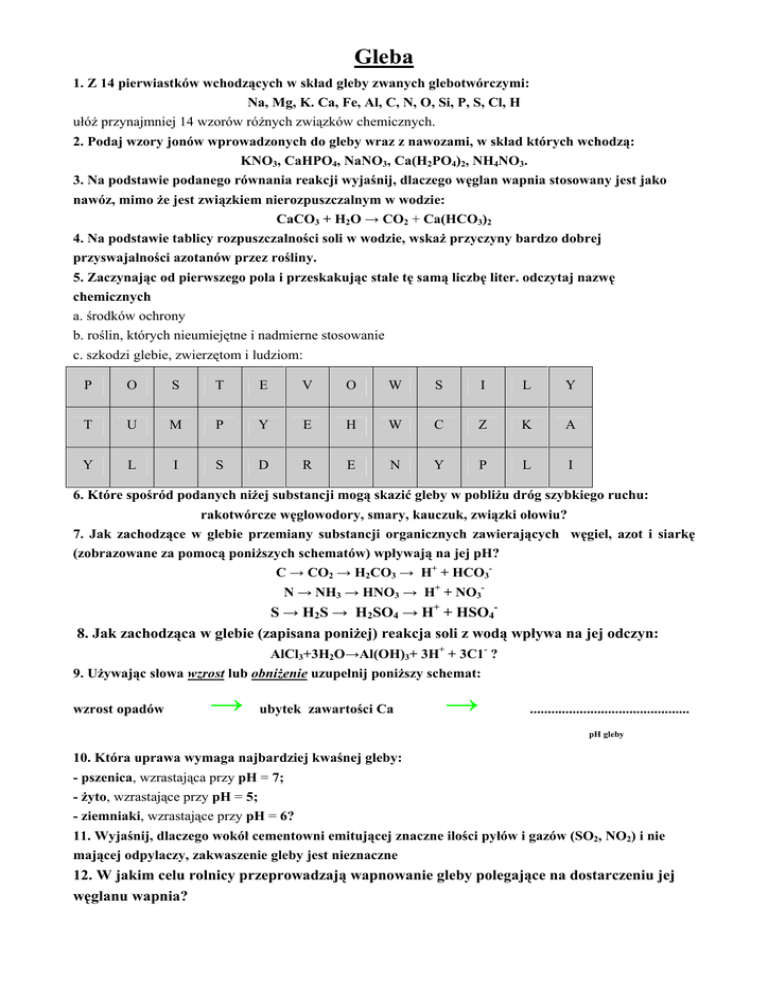 Gleba 1. Z 14 pierwiastków wchodzących w skład gleby zwanych glebotwórczymi: Na, Mg, K. Ca, Fe, Al, C, N, O, Si, P, S, Cl, H ułóż przynajmniej 14 wzorów różnych związków chemicznych. 2. Podaj wzory jonów wprowadzonych do gleby wraz z nawozami, w skład których wchodzą: KNO3, CaHPO4, NaNO3, Ca(H2PO4)2, NH4NO3. 3. Na podstawie podanego równania reakcji wyjaśnij, dlaczego węglan wapnia stosowany jest jako nawóz, mimo że jest związkiem nierozpuszczalnym w wodzie: CaCO3 + H2O → CO2 + Ca(HCO3)2 4. Na podstawie tablicy rozpuszczalności soli w wodzie, wskaż przyczyny bardzo dobrej przyswajalności azotanów przez rośliny. 5. Zaczynając od pierwszego pola i przeskakując stale tę samą liczbę liter. odczytaj nazwę chemicznych a. środków ochrony b. roślin, których nieumiejętne i nadmierne stosowanie c. szkodzi glebie, zwierzętom i ludziom: P O S T E V O W S I L Y T U M P Y E H W C Z K A Y L I S D R E N Y P L I 6. Które spośród podanych niżej substancji mogą skazić gleby w pobliżu dróg szybkiego ruchu: rakotwórcze węglowodory, smary, kauczuk, związki ołowiu? 7. Jak zachodzące w glebie przemiany substancji organicznych zawierających węgiel, azot i siarkę (zobrazowane za pomocą poniższych schematów) wpływają na jej pH? C → CO2 → H2CO3 → H+ + HCO3N → NH3 → HNO3 → H+ + NO3- S → H2S → H2SO4 → H+ + HSO48. Jak zachodząca w glebie (zapisana poniżej) reakcja soli z wodą wpływa na jej odczyn: AlCl3+3H2O→Al(OH)3+ 3H+ + 3C1- ? 9. Używając słowa wzrost lub obniżenie uzupełnij poniższy schemat: wzrost opadów → ubytek zawartości Ca → ............................................. pH gleby 10. Która uprawa wymaga najbardziej kwaśnej gleby: - pszenica, wzrastająca przy pH = 7; - żyto, wzrastające przy pH = 5; - ziemniaki, wzrastające przy pH = 6? 11. Wyjaśnij, dlaczego wokół cementowni emitującej znaczne ilości pyłów i gazów (SO2, NO2) i nie mającej odpylaczy, zakwaszenie gleby jest nieznaczne 12. W jakim celu rolnicy przeprowadzają wapnowanie gleby polegające na dostarczeniu jej węglanu wapnia?
