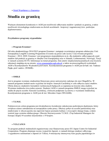 Dział Współpracy z Zagranicą Studia za granicą Ważnym elementem kształcenia w AGH jest możliwość odbywania studiów i praktyk za granicą, a także możliwość równoległego studiowania na dwóch uczelniach - krajowej i zagranicznej (tzw. podwójne dyplomowanie). Przykładowe programy stypendialne Program Erasmus+ Od roku akademickiego 2014/2015 program Erasmus+ zastępuje wcześniejszy program edukacyjny Unii Europejskiej Longlife Learning Programme (Uczenie się przez całe życie). Czas trwania programu Erasmus+: 2014–2020. Erasmus+ jest programem stypendialnym m.in. dla studentów odbywających część studiów lub praktyk za granicą w obrębie Unii Europejskiej oraz w Islandii, Lichtensteinie, Norwegii, Turcji w ramach systemu ECTS. Informacje na temat programu, lista umów międzyinstytucjonalnych oraz kryteria rekrutacji znajdują się na stronie: www.erasmusplus.agh.edu.pl, a także na poszczególnych wydziałach AGH u Koordynatorów Wydziałowych/Umów. Koordynatorem programu w AGH jest dr hab. inż. Tadeusz Pająk, prof. nadzw. (WIMiR). SMILE Jest to program wymiany studenckiej firmowany przez uniwersytety należące do sieci Magalh?es. W ramach programu student może wyjechać do krajów Ameryki Łacińskiej w celu odbycia części studiów. Oferta dotyczy studentów kierunków technicznych będących co najmniej na trzecim roku studiów. Wymiana studencka trwa jeden semestr. Studenci AGH w ramach programu SMILE mogą wyjechać na studia do pięciu uczelni Ameryki Łacińskiej, z którymi podpisane są umowy o wymianie studenckiej. Koordynatorem programu w AGH jest dr inż. Mirosław Gajer (WEAIiIB). T.I.M.E. Podstawowym celem programu jest dwukulturowe kształcenie zakończone podwójnym dyplomem, który zwiększa szanse zatrudnienia na europejskim rynku pracy. Dłuższy pobyt na uczelni partnerskiej oraz studiowanie w obcym języku ma zapewnić lepsze poznanie kultury i zwyczajów danego kraju, a także wartość jego systemu edukacyjnego. Obecnie Stowarzyszenie T.I.M.E. (Top Industrial Managers for Europe) skupia 54 uczelnie inżynierskie z 19 krajów. VULCANUS To program praktyk studenckich organizowany oraz finansowany przez EU-Japan Centre for Industrial Cooperation. Program obejmuje roczny wyjazd do Japonii, w ramach którego studenci odbywają: 1-tygodniowe seminarium o Japonii (w Tokio), 4-miesięczny intensywny kurs języka japońskiego (w To program praktyk studenckich organizowany oraz finansowany przez EU-Japan Centre for Industrial Cooperation. Program obejmuje roczny wyjazd do Japonii, w ramach którego studenci odbywają: 1-tygodniowe seminarium o Japonii (w Tokio), 4-miesięczny intensywny kurs języka japońskiego (w Tokio), 8-miesięczne praktyki w japońskiej firmie (cała Japonia). Praktykanci otrzymują bezpłatne zakwaterowanie oraz stypendium. (www.eu-japan.eu/vulcanus-japan-0) CEEPUS W ramach programu CEEPUS: tworzone są sieci współpracy międzyuczelnianej przy udziale partnerów z co najmniej trzech krajów; przyznawane są stypendia na staże krótkoterminowe, studia semestralne i praktyki; a także prowadzone są seminaria doskonalące, kursy językowe, kursy specjalistyczne. Sygnatariuszami porozumienia są: Albania, Austria, Bośnia i Hercegowina, Bułgaria, Czarnogóra, Chorwacja, Czechy, Macedonia, Mołdawia, Polska, Rumunia, Serbia, Słowacja, Słowenia, Węgry oraz UNMIK – Kosowo. (www.buwiwm.edu.pl/wym/ceepus.htm) HUSTEP W ramach współpracy z Hokkaido University w Japonii AGH może corocznie wysłać do Japonii kilku studentów na okres jednego roku akademickiego w ramach programu wymiany HUSTEP (Hokkaido University Short Term Exchange Program). SIT SHIBAURA INSTITUTE OF TECHNOLOGY W ramach zawartej umowy o współpracy pomiędzy AGH, a Shibaura Institute of Technology doktoranci mają możliwość wyjazdu na studia do Tokio. Dodatkowo na mocy zawartego porozumienia po ukończeniu nauki wybrani kandydaci mogą starać się o uzyskanie podwójnego dyplomu. Koordynatorem i opiekunem programu jest prof. Janusz Szmyd (WEiP). Szczegółowych informacji udziela Dział Współpracy z Zagranicą. Dział Współpracy z Zagranicą