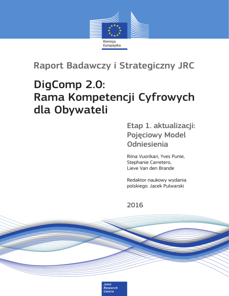Raport Badawczy i Strategiczny JRC DigComp 2.0: Rama Kompetencji Cyfrowych dla Obywateli Etap 1. aktualizacji: Pojęciowy Model Odniesienia Riina Vuorikari, Yves Punie, Stephanie Carretero, Lieve Van den Brande Redaktor naukowy wydania polskiego: Jacek Pulwarski 2016 Joint Research Centre Wydanie oryginalne: DigComp 2.0: The Digital Competence Framework for Citizens. Update Phase 1: The Conceptual Reference Model https://ec.europa.eu/jrc/en/publication/eur-scientific-and-technical-research-reports/digcomp-20-digital-competence-framework-citizensupdate-phase-1-conceptual-reference-model Dane kontaktowe Imię i nazwisko: Yves Punie Adres: Edificio Expo, Calle Inca Garcilaso 3, E-41092 Seville, Spain E-mail: [email protected] Tel.: +34 9544-88229 Centrum Naukowe Wspólnego Centrum Badawczego (JRC Science Hub) https://ec.europa.eu/jrc JRC101254 EUR 27948 EN PDF ISBN 978-92-79-58876-1 ISSN 1831-9424 LF-NA-27948-EN-N © Unia Europejska, 2016 Wydanie polskie: Polskie Towarzystwo Informatyczne, ECDL Polska ul. Solec 38 lok. 103 00-394 Warszawa Tel: +48 22 838 47 05 Fax: +48 22 636 89 87 e-mail: [email protected] http: www.ecdl.pl tłumaczenie: ECDL Polska redaktor naukowy: Jacek Pulwarski skład: Paulina Giersz, Elżbieta Buk ISBN 978-83-922646-9-9 ISBN 978-83-946253-0-6 (online) © Polskie Towarzystwo Informatyczne, ECDL Polska, 2016 Powielanie dozwolone pod warunkiem podania źródła. Podawanie źródła: Vuorikari, R., Punie, Y., Carretero Gomez S., Van den Brande, G. (2016). DigComp 2.0: The Digital Competence Framework for Citizens. Update Phase 1: The Conceptual Reference Model. Luxembourg Publication Office of the European Union. EUR 27948 EN. doi:10.2791/11517 Wszystkie ilustracje © Unia Europejska 2016 Niniejsza publikacja jest raportem badawczym i strategicznym przygotowanym przez Wspólne Centrum Badawcze (Joint Research Centre), wewnętrzne naukowe laboratorium badawcze Komisji Europejskiej. Jej celem jest zapewnienie, opartego na dowodach naukowych, wsparcia dla europejskiego procesu decyzyjnego. Wyrażona w nim treść naukowa nie jest jednoznaczna ze stanowiskiem strategicznym Komisji Europejskiej. Ani Komisja Europejska, ani żadna osoba działająca w imieniu Komisji nie ponosi odpowiedzialności za wykorzystanie niniejszej publikacji. Abstrakt DigComp2.0: Rama Kompetencji Cyfrowych dla Obywateli. Europejska Rama Kompetencji Cyfrowych dla Obywateli, znana również jako DigComp, oferuje narzędzia do poprawy kompetencji cyfrowych obywateli. Rama DigComp została po raz pierwszy opublikowana w roku 2013 i stała się punktem odniesienia dla wielu inicjatyw w zakresie kompetencji cyfrowych na poziomie europejskim oraz na poziomie państw członkowskich. Dokument ten wprowadza ramę DigComp 2.0. Stanowi to etap 1. aktualizacji ramy, który koncentruje się na pojęciowym modelu odniesienia, nowym słownictwie i poprawie opisów. Niniejszy dokument zawiera również przykłady wykorzystania ramy DigComp na poziomie europejskim, krajowym i regionalnym. Spis treści Spis treści Przedmowa do wydania polskiego........................................................................................................................................... 2 Streszczenie........................................................................................................................................................................................... 3 1. Wprowadzenie............................................................................................................................................................................ 5 2. Dwuetapowy proces aktualizacji .................................................................................................................................... 7 3. DigComp 2.0 – Pojęciowy model odniesienia........................................................................................................... 9 4. Od DigComp 1.0 do DigComp 2.0.................................................................................................................................... 11 4.1 DigComp 2.0: Nowe słownictwo i poprawione opisy dla lepiej określonych kompetencji.............................................................................................................................................................. 11 4.2 Porównanie zmian................................................................................................................................................ 13 5. Wykorzystanie i stosowanie ramy DigComp............................................................................................................. 18 5.1 Zastosowanie: formułowanie i wsparcie polityki................................................................................ 18 5.2 Zastosowanie: Planowanie procesu dydaktycznego ........................................................................ 22 5.3 Zastosowanie: narzędzie oceny.................................................................................................................... 24 5.4 Podobne prace i projekty.................................................................................................................................. 25 5.5 Tłumaczenia na inne języki ............................................................................................................................ 26 6. Wnioski i kolejne kroki............................................................................................................................................................ 28 Aneks 1................................................................................................................................................................................................ 29 Aneks 2 ............................................................................................................................................................................................... 3