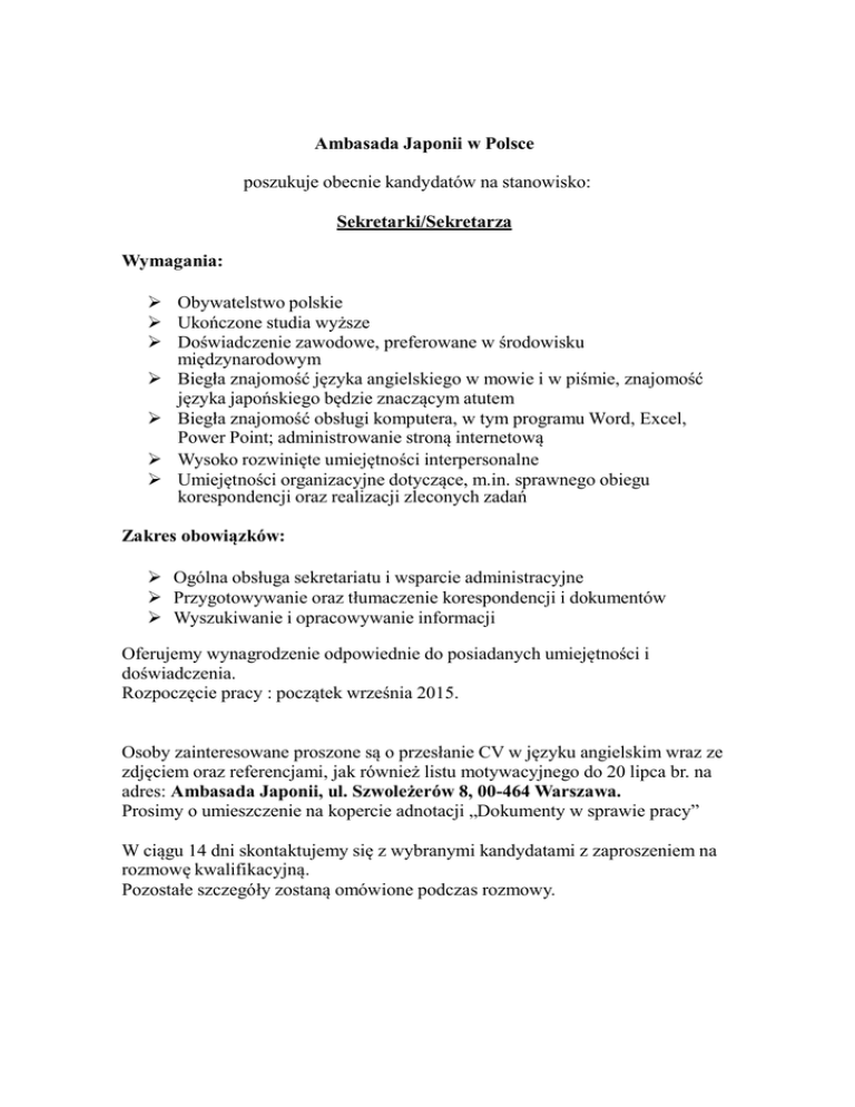 Ambasada Japonii w Polsce poszukuje obecnie kandydatów na stanowisko: Sekretarki/Sekretarza Wymagania: Obywatelstwo polskie Ukończone studia wyższe Doświadczenie zawodowe, preferowane w środowisku międzynarodowym Biegła znajomość języka angielskiego w mowie i w piśmie, znajomość języka japońskiego będzie znaczącym atutem Biegła znajomość obsługi komputera, w tym programu Word, Excel, Power Point; administrowanie stroną internetową Wysoko rozwinięte umiejętności interpersonalne Umiejętności organizacyjne dotyczące, m.in. sprawnego obiegu korespondencji oraz realizacji zleconych zadań Zakres obowiązków: Ogólna obsługa sekretariatu i wsparcie administracyjne Przygotowywanie oraz tłumaczenie korespondencji i dokumentów Wyszukiwanie i opracowywanie informacji Oferujemy wynagrodzenie odpowiednie do posiadanych umiejętności i doświadczenia. Rozpoczęcie pracy : początek września 2015. Osoby zainteresowane proszone są o przesłanie CV w języku angielskim wraz ze zdjęciem oraz referencjami, jak również listu motywacyjnego do 20 lipca br. na adres: Ambasada Japonii, ul. Szwoleżerów 8, 00-464 Warszawa. Prosimy o umieszczenie na kopercie adnotacji „Dokumenty w sprawie pracy” W ciągu 14 dni skontaktujemy się z wybranymi kandydatami z zaproszeniem na rozmowę kwalifikacyjną. Pozostałe szczegóły zostaną omówione podczas rozmowy.