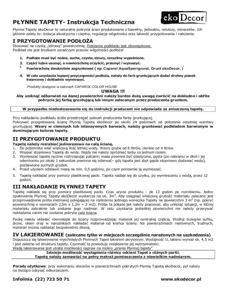 P£YNNE TAPETY- Instrukcja Techniczna P³ynne Tapety ekoDecor to naturalne pokrycia œcian produkowane z bawe³ny, jedwabiu, celulozy, minera³ów. Ich g³ówne zalety to: izolacja akustyczna i cieplna, regulacja wilgotnoœci oraz ³atwoœæ przygotowania i na³o¿enia. I PRZYGOTOWANIE POD£O¯A Stosowaæ na czyst¹ „zdrow¹” powierzchniê. Po³o¿enie podk³adu jest obowi¹zkowe. Podk³ad nie jest œrodkiem zaradczym przeciw wilgotnoœci pod³o¿a! 1. Pod³o¿e musi byæ noœne, suche, czyste, dziury, szczeliny wype³nione. 2. Czêœci luŸne usun¹æ, a nawierzchniê oczyœciæ, przemyæ i wysuszyæ. 3. * Powierzchniê dwukrotnie zagruntowaæ ( np. Caparol AquaSperrgrund, Grunt ekoDecor, ) 4. W celu uzyskania lepszej przyczepnoœci pod³o¿a, nale¿y do farb gruntuj¹cych dodaæ drobny piasek kwarcowy i dok³adnie wymieszaæ. * Produkty dostêpne w salonach CAPAROL COLOR HOUSE UWAGA !!! Aby unikn¹æ odbarwieñ na danej powierzchni nale¿y bardzo du¿¹ uwagê zwróciæ na dok³adne i obfite pokrycie jej farb¹ gruntuj¹c¹ lub innym zalecanym przez producenta gruntem. W przypadku niedostosowania siê do instrukcji producent nie odpowiada za zniszczon¹ tapetê. Przy nak³adaniu podk³adu œciœle przestrzegaæ zaleceñ producenta farby gruntuj¹cej. Pokrywaæ przygotowan¹ œcianê P³ynn¹ Tapet¹ ekoDecor po oko³o 24 godzinach od po³o¿enia ostatniej warstwy gruntuj¹cej. Wzory w ciemnych lub intensywnych barwach, nale¿y gruntowaæ podk³adem barwionym w dominuj¹cym kolorze tapety. II PRZYGOTOWANIE PRODUKTU Tapetê nale¿y rozrabiaæ jednorazowo na ca³¹ œcianê. 1. Do pojemnika wlaæ w³aœciw¹ iloœæ letniej wody. Wzory grube od 6 litrów, cienkie od 4 litrów. 2. Wsypaæ stopniowo Tapetê do wody. Nigdy nie nale¿y opró¿niaæ torby za jednym razem. 3. Wymieszaæ tapetê rêcznie roztrzepuj¹c palcami; masa powinna byæ plastyczna, gêsta (po nabraniu w d³oñ i jej odwróceniu po oko³o 1 sekundzie powinna siê oderwaæ– gdy tapeta jest zbyt gêsta stopniowo dodawaæ wody), pozbawiona suchych grudek. 4. Przed u¿yciem odstawiæ masê na min. 0,5 godziny, po czym ponownie j¹ wymieszaæ. 5. Tapetê nak³adaæ przy pomocy plastikowej packi. Tapeta nadaje siê do u¿ytku, po wymieszaniu z wod¹, przez 12 godzin. III NAK£ADANIE P£YNNEJ TAPETY Tapetê nak³ada siê przy pomocy plastikowej packi. Czas u¿ycia produktu - do 12 godzin po rozrobieniu. Jedno opakowanie P³ynnej Tapety ekoDecor wystarcza na ok. 3m2. Aby osi¹gn¹æ w³aœciw¹ gruboœæ materia³u zalecane jest przeprowadzenie próby metrowej polegaj¹cej na roz³o¿eniu jednego woreczka Tapety na powierzchni 3 m2 (np. pokryæ powierzchniê o wymiarach 2,5m x 1,2m = 3 m2). Próba ta poka¿e jak nale¿y pracowaæ, aby unikn¹æ sytuacji, w której materia³u zabraknie lub zostanie jego nadmiar. W celu uzyskania jednolitej powierzchni nie nale¿y przerywaæ nak³adania zanim nie zostanie pokryta ca³a œciana. Packê nale¿y uk³adaæ równolegle do œciany rozprowadzaj¹c materia³ jej centraln¹ czêœci¹. Wzd³u¿ brzegów sufitu, drzwi, okien oraz w naro¿nikach nak³adaæ materia³ od krañca œciany. Na powierzchniach nierównych, trudnych, materia³ mo¿na nak³adaæ bezpoœrednio d³oni¹. IV LAKIEROWANIE (zalecane tylko w miejscach szczególnie nara¿onych na uszkodzenia) Dopuszcza siê lakierowanie wyschniêtych P³ynnych Tapet lakierem akrylowym. Wydajnoœæ 1L lakieru wynosi ok. 4,5 m2 i jest zale¿na od struktury tapety. Czynnoœæ ta powoduje zwiêkszenie jej wytrzyma³oœci. Wad¹ lakierowania jest utrata mo¿liwoœci napraw na mokro „pranie P³ynnej tapety” Istnieje mo¿liwoœæ wyst¹pienia ró¿nicy odcieni Tapet z ró¿nych partii. Tapetê nale¿y zamawiaæ na pe³ny metra¿ pomieszczenia z niewielkim nadmiarem. Porady u¿ytkowe: przy wykonaniu otworów w powierzchniach pokrytych P³ynn¹ Tapet¹ ekoDecor, py³ nale¿y na bie¿¹co odsysaæ odkurzaczem. Infolinia (22) 723 50 71 www.ekodecor.pl