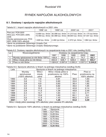 Rozdział VIII RYNEK NAPOJÓW ALKOHOLOWYCH 8.1. Dostawy i spożycie napojów alkoholowych Tabela 8.1. Import napojów alkoholowych w 2001 roku 19981 rok Piwo poz. PCN 2203 Wino poz. PCN 2204, 2205, 2206 Wyroby spirytusowe poz. PCN 2207, 2208 (100% alkohol) 1 2 19992 rok 20002 rok 20012 13.684 tys. litrów 30.096 tyś. litrów 41.213 tyś. litrów 41.175 tyś litrów 73.493 tys. litrów 82.088 tyś. litrów 68.804 tyś. litrów 67.031 tyś. litrów 1.609 tys. litrów 2.460 tyś litrów 2.372 tyś. litrów 1.984 tyś. litrów dane na podstawie Głównego Urzędu Ceł, dane na podstawie Głównego Urzędu Statystycznego. Tabela 8.2. Dostawy napojów alkoholowych na zaopatrzenie kraju w 2001 roku (według GUS) Lp. Wyszczególnienie Dostawy na zaopatrzenie kraju 1997 1998 1999 2000 2001 1. Wyroby spirytusowe (w mln litrów 100%) 108,8 93,2 82,7 74,7 63,7 2. Wina i miody pitne (w mln litrów) 450,9 528,7 528,0 458,0 403,7 3. Piwo w mln litrów 1.924,9 2.097,6 2.330,3 2.557,3 2.544,9 Tabela 8.3. Spożycie alkoholu w litrach na jednego mieszkańca (według GUS) Lata Spożycie w litrach na jednego mieszkańca Wyroby Wino i Wino i miody pitne w Piwo w spirytusowe miody przeliczeniu na 100% Piwo przeliczeniu na (100% alkohol) pitne alkohol 100% alkohol 1992 3,5 7,6 0,91 38,6 1,93 1993 3,8 7,5 0,90 33,0 1,65 1994 3,8 6,9 0,83 36,4 1,82 1995 3,5 6,8 0,82 39,0 1,95 1996 2,9 10,3 1,24 42,8 2,14 1997 2,8 11,6 1,39 49,8 2,49 1998 2,4 13,7 1,64 54,1 2,71 1999 2,1 13,6 1,63 60,1 3,0 2000 2,0 11,9 1,43 66,2 3,31 2001 1,7 10,5 1,26 65,8 3,29 Wino i miody pitne zawierają 12% alkoholu; piwo zawiera 5% alkoholu Tabela 8.4. Spożycie 100% alkoholu w litrach na jednego mieszkańca (według GUS) Lata Spożycia 1995 – 6,27 litra 1996 – 6,28 litra 1997 – 6,68 litra 1998 – 6,75 litra 1999 – 6,73 litra 2000 – 6,74 litra 2001 – 6,25 litra 94 Przy założeniu, że 30% sprzedaży wyrobów spirytusowych i winnych dokonuje się poza obiegiem rejestrowanym, rzeczywiste rozmiary średniej konsumpcji w 2001 roku można oszacować na poziomie około 7,5 litra 100% alkoholu na jednego mieszkańca. Tabela 8.5. Struktura spożycia napojów alkoholowych w procentach w przeliczeniu na 100% alkohol w latach 1996–2001 (Obliczenia PARPA na podstawie danych GUS) Lp. Wyszczególnienie 1996 1997 1998 1999 2000 2001 1. Wyroby spirytusowe 46,18% 41,92% 35,55% 31,20% 29,67% 27,2% 2. Wino i miody pitne 19,75% 20,81% 24,30% 24,22% 21,22% 20,16% 3. Piwo 34,07% 37,27% 40,15% 44,58% 49,11% 52,64% Przyjmuje się założenie, iż w jednym litrze: 1. piwa zawartych jest 5% alkoholu, 2. wina (miodu pitnego) zawartych jest 12% alkoholu. Przy założeniu, że 30% sprzedaży wyrobów spirytusowych i winnych dokonuje się poza obiegiem rejestrowanym, struktura spożycia napojów alkoholowych w 2001 roku kształtuje się następująco: • wyroby spirytusowe: 32,3%, • wina i miody pitne: 23,9%, • piwo: 43,8%. 8.2. Ceny napojów alkoholowych Według danych Głównego Urzędu Statystycznego wskaźnik cen towarów i usług konsumpcyjnych ogółem w 2001 roku wzrósł w stosunku do 2001 roku o 5,5%, w tym: – żywność – napoje alkoholowe – 5,2% – 6,6% Ceny napojów alkoholowych w 2001 roku wzrosły w stopniu wyższym niż ceny towarów i usług ogółem, co jest zgodne z ustawą o wychowaniu w trzeźwości i przeciwdziałaniu alkoholizmowi. Należy zwrócić uwagę, że alkohol zawarty w wódce jest relatywnie najdroższy w porównaniu z alkoholem zawartym w piwie i winie. Poniższe zestawienie przedstawia szacunkowe różnice w cenie czystego alkoholu zawartego w poszczególnych napojach alkoholowych. piwo wino wódka 95 cena 2,5 zł za 0,5 l 7,0 zł za 0,7 l 22 zł za 0,5 l procent alkoholu cena 1 litra w zł 5% 4,0 12% 10,0 40% 44,0 cena 1 litra 100% alk. w zł 80,0 83,3 110,0 8.3. Obrót hurtowy napojami alkoholowymi Wydawanie, cofanie i wygaszanie zezwoleń na obrót hurtowy napojami alkoholowymi o zawartości powyżej 18% alkoholu należy Do zadań Ministra Gospodarki Zadania te realizowane są na podstawie ustawy z dnia 26 października 1982 roku o wychowaniu w trzeźwości i przeciwdziałaniu alkoholizmowi (Dz.U. z 1982 r. Nr 35, poz. 230 z późniejszymi zmianami). Wydawanie, cofanie i wygaszanie zezwoleń następuje w drodze decyzji administracyjnych. Decyzje takie są podejmowane przez Ministra Gospodarki na zasadach i w trybie określonym przepisami Kodeksu Postępowania Administracyjnego. 8.3.1 Wymagania formalne do uzyskania zezwolenia. Dokumenty wymagane przy składaniu wniosku o wydanie zezwoleń na obrót hurtowy napojami alkoholowymi o zawartości powyżej 18% alkoholu oraz wzór wniosku określa rozporządzenie Ministra Gospodarki z dnia 13 czerwca 2001 roku (Dz.U. Nr 60, poz. 614). Zgodnie z tym rozporządzeniem do wniosku o wydanie zezwolenia w wyżej wymienionym zakresie należy dołączyć następujące dokumenty: • odpis z rejestru przedsiębiorców, • umowę spółki cywilnej, jeżeli została zawarta w celu prowadzenia obrotu hurtowego napojami alkoholowymi, • dokument potwierdzający tytuł prawny wnioskodawcy do użytkowania magazynu, • decyzję właściwego powiatowego inspektora sanitarnego, potwierdzającą przydatność magazynów wskazanych przez wnioskodawcę do przechowywania napojów alkoholowych, • zaświadczenie urzędu gminy o zgodności lokalizacji magazynu z miejscowym planem zagospodarowania przestrzennego lub opinię odnośnie możliwości prowadzenia obrotu hurtowego napojami alkoholowymi we wskazanym miejscu, • zaświadczenie właściwego urzędu skarbowego o niezaleganiu przez wnioskodawcę z realizacją ciążących na nim zobowiązań podatkowych lub zaświadczenie, że zobowiązania rozłożone na raty lub z o odroczonym terminie płatności są realizowane, • zaświadczenie Zakładu Ubezpieczeń Społecznych o niezaleganiu z wpłatami na ubezpieczenia społeczne i zdrowotne, • dowód wniesienia opłaty za wydanie zezwolenia. 8.3.2. Realizacja zadań w 2001 roku Ze