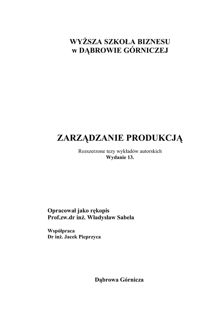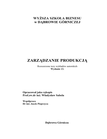WYŻSZA SZKOŁA BIZNESU w DĄBROWIE GÓRNICZEJ ZARZĄDZANIE PRODUKCJĄ Rozszerzone tezy wykładów autorskich Wydanie 13. Opracował jako rękopis Prof.zw.dr inż. Władysław Sabela Współpraca Dr inż. Jacek Pieprzyca Dąbrowa Górnicza 2 wrzesień 2010r. 3 Spis treści: Słowo wstępne.____________________________________________________________4 1. WPROWADZENIE______________________________________________________5 2. RÓŻNORODNOŚĆ PRZEDSIĘBIORSTW PRODUKCYJNYCH_________________7 3. ORGANIZACJA_______________________________________________________11 4. ORGANIZACJA PRZEMYSŁU NA PRZYKŁADZIE HUTNICTWA ŻELAZA_____19 5. URZĄDZENIA PRODUKCYJNE – ICH NABYWANIE ORAZ UTRZYMANIE W RUCHU______________________________________________________________30 6. PLANOWANIE PRODUKCJI____________________________________________46 7. ZAOPATRZENIE W SUROWCE, CZĘŚCI I PODZESPOŁY DO PRODUKCJI – JAKOŚĆ______________________________________________________________51 8. ORGANIZACJA ROZWOJU PRZEDSIĘBIORSTWA_________________________59 9. PROBLEMY EKOLOGICZNE____________________________________________74 10. BEZPIECZEŃSTWO I HIGIENA PRACY_________________________________88 Literatura._______________________________________________________________92 4 Słowo wstępne. Jesteście Państwo studentami wyższej uczelni a więc osobami studiującymi a nie wkuwającymi poszczególne przedmioty. Wykład jest jedynie przewodnikiem po przedmiocie. Chcąc korzystać następnie z książek, czasopism i internetu musicie wiedzieć o co się pytać by uzyskać rozwinięcie tematu podanego w wykładzie. Pozwoli to na rozwiązywanie problemów, z którymi będziecie się stykać w praktyce zawodowej. Człowiek chcący mieć powodzenie w życiu zawodowym powinien czytając książkę lub słuchając wykładu stawiać sobie pytania: dlaczego tak ma być, czy zawsze tak będzie, kiedy tak będzie itd. Życie zawodowe nie polega na bezmyślnym recytowaniu wykutych wiadomości ale na stosowaniu w praktyce tych i innych wiadomości oraz ich kojarzeniu. Ponieważ słuchaczy w grupie jest za dużo by z każdym oddzielnie rozmawiać, będę w trakcie mojego wykładu stawiał Państwu pytania nawiązujące do wykładu, wymagające prędkiego myślenia a może i przypomnienia sobie wcześniej słyszanych wiadomości. W Bibliotece WSB jest tegoroczny tekst (w postaci elektronicznej zapisany na płytce CD) tez mojego wykładu. Te tezy nie są pełnym wykładem. Dla lepszego zrozumienia podawanych wiadomości, w moim wykładzie będę przytaczał różne fakty z praktyki (nie wszystkie zamieściłem w tezach) a także różne schematy. Zachęcam więc do uczestnictwa w wykładach! Zdobywając wiedzę za własne czy rodziny pieniądze – wykorzystajcie okazję i nauczcie się jak najwięcej. Mądry, myślący i chętny człowiek ma większe szanse awansu i powodzenia niż ten, który w „jakiś” sposób uzyskał dyplom i uważa, że to da mu sukces życiowy. W.Sabela 5 1. WPROWADZENIE Produkcja polega na wytwarzaniu dóbr materialnych ale także usług. Produkty materialne i niematerialne są podstawą gospodarki. Wykład pt.: ”Zarządzanie produkcją” zazwyczaj obejmuje następujące zagadnienia: • układ w którym odbywa się produkcja – co produkujemy, w jakiej skali, jakimi środkami dysponujemy, itd., • techniczna baza produkcji: lokalizacja przedsiębiorstwa, zagospodarowanie terenu, wybór wyposażenia, • organizacja procesu produkcji, • dostawa i magazynowanie surowców i podzespołów – podstawy logistyki, • formy zbytu np. „just in time”, • jakość procesu produkcyjnego i wyrobów, • sprawy ludzkie – działanie kierownika, motywowanie pracowników itp., • działalność „utrzymania ruchu” urządzeń produkcyjnych, Na wykład dotyczący zarządzania produkcją przewidziano w Wyższej Szkole Biznesu w Dąbrowie Górniczej niewielką liczbę godzin wykładu w porównaniu z rozległością tematu, co zmusza do skrótów i uproszczeń. Z pomocą przychodzą tutaj wykłady w poprzednich semestrach. W sprawach „zarządzania produkcją” trzeba wykorzystać – a więc przypomnieć sobie we własnym zakresie wiadomości z przedmiotów dotyczących: organizacji przedsiębiorstw, podstaw i metod zarządzania, planowania strategicznego, controllingu oraz spraw związanych z wykorzystaniem i rolą działających w przedsiębiorstwach kierowników i pracowników. Biorąc to wszystko pod uwagę zaproponowałem ujęcie w wykładzie jedynie krótkiego streszczenia niektórych zasad dotyczących organizacji pracy. Wykorzystując moje wieloletnie doświadczenie w kierowaniu produkcją w hutach żelaza i w kierowaniu przemysłowym instytutem badawczym, chcę zużyć przeważającą część czasu, jakim dysponuję, na bardziej szczegółowe omówienie niektórych zagadnień w procesie produkcyjnym np. planowanie produkcji, wybrane przykłady zaopatrzenia w surowce, wybrane problemy dotyczące jakości produkcji, zasady organizacji unowocześniania produkcji, a także naszkicować sprawy dotychczas nie omawiane 6 w wykładach jak: gospodarka urządzeniami produkcyjnymi („utrzymanie ruchu” niektórzy autorzy określają ją jako „eksploatację urządzeń”), zarys problemów ekologicznych nawiązujący do działania przedsiębiorstwa produkcyjnego lub BHP. Naukowe podejście do zarządzania produkcją powstało w XIX wieku. Wielu kierowników przedsiębiorstw o umiejętności obserwowania, analizowania i syntetyzowania zjawisk, formułuje od tego czasu swoje poglądy, a nawet zasady na tematy związane z zarządzaniem produkcją. Niektóre z precyzowanych poglądów-zasad rozwijają poprzednio określone a inne negują te poprzednie. Dlatego trzeba ostrzec słuchaczy przed kopiowaniem w swoim przedsiębiorstwie organizacji z innych przedsiębiorstw lub dosłownym przyjmowaniem, nieraz modnych, nowości z literatury podstawowej oraz Internetu. Należy raczej poznać różne podejścia do p