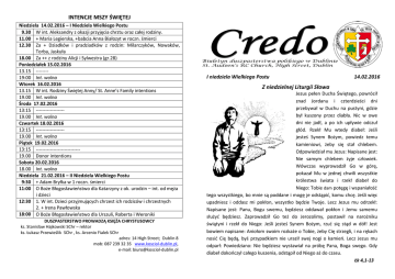 3 INTENCJE MSZY ŚWIĘTEJ Niedziela 14.02.2016 – I Niedziela Wielkiego Postu 9.30 W int. Aleksandry z okazji przyjęcia chrztu oraz całej rodziny. 11.00 + Maria Legierska, +babcia Anna Białozyt w roczn. śmierci 12.30 Za + Dziadków i pradziadków z rodzin: Milarczyków, Nowaków, Torba, Jaskuła 18.00 Za ++ z rodziny Alicji i Sylwestra (gr.28) Poniedziałek 15.02.2016 13.15 -------19:00 Int. wolna Wtorek 16.02.2016 13.15 W int. Rodziny Świętej Anny/ St. Anne’s Family intentions 19.00 Int. wolna Środa 17.02.2016 13:15 -----------------19.00 Int. wolna Czwartek 18.02.2016 13:15 -----------------19.00 Int. wolna Piątek 19.02.2016 13:15 ---------------------------19.00 Donor intentions Sobota 20.02.2016 18.00 Int. wolna Niedziela 21.02.2016 – II Niedziela Wielkiego Postu 9:30 + Adam Bryłka w 1 roczn. śmierci 11:00 O Boże Błogosławieństwo dla Katarzyny z ok. urodzin – int. od męża i dzieci 12:30 1. W int. Dzieci przyjmujących chrzest ich rodziców i chrzestnych 2. + Irena Pawłowska 18:00 O Boże Błogosławieństwo dla Urszuli, Roberta i Weroniki DUSZPASTERSTWO PROWADZĄ KSIĘŻA CHRYSTUSOWCY ks. Stanisław Hajkowski SChr – rektor ks. Łukasz Przewieślik SChr , ks. Arcenio Fialek SChr adres: 14 High Street; Dublin 8 mob: 087 239 32 35 www.kosciol-dublin.pl, e-mail: [email protected] I niedziela Wielkiego Postu 14.02.2016 Z niedzielnej Liturgii Słowa Jezus pełen Ducha Świętego, powrócił znad Jordanu i czterdzieści dni przebywał w Duchu na pustyni, gdzie był kuszony przez diabła. Nic w owe dni nie jadł, a po ich upływie odczuł głód. Rzekł Mu wtedy diabeł: Jeśli jesteś Synem Bożym, powiedz temu kamieniowi, żeby się stał chlebem. Odpowiedział mu Jezus: Napisane jest: Nie samym chlebem żyje człowiek. Wówczas wyprowadził Go w górę, pokazał Mu w jednej chwili wszystkie królestwa świata i rzekł diabeł do Niego: Tobie dam potęgę i wspaniałość tego wszystkiego, bo mnie są poddane i mogę je odstąpić, komu chcę. Jeśli więc upadniesz i oddasz mi pokłon, wszystko będzie Twoje. Lecz Jezus mu odrzekł: Napisane jest: Panu, Bogu swemu, będziesz oddawał pokłon i Jemu samemu służyć będziesz. Zaprowadził Go też do Jerozolimy, postawił na narożniku świątyni i rzekł do Niego: Jeśli jesteś Synem Bożym, rzuć się stąd w dół! Jest bowiem napisane: Aniołom swoim rozkaże o Tobie, żeby Cię strzegli, i na rękach nosić Cię będą, byś przypadkiem nie uraził swej nogi o kamień. Lecz Jezus mu odparł: Powiedziano: Nie będziesz wystawiał na próbę Pana, Boga swego. Gdy diabeł dokończył całego kuszenia, odstąpił od Niego aż do czasu. Łk 4,1-13 KRÓTKI KOMENTARZ DO NIEDZIELNEJ EWANGELII WIELKI POST Pokusa stanowi okazję do podjęcia decyzji: kogo wybieram, komu zaufam, komu powierzę swoje życie. Nie zdani na pastwę złego ducha – ma on nad nami tylko tyle władzy, ile mu jej udzielimy. Kusi nas, roztacza przed nami iluzje szczęścia i radości; jednak decyzja, czy go usłuchamy, należy do nas. Dzisiejsze czytania to Dobra Nowina o tym, że jesteśmy na drodze zbawienia i że „wzywając imienia Pańskiego”, podejmując decyzję wiary, zaufania Bogu, możemy przezwyciężyć pokusy podsuwane nam przez Złego. O. Przemysław Ciesielski OP & Łukasz Kubiak OP WIELKI POSTU U AUDOEN’A Rozpoczęliśmy Wielki Post, W czasie jego trwania zapraszamy do udziału w nabożeństwa pasyjnych: Droga Krzyżowa w każdy piątek o godz. 18.30. Gorzkie Żale z kazaniem pasyjnym w niedziele o godz. 17.15, zaś w środę o godz. 18.30 zapraszamy na śpiew Gorzkich Żali przed Mszą Świętą. 07.02.2016 – TACA NIEDZIELNA I Kolekta II Kolekta 540 € 310€ Koperty jednorazowe 215 € Koperty rejestrowane 100 € Bóg zapłać za składane ofiary ŚWIATOWE DNI MŁODZIEŻY Bóg zapłać za ofiary składane w kopertach, która są przeznaczone na bezpośrednie utrzymanie naszego kościoła. Są dwa rodzaje kopert K – RAKÓW jednorazowe i rejestrowane. W zestawy kopert 2016 rejestrowanych można zaopatrzyć się w biurze duszpasterstwa. Zarejestrowana Ofiara większa niż 250 euro w ciągu roku od jednej osoby pozwoli nam ubiegać się o dodatkowe 15% od Revenue. BIULETYN ELEKTRONICZNY Zapraszam do sposobu otrzymywania naszego biuletynu CREDO. Napisz do nas na adres: [email protected]. Gotowy numer biuletynu w formie PDF otrzymasz na swoją skrzynkę w każdą sobotę. Środa Popielcowa rozpoczęła okres czterdziestodniowego przygotowania do największej chrześcijańskiej uroczystości - Świąt Paschalnych. Wielki Post, bo tak nazywa się ten okres, trwa do początku liturgii Mszy Wieczerzy Pańskiej sprawowanej w Wielki Czwartek. W okresie Wielkiego Postu, który jest czasem pokuty i nawrócenia, Kościół, przypominając słowa Jezusa, proponuje trzy drogi przybliżania się do Boga: post, jałmużnę i modlitwę. Liturgia tego okresu jest dość wyciszona. Dominującym kolorem szat liturgicznych jest fiolet. Z obrzędów Mszy świętej znika uroczysty hymn "Chwała na wysokości Bogu". DUCHOWOŚĆ WIELKIEGO POSTU Chodzi tu o to, co Kościół nazywa metanoją, czyli o trwalsze przylgnięcie do Boga, o nawrόcenie serca człowieka ku Niemu oraz pojednanie z bliźnimi, wyrażone w: -większej wstrzemięrzliwości w jedzeniu i piciu, -większym zasłuchaniu się w Słowie Bożym, w czym mają pomόc rόwnież organizowane rekolekcje, -unikaniu zbytecznego rozproszenia w postaci hucznych zabaw, -większym skupieniu się na modlitwie, zarόwno tej prywatnej jak i wspόlnotowej, -wykazaniu większej wrażliwości na potrzeby innych, -korzystaniu z sakramentu pokuty i pojednania, -uczestnictwie w rόżnych ćwiczeniach wielkopostnych, na przykład w nabożeństwach wielkopostnych (gorzkie żale, droga krzyżowa), lub podejmowaniu pewnych szczegόlnych postanowień mających wykazać bezinteresowność, szlachetność serca, uśmiech, życzliwość Wszystkie te zachęty zbiera tradycyjna praktyka wielkopostnego skupien
