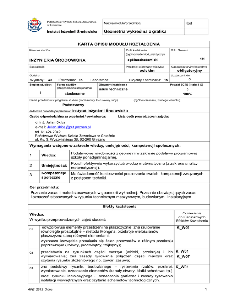 Państwowa Wyższa Szkoła Zawodowa w Gnieźnie Nazwa modułu/przedmiotu Instytut Inżynierii Środowiska Geometria wykreślna z grafiką Kod KARTA OPISU MODUŁU KSZTAŁCENIA Kierunek studiów Profil kształcenia Rok / Semestr (ogólnoakademicki, praktyczny) 1/1 ogólnoakademicki INŻYNIERIA ŚRODOWISKA Specjalność Przedmiot oferowany w języku: Kurs (obligatoryjny/obieralny) polskim obligatoryjny Liczba punktów Godziny Wykłady: 30 Stopień studiów: I Ćwiczenia: 15 Forma studiów (stacjonarna/niestacjonarna) 5 Projekty / seminaria: 15 Laboratoria: Obszar(y) kształcenia Podział ECTS (liczba i %) nauki techniczne 5 100% stacjonarne Status przedmiotu w programie studiów (podstawowy, kierunkowy, inny) Liczba punktów (ogólnouczelniany, z innego kierunku) Podstawowy Jednostka prowadząca przedmiot: Instytut xx Inżynierii Środowiska Osoba odpowiedzialna za przedmiot / wykładowca: xxx Lista osób prowadzących zajęcia: dr inż. Julian Skiba e-mail: [email protected] tel. 61 424 2942 Państwowa Wyższa Szkoła Zawodowa w Gnieźnie ul. Ks. S. Wyszyńskiego 38, 62-200 Gniezno Wymagania wstępne w zakresie wiedzy, umiejętności, kompetencji społecznych: 1 Wiedza: Podstawowe wiadomości z geometrii w zakresie podstawy programowej szkoły ponadgimnazjalnej. 2 Umiejętności: Potrafi efektywnie wykorzystać wiedzę matematyczna (z zakresu analizy matematycznej). 3 Kompetencje społeczne Ma świadomość konieczności poszerzania swoich kompetencji związanych z postępem techniki. Cel przedmiotu: Poznanie zasad i metod stosowanych w geometrii wykreślnej. Poznanie obowiązujących zasad i oznaczeń stosowanych w rysunku technicznym maszynowym, budowlanym i instalacyjnym. Efekty kształcenia Wiedza. W wyniku przeprowadzonych zajęć student: 01 02 03 odwzorowuje elementy przestrzeni na płaszczyźnie; zna rzutowanie równoległe prostokątne – metoda Monge’a, przekroje wielościanów płaszczyzną daną różnymi elementami, wyznacza krawędzie przecięcia się ścian przewodów o różnym przekroju poprzecznym (kołowy, prostokątny, trójkątny); Odniesienie do Kierunkowych Efektów Kształcenia K_W01 przedstawia na rysunkach części maszyn (widoki, przekroje) i ich K_W01 wymiarowania; zna zasady rysowania połączeń części maszyn oraz K_W07 czytania rysunku złożeniowego np. zawór, zasuwa; zna podstawy rysunku budowlanego – rysowanie rzutów, przekroi, K_W01 wymiarowanie, oznaczanie elementów (kanały,otwory, klatki schodowe itp.) oraz rysunku instalacyjnego - oznaczenia graficzne i zasady rysowania instalacji wewnętrznych oraz czytania schematów technologicznych. APE_2012_3.doc 1 Państwowa Wyższa Szkoła Zawodowa w Gnieźnie Nazwa modułu/przedmiotu Instytut Inżynierii Środowiska Geometria wykreślna z grafiką Umiejętności. W wyniku przeprowadzonych zajęć student potrafi: Kod Odniesienie do Kierunkowych Efektów Kształcenia 01 wizualizować utwory inżynierskie poprzez wyznaczenie krawędzi przecięcia się płaszczyzny tnącej ze ścianami wielościanu oraz linii K_U16 przenikania się ścian przewodów o przekrojach kołowych, prostokątnych i trójkątnych; 02 narysować części maszynowe w przekroju oraz odczytać kształt elementu K_U16 z takiego rysunku jak również wykonać rysunek wykonawczy tej części; 03 wykonać rysunki: - połączenia elementów np. połączenie gwintowe i kołnierzowe rur - złożeniowe prostego urządzenia, - obiektu budowlanego w rzucie - schematu projektowanej instalacji sporządzić odtworzeniowy rysunek obiektu budowlanego oraz instalacji ciepłowniczych, wentylacyjno-klimatyzacyjnych, wodociągowych i kanalizacyjnych. Kompetencje społeczne. W wyniku przeprowadzonych zajęć student zdobędzie następujące kompetencje: K_U02 K_U16 Odniesienie do Kierunkowych Efektów Kształcenia 01 rozumie potrzebę permanentnego kształcenia się i przekazywania w sposób zrozumiały informacji z najbliższym otoczeniem w działalności zawodowej; K_K01 K_K07 02 docenia znaczenie graficznej prezentacji utworu technicznego jako skutecznej formy wyjaśnienia zasady działania. K_K07 Sposoby sprawdzenia efektów kształcenia Wykłady: Bieżące zadania polegające na wykonaniu zadanych zadań (rysunków) obejmujących zakres wykładów Ćwiczenia: Obecność na ćwiczeniach – wszystkie obecności - 10 punktów Sprawdzenie wykonania zadanych rysunków z wykładów: 5 zadań, każde punktowane od 0-5 ( razem max 25 punktów) Mimum: 20 punktów (zaliczenie zadań 5x3=15; plus obecność 5) Projektowe: Zaliczenia zadanego rysunku projektu budowlanego i instalacyjnego – max 15 punktów Minimum: 8 punktów Razem max: 50 punktów: Skala ocen: Niedostateczny 2,0) poniżej 28 pkt Dostateczny (3,0) 28 pkt Dostateczny plus (3,5) 34 pkt Dobry (4,0) 40 pkt Dobry plus (4,5) 45pkt Bardzo dobry (5,0) 50 pkt APE_2012_3.doc 2 Państwowa Wyższa Szkoła Zawodowa w Gnieźnie Nazwa modułu/przedmiotu Instytut Inżynierii Środowiska Geometria wykreślna z grafiką Kod Treści programowe Odwzorowanie elementów przestrzeni na płaszczyźnie. Zasady rysowania i wymiarowania. Podstawowe wiadomości o wielościanach i powierzchniach w aspekcie ich praktycznego wykorzystania. Rzut cechowany jako forma zapisu na płaszczyźnie rysunku wartości trzech współrzędnych punktu. Rzuty Monge’a. Rzut aksonometryczny. Ogólne zasady rzutów prostokątnych w naukach technicznych. Odtworzeniowy rysunek architektoniczno – budowlany: zasady wykonywania, wykorzystanie w dokumentacji wewnętrznej instalacji wodociągowych i kanalizacyjnych. Schematy instalacji stosowanych w inżynierii środowiska. Zastosowanie graficznych programów komputerowych: CorelDraw, AutoCad, Surfem do analiz inżynierskich. Rysunek techniczny maszynowy: Podział rysunku technicznego ze względu na różne kryteria. Formaty. Podziałki. Zastosowanie linii rysunkowych. Metody rzutowania i ich wykorzystanie w praktyce inżynierskiej. Rzutowanie prostokątne. Przekroje, widoki cząstkowe, kła
