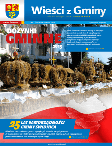 Wiesci z Gminy Informacje i wydarzenia z Gminy Świdnica Gmina Świdnica Nr 2 ( 27) Październik 2015 DOŻYNKI GMINNE 2015 25 Egzemplarz bezpłatny Gmina Świdnica ma szczególne powody do uroczystego dziękczynienia za płody ziemi. To największa gmina rolnicza w powiecie świdnickim. I chociaż nie zawsze zdarzają się obfite zbiory, to jednak starannie pielęgnowana tradycja i umiejętność wspólnego świętowania dożynek ma znaczący wpływ na umacnianie i kształtowanie lokalnych społeczności. Wydarzenia kulturalne Str. 30 LAT SAMORZĄDNOŚCI GMINY ŚWIDNICA Odrodzona samorządność to jeden z największych sukcesów naszych przemian. 26 maja w Krzyżowej władze gminy Świdnicy, radni wszystkich siedmiu kadencji oraz zaproszeni goście świętowali XXV lecie Samorządu Terytorialnego. Wydarzenia kulturalne www.gmina.swidnica.pl Str. 22 SPIS TREŚCI www.gmina.swidnica.pl WAŻNE INFORMACJE - KOMUNIKATY 1. 2. 3. 4. 5. 6. 7. 8. 9. 10. 11. UWAGA - ZMIANA NUMERÓW KONT BANKOWYCH......................................................................................................................... 3 TRZECI GABINET STOMATOLOGICZNY............................................................................................................................................... 3 40 TYS. NA ZDROWE ZĄBKI................................................................................................................................................................. 4 NOWE WYSOKOŚCI KRYTERIÓW DOCHODOWYCH I ZASIŁKÓW W ŚWIADCZENIACH RODZINNYCH....................................... 4 UWAGA NA FAŁSZYWYCH WNUKÓW I SIOSTRZEŃCÓW................................................................................................................. 5 ZBIÓRKA ODPADÓW WIELKOGABARYTOWYCH................................................................................................................................ 6 ŻŁOBEK I PRZEDSZKOLE W BOLEŚCINIE......................................................................................................................................... 6 GMINA ŚWIDNICA NA DAWNYCH POCZTÓWKACH........................................................................................................................... 7 NAGRODA PLEBISCYTU GOSPODARCZEGO DLA GMINY.................................................................................................................. 7 JEDNOGŁOŚNIE ZA PRZYSTĄPIENIEM DO SSIG............................................................................................................................... 8 KTO Z GMINY ŚWIDNICA ZASIĄDZIE W SĄDZIE?............................................................................................................................ 8 FINANSE 1. FINANSE GMINY ZA I PÓŁROCZE....................................................................................................................................................... 9 INWESTYCJE 1. 2. 3. 4. 5. 6. 7. 8. 9. MILIONY EURO DLA AGLOMERACJI WAŁBRZYSKIEJ................................................................................................................... 10 PRZYPOMINAMY O OBOWIĄZKU PODŁĄCZENIA SIĘ DO KANALIZACJI SANITARNEJ............................................................. 10 DROGA ZAWISZÓW-SULISŁAWICE-WIŚNIOWA.............................................................................................................................. 11 BOISKO W BURKATOWIE Z NOWĄ NAWIERZCHNIĄ...................................................................................................................... 11 NOWA DROGA W GRODZISZCZU I UMOCNIENIA KOTARBY DZIĘKI ŚRODKOM POWODZIOWYM............................................. 12 KOLEJNE PUNKTY ŚWIETLNE.......................................................................................................................................................... 12 BUDOWA CHODNIKÓW PRZY DROGACH GMINNYCH I POWIATOWYCH....................................................................................... 13 DO KOMOROWA Z MAŁEJ OBWODNICY............................................................................................................................................ 13 BUDOWA SALI GIMNASTYCZNEJ W BYSTRZYCY GÓRNEJ........................................................................................................... 14 WYDARZENIA KULTURALNE 1. 2. 3. 1. 2. 3. 4. 5. 6. 7. 8. 9. 10. 11. 12. 13. 14. 15. 16. 17. 18. 19. 20. 21. 22. WSPÓLNA KOALICJA NA RZECZ OSÓB STARSZYCH....................................................................................................................... 15 PIKNIKOWY ZAWRÓT GŁOWY............................................................................................................................................................ 15 BYLI DLA SIEBIE PRZYJACIÓŁMI..................................................................................................................................................... 16 WYDARZENIA KULTURALNE POD JEDNYM ADRESEM................................................................................................................. 17 AKTYWNY SENIOR - UŚMIECHNIĘTY JUNIOR W PSZENNIE....................................................................................................... 17 SENIORZY W STOLICY KULTURY...................................................................................................................................................... 17 ZŁOTE GODY PAŃSTWA RABKA......................................................................................................................................................... 18 PRYMUSI I STYPENDYŚCI NAGRODZENI........................................................................................................................................ 19 GMINNE ZMAGANIA STRAŻAKÓW.................................................................