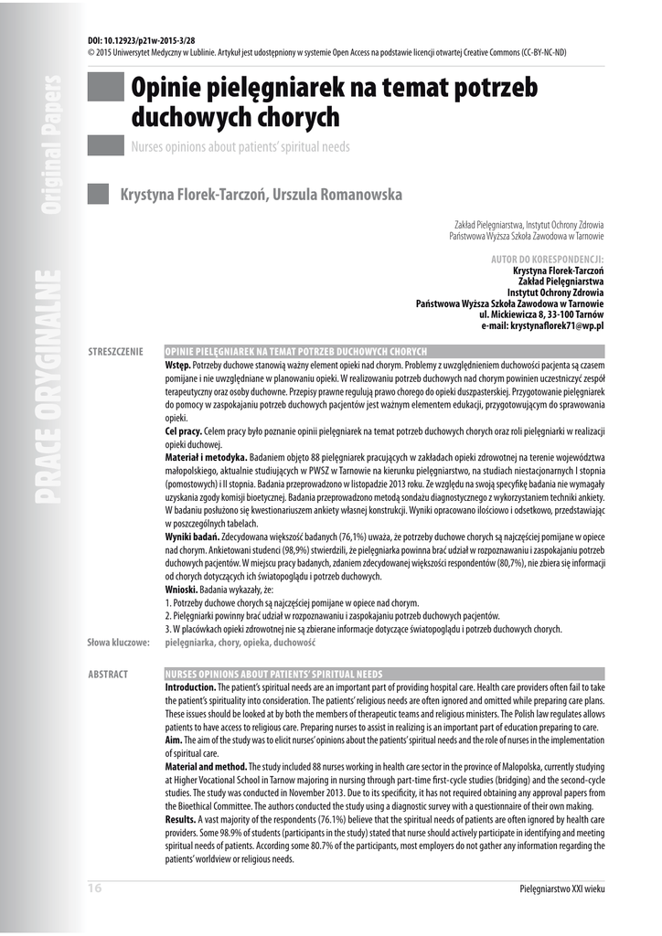 DOI: 10.12923/p21w-2015-3/28 © 2015 Uniwersytet Medyczny w Lublinie. Artykuł jest udostępniony w systemie Open Access na podstawie licencji otwartej Creative Commons (CC-BY-NC-ND) Opinie pielęgniarek na temat potrzeb duchowych chorych Nurses opinions about patients’ spiritual needs Krystyna Florek-Tarczoń, Urszula Romanowska Zakład Pielęgniarstwa, Instytut Ochrony Zdrowia Państwowa Wyższa Szkoła Zawodowa w Tarnowie AUTOR DO KORESPONDENCJI: Krystyna Florek-Tarczoń Zakład Pielęgniarstwa Instytut Ochrony Zdrowia Państwowa Wyższa Szkoła Zawodowa w Tarnowie ul. Mickiewicza 8, 33-100 Tarnów e-mail: [email protected] STRESZCZENIE Słowa kluczowe: ABSTRACT 16 OPINIE PIELĘGNIAREK NA TEMAT POTRZEB DUCHOWYCH CHORYCH Wstęp. Potrzeby duchowe stanowią ważny element opieki nad chorym. Problemy z uwzględnieniem duchowości pacjenta są czasem pomijane i nie uwzględniane w planowaniu opieki. W realizowaniu potrzeb duchowych nad chorym powinien uczestniczyć zespół terapeutyczny oraz osoby duchowne. Przepisy prawne regulują prawo chorego do opieki duszpasterskiej. Przygotowanie pielęgniarek do pomocy w zaspokajaniu potrzeb duchowych pacjentów jest ważnym elementem edukacji, przygotowującym do sprawowania opieki. Cel pracy. Celem pracy było poznanie opinii pielęgniarek na temat potrzeb duchowych chorych oraz roli pielęgniarki w realizacji opieki duchowej. Materiał i metodyka. Badaniem objęto 88 pielęgniarek pracujących w zakładach opieki zdrowotnej na terenie województwa małopolskiego, aktualnie studiujących w PWSZ w Tarnowie na kierunku pielęgniarstwo, na studiach niestacjonarnych I stopnia (pomostowych) i II stopnia. Badania przeprowadzono w listopadzie 2013 roku. Ze względu na swoją specyfikę badania nie wymagały uzyskania zgody komisji bioetycznej. Badania przeprowadzono metodą sondażu diagnostycznego z wykorzystaniem techniki ankiety. W badaniu posłużono się kwestionariuszem ankiety własnej konstrukcji. Wyniki opracowano ilościowo i odsetkowo, przedstawiając w poszczególnych tabelach. Wyniki badań. Zdecydowana większość badanych (76,1%) uważa, że potrzeby duchowe chorych są najczęściej pomijane w opiece nad chorym. Ankietowani studenci (98,9%) stwierdzili, że pielęgniarka powinna brać udział w rozpoznawaniu i zaspokajaniu potrzeb duchowych pacjentów. W miejscu pracy badanych, zdaniem zdecydowanej większości respondentów (80,7%), nie zbiera się informacji od chorych dotyczących ich światopoglądu i potrzeb duchowych. Wnioski. Badania wykazały, że: 1. Potrzeby duchowe chorych są najczęściej pomijane w opiece nad chorym. 2. Pielęgniarki powinny brać udział w rozpoznawaniu i zaspokajaniu potrzeb duchowych pacjentów. 3. W placówkach opieki zdrowotnej nie są zbierane informacje dotyczące światopoglądu i potrzeb duchowych chorych. pielęgniarka, chory, opieka, duchowość NURSES OPINIONS ABOUT PATIENTS’ SPIRITUAL NEEDS Introduction. The patient’s spiritual needs are an important part of providing hospital care. Health care providers often fail to take the patient’s spirituality into consideration. The patients’ religious needs are often ignored and omitted while preparing care plans. These issues should be looked at by both the members of therapeutic teams and religious ministers. The Polish law regulates allows patients to have access to religious care. Preparing nurses to assist in realizing is an important part of education preparing to care. Aim. The aim of the study was to elicit nurses’ opinions about the patients’ spiritual needs and the role of nurses in the implementation of spiritual care. Material and method. The study included 88 nurses working in health care sector in the province of Malopolska, currently studying at Higher Vocational School in Tarnow majoring in nursing through part-time first-cycle studies (bridging) and the second-cycle studies. The study was conducted in November 2013. Due to its specificity, it has not required obtaining any approval papers from the Bioethical Committee. The authors conducted the study using a diagnostic survey with a questionnaire of their own making. Results. A vast majority of the respondents (76.1%) believe that the spiritual needs of patients are often ignored by health care providers. Some 98.9% of students (participants in the study) stated that nurse should actively participate in identifying and meeting spiritual needs of patients. According some 80.7% of the participants, most employers do not gather any information regarding the patients’ worldview or religious needs. Pielęgniarstwo XXI wieku Krystyna Florek-Tarczoń, Urszula Romanowska Key words: Conclusions. Studies have shown that: 1. Spiritual needs of patients are rarely included in care plans. 2. Nurses should participate in identifying and meeting spiritual needs of patients. 3. Health care institutions rarely collect any information about the worldview and spiritual needs of their patients. nurses, the ill, spirituality, care WSTĘP Pacjent w sytuacji choroby oczekuje zarówno intensywnej opieki medycznej, jak i wsparcia duchowego. Opieka duchowa uwzględnia nie tylko religijność człowieka, ale również jego szeroko rozumianą duchowość. Duchowość odwołuje się do pojęć oraz zasad życia, jest utożsamiana z poszukiwaniem sensu życia [1]. W szerszym znaczeniu duchowość to doświadczenie, przeżywanie wartości mających charakter pozamaterialny, stanowiących o ludzkich wewnętrznych rozterkach, które bezpośrednio odnoszą się do sfery duchowej. Opieka duchowa skupia się w dużym stopniu na zagadnieniach poszukiwania znaczenia i sensu ludzkiej egzystencji, a także na pytaniach dotyczących życia i religii. Kierowana jest do wszystkich pacjentów, zarówno wierzących, jak i niewierzących, a także do ich rodzin [2]. Opieka paliatywna zwróciła uwagę na konieczność zaspokajania potrzeb duchowych chorych u kresu życia. Niestety personel medyczny ma trudności w