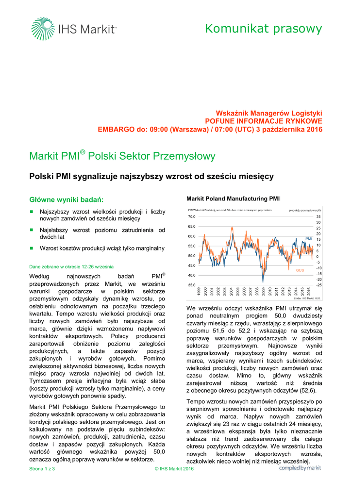 Komunikat prasowy Wskaźnik Managerów Logistyki POFUNE INFORMACJE RYNKOWE EMBARGO do: 09:00 (Warszawa) / 07:00 (UTC) 3 października 2016 Markit PMI® Polski Sektor Przemysłowy Polski PMI sygnalizuje najszybszy wzrost od sześciu miesięcy Główne wyniki badań: Markit Poland Manufacturing PMI Najszybszy wzrost wielkości produkcji i liczby nowych zamówień od sześciu miesięcy Najsłabszy wzrost poziomu zatrudnienia od dwóch lat Wzrost kosztów produkcji wciąż tylko marginalny Dane zebrane w okresie 12-26 września ® Według najnowszych badań PMI przeprowadzonych przez Markit, we wrześniu warunki gospodarcze w polskim sektorze przemysłowym odzyskały dynamikę wzrostu, po osłabieniu odnotowanym na początku trzeciego kwartału. Tempo wzrostu wielkości produkcji oraz liczby nowych zamówień było najszybsze od marca, głównie dzięki wzmożonemu napływowi kontraktów eksportowych. Polscy producenci zaraportowali obniżenie poziomu zaległości produkcyjnych, a także zapasów pozycji zakupionych i wyrobów gotowych. Pomimo zwiększonej aktywności biznesowej, liczba nowych miejsc pracy wzrosła najwolniej od dwóch lat. Tymczasem presja inflacyjna była wciąż słaba (koszty produkcji wzrosły tylko marginalnie), a ceny wyrobów gotowych ponownie spadły. Markit PMI Polskiego Sektora Przemysłowego to złożony wskaźnik opracowany w celu zobrazowania kondycji polskiego sektora przemysłowego. Jest on kalkulowany na podstawie pięciu subindeksów: nowych zamówień, produkcji, zatrudnienia, czasu dostaw i zapasów pozycji zakupionych. Każda wartość głównego wskaźnika powyżej 50,0 oznacza ogólną poprawę warunków w sektorze. Strona 1 z 3 We wrześniu odczyt wskaźnika PMI utrzymał się ponad neutralnym progiem 50,0 dwudziesty czwarty miesiąc z rzędu, wzrastając z sierpniowego poziomu 51,5 do 52,2 i wskazując na szybszą poprawę warunków gospodarczych w polskim sektorze przemysłowym. Najnowsze wyniki zasygnalizowały najszybszy ogólny wzrost od marca, wspierany wynikami trzech subindeksów: wielkości produkcji, liczby nowych zamówień oraz czasu dostaw. Mimo to, główny wskaźnik zarejestrował niższą wartość niż średnia z obecnego okresu pozytywnych odczytów (52,6). Tempo wzrostu nowych zamówień przyspieszyło po sierpniowym spowolnieniu i odnotowało najlepszy wynik od marca. Napływ nowych zamówień zwiększył się 23 raz w ciągu ostatnich 24 miesięcy, a wrześniowa ekspansja była tylko nieznacznie słabsza niż trend zaobserwowany dla całego okresu pozytywnych odczytów. We wrześniu liczba nowych kontraktów eksportowych wzrosła, aczkolwiek nieco wolniej niż miesiąc wcześniej. © IHS Markit 2016 Komunikat prasowy W rezultacie wzmożonego napływu nowych zamówień wielkość produkcji wzrosła w najszybszym tempie od sześciu miesięcy. Polskie firmy obniżyły także poziom zaległości produkcyjnych w szybkim tempie i kontynuowały redukcję zapasów wyrobów gotowych. W celu wsparcia produkcji, polscy wytwórcy zwiększyli we wrześniu aktywność zakupową. Tempo wzrostu było jednak nieznaczne, a zasoby nakładów wciąż się obniżały. Czas dostaw tymczasem wydłużył się, osiągając pięć i półroczny rekord. Polscy producenci dodatkowo wspomagali produkcję, zwiększając zasoby siły roboczej. Obecny rekordowy okres nieprzerwanego tworzenia nowych miejsc pracy wydłużył się do 38 miesięcy. Mimo to, wrześniowe tempo wzrostu było najwolniejsze od ponad dwóch lat. Komentarz: Komentując wyniki badań PMI Polskiego Sektora Przemysłowego, Trevor Balchin, starszy ekonomista IHS Markit i autor raportu powiedział: „We wrześniu warunki w polskim sektorze przemysłowym były najlepsze od sześciu miesięcy. Wskaźnik PMI odzyskał dynamikę wzrostu po niskim wyniku zarejestrowanym w lipcu. Ożywienie zaobserwowane w ciągu ostatnich dwóch miesięcy badań, potwierdziły również oficjalne dane dotyczące wielkości produkcji przemysłowej, wg których wzrosła ona w sierpniu o 9,4% r/r po lipcowym 2,8% spadku. Najnowsze prognozy IHS Markit na rok 2016 przewidują ogólny wzrost zarówno wielkości produkcji jak i PKB o 3,4%.” -Koniec- Presje inflacyjne były wciąż słabe. Pomimo zaraportowanych wyższych cen metali i artykułów spożywczych, ogólne tempo wzrostu kosztów produkcji pozostało na bardzo niskim poziomie. Ponadto, ceny wyrobów gotowych spadły czwarty miesiąc z rzędu. Po dalsze informacje prosimy o kontakt: IHS Markit Trevor Balchin, Senior Economist Telephone +44-1491-461-065 Email [email protected] Joanna Vickers, Corporate Communications Telephone +44207-260-2234 Email [email protected] Uwagi na temat danych: Polski Wskaźnik PMI® Sektora Przemysłowego (Wskaźnik Managerów Logistyki) opracowuje firma Markit. Raport opiera się na oryginalnych danych zebranych od reprezentatywnego panelu ponad 200 firm z polskiego sektora przemysłowego. Grupa respondentów ustalana jest w oparciu o udział branży w PKB i poziom zatrudnienia. Odpowiedzi uzyskane podczas badania odzwierciedlają ewentualne zmiany w bieżącym miesiącu w porównaniu z miesiącem poprzednim, opierając się na danych zebranych w połowie miesiąca. Dla każdego wskaźnika raport podaje procent respondentów udzielających każdą odpowiedź, różnicę netto pomiędzy ilością odpowiedzi wyższy/lepszy, a odpowiedzi niższy/gorszy oraz wskaźnik „dyfuzji”. Wskaźnik jest sumą pozytywnych odpowiedzi plus połową odpowiedzi, które są „takie same”. Wskaźniki dyfuzji mają właściwości wskaźników głównych i stanowią wygodny zbiorczy sposób określania przeważającego kierunku zmian. Wartość wskaźnika powyżej 50 oznacza całkowity wzrost zmiennej, a wartość poniżej 50 całkowity spadek. Markit nie koryguje podstawowych danych z badań po pierwszej publikacji, ale czynniki sezonowe mogą czasami, w razie potrzeby ulec zmianie, która będzie miała wpływ na sezonowe serie danych. Dane histo