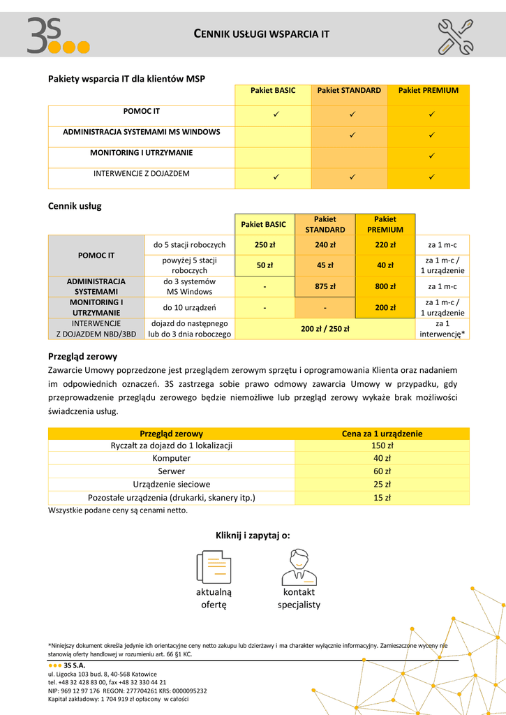 CENNIK USŁUGI WSPARCIA IT Pakiety wsparcia IT dla klientów MSP Pakiet BASIC POMOC IT Pakiet STANDARD ADMINISTRACJA SYSTEMAMI MS WINDOWS Pakiet PREMIUM MONITORING I UTRZYMANIE INTERWENCJE Z DOJAZDEM Cennik usług do 5 stacji roboczych POMOC IT ADMINISTRACJA SYSTEMAMI MONITORING I UTRZYMANIE INTERWENCJE Z DOJAZDEM NBD/3BD Pakiet BASIC Pakiet STANDARD Pakiet PREMIUM 250 zł 240 zł 220 zł za 1 m-c 50 zł 45 zł 40 zł za 1 m-c / 1 urządzenie - 875 zł 800 zł za 1 m-c - - 200 zł powyżej 5 stacji roboczych do 3 systemów MS Windows do 10 urządzeń dojazd do następnego lub do 3 dnia roboczego 200 zł / 250 zł za 1 m-c / 1 urządzenie za 1 interwencję* Przegląd zerowy Zawarcie Umowy poprzedzone jest przeglądem zerowym sprzętu i oprogramowania Klienta oraz nadaniem im odpowiednich oznaczeń. 3S zastrzega sobie prawo odmowy zawarcia Umowy w przypadku, gdy przeprowadzenie przeglądu zerowego będzie niemożliwe lub przegląd zerowy wykaże brak możliwości świadczenia usług. Przegląd zerowy Ryczałt za dojazd do 1 lokalizacji Komputer Serwer Urządzenie sieciowe Pozostałe urządzenia (drukarki, skanery itp.) Cena za 1 urządzenie 150 zł 40 zł 60 zł 25 zł 15 zł Wszystkie podane ceny są cenami netto. Kliknij i zapytaj o: aktualną ofertę kontakt specjalisty *Niniejszy dokument określa jedynie ich orientacyjne ceny netto zakupu lub dzierżawy i ma charakter wyłącznie informacyjny. Zamieszczone wyceny nie stanowią oferty handlowej w rozumieniu art. 66 §1 KC. ●●● 3S S.A. ul. Ligocka 103 bud. 8, 40-568 Katowice tel. +48 32 428 83 00, fax +48 32 330 44 21 NIP: 969 12 97 176 REGON: 277704261 KRS: 0000095232 Kapitał zakładowy: 1 704 919 zł opłacony w całości