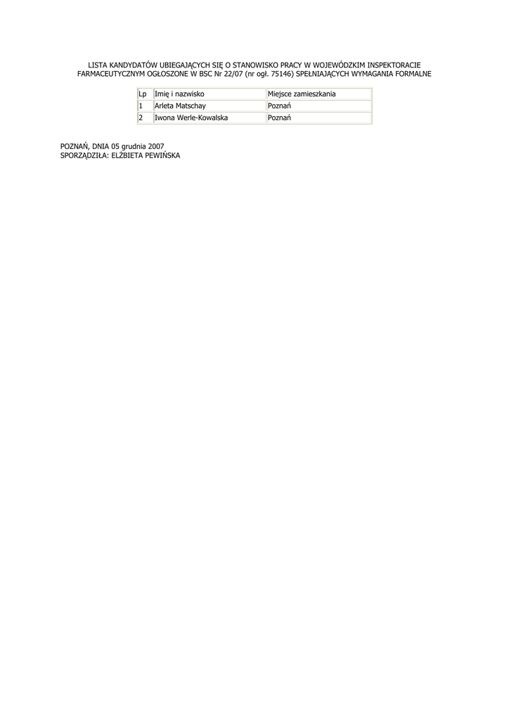 LISTA KANDYDATÓW UBIEGAJĄCYCH SIĘ O STANOWISKO PRACY W WOJEWÓDZKIM INSPEKTORACIE FARMACEUTYCZNYM OGŁOSZONE W BSC Nr 22/07 (nr ogł. 75146) SPEŁNIAJĄCYCH WYMAGANIA FORMALNE Lp Imię i nazwisko Miejsce zamieszkania 1 Arleta Matschay Poznań 2 Iwona Werle-Kowalska Poznań POZNAŃ, DNIA 05 grudnia 2007 SPORZĄDZIŁA: ELśBIETA PEWIŃSKA