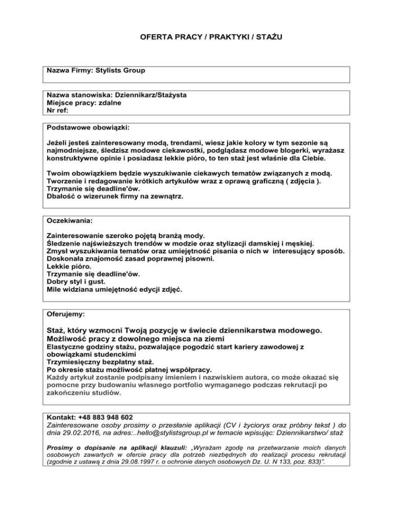 OFERTA PRACY / PRAKTYKI / STAŻU Nazwa Firmy: Stylists Group Nazwa stanowiska: Dziennikarz/Stażysta Miejsce pracy: zdalne Nr ref: Podstawowe obowiązki: Jeżeli jesteś zainteresowany modą, trendami, wiesz jakie kolory w tym sezonie są najmodniejsze, śledzisz modowe ciekawostki, podglądasz modowe blogerki, wyrażasz konstruktywne opinie i posiadasz lekkie pióro, to ten staż jest właśnie dla Ciebie. Twoim obowiązkiem będzie wyszukiwanie ciekawych tematów związanych z modą. Tworzenie i redagowanie krótkich artykułów wraz z oprawą graficzną ( zdjęcia ). Trzymanie się deadline'ów. Dbałość o wizerunek firmy na zewnątrz. Oczekiwania: Zainteresowanie szeroko pojętą branżą mody. Śledzenie najświeższych trendów w modzie oraz stylizacji damskiej i męskiej. Zmysł wyszukiwania tematów oraz umiejętność pisania o nich w interesujący sposób. Doskonała znajomość zasad poprawnej pisowni. Lekkie pióro. Trzymanie się deadline'ów. Dobry styl i gust. Mile widziana umiejętność edycji zdjęć. Oferujemy: Staż, który wzmocni Twoją pozycję w świecie dziennikarstwa modowego. Możliwość pracy z dowolnego miejsca na ziemi Elastyczne godziny stażu, pozwalające pogodzić start kariery zawodowej z obowiązkami studenckimi Trzymiesięczny bezpłatny staż. Po okresie stażu możliwość płatnej współpracy. Każdy artykuł zostanie podpisany imieniem i nazwiskiem autora, co może okazać się pomocne przy budowaniu własnego portfolio wymaganego podczas rekrutacji po zakończeniu studiów. Kontakt: +48 883 948 602 Zainteresowane osoby prosimy o przesłanie aplikacji (CV i życiorys oraz próbny tekst ) do dnia 29.02.2016, na adres:[email protected] w temacie wpisując: Dziennikarstwo/ staż Prosimy o dopisanie na aplikacji klauzuli: „Wyrażam zgodę na przetwarzanie moich danych osobowych zawartych w ofercie pracy dla potrzeb niezbędnych do realizacji procesu rekrutacji (zgodnie z ustawą z dnia 29.08.1997 r. o ochronie danych osobowych Dz. U. N 133, poz. 833)”.