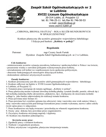 Zespół Szkół Ogólnokształcących nr 2 w Lublinie XVIII Liceum Ogólnokształcące 20-314 Lublin, ul. Przyjaźni 12 tel. 81 746-25-11 tel./fax 81 746-50-53 e-mail: [email protected] www.zsonr2.lublin.pl „ CHRONIĄ, BRONIĄ I RATUJĄ” - ROLA SŁUŻB MUNDUROWYCH W SPOŁECZEŃSTWIE” Konkurs plastyczny dla uczniów gimnazjów województwa lubelskiego I Edycja pod hasłem: „Kobiety w policji.” Regulamin Patronat: mgr Cezary Jacek Furtak Dyrektor Zespołu Szkół Ogólnokształcących nr 2 w Lublinie. Cele konkursu: - zainteresowanie uczniów sytuacją zawodową, kulturową i społeczną kobiet w Polsce i na świecie, - poszerzenie wiedzy o zawodzie policjanta wykonywanym przez kobiety, - uświadomienie roli kobiet we współczesnym życiu społeczno-politycznym, - zburzenie funkcjonujących stereotypów dotyczących kobiet, - doskonalenie zdolności artystycznych uczniów. Zasady konkursu: 1. Konkurs przeznaczony jest dla uczniów szkół gimnazjalnych województwa lubelskiego. 2. Konkurs odbywać się będzie w XVIII Liceum Ogólnokształcącym w Lublinie, ul Przyjaźni 12. 3. Tematem pracy nawiązuje do tematu ogólnego; „Kobiety w policji”. 4. Pracę plastyczną można wykonać dowolną techniką płaską: rysunek (kredki, pastele, ołówek itp.) lub techniką malarską (farby akwarelowe, plakatowe, itp.). Zachęcamy do stosowania techniki collage’u, jako bardzo odpowiedniej do realizacji tematu konkursu. 5. Praca powinna mieć format A3. 6. Praca powinna być czytelnie opisana (na odwrocie): imię i nazwisko oraz wiek autora ( klasa ), imię i nazwisko nauczyciela pod którego kierunkiem praca została wykonana, nazwa i adres szkoły (wzór opisu pracy w załączeniu). 7. Prace konkursowe nie będą zwracane i przechodzą na własność organizatora konkursu. 8. Oceny prac dokona Jury powołane przez organizatorów. 9. Zwycięzcy konkursu otrzymają nagrody i dyplomy. 10. Konkurs ma charakter jednoetapowy. Kryteria oceny prac: 1. Zgodność pracy z tematem konkursu. 2. Trafność i oryginalność przekazu. 3. Walory artystyczne i oryginalna, plastyczna interpretacja tematu. Informacje dodatkowe Opisane prace plastyczne należy dostarczyć w terminie 10. 05. 2016 do sekretariatu szkoły lub wysłać na adres: XVIII Liceum Ogólnokształcące ul. Przyjaźni 12 20-314 Lublin Ogłoszenie wyników nastąpi 23.05.2016 r na stronie internetowej szkoły www.zsonr2.lublin.pl . Podsumowanie konkursu i nagrodzenie laureatów nastąpi 09.06. 2016 r. w XVIII Liceum Ogólnokształcącym w Lublinie. Organizator zastrzega sobie prawo do publikowania i prezentacji prac konkursowych w materiałach związanych z konkursem. Nadesłanie prac konkursowych jest równoważne z przyjęciem warunków regulaminu i oświadczeniem, że prace zgłoszone na konkurs zostały wykonane osobiście, z zachowaniem wszelkich praw autorskich osób trzecich, jednocześnie nie były zgłaszane do innych konkursów. Zgłoszone prace będą eksponowane na wystawie pokonkursowej w budynku Zespołu Szkół Ogólnokształcących nr 2 w Lublinie oraz na stronie internetowej szkoły; www.zsonr2.lublin.pl . Uczestnik wyraża zgodę na przetwarzanie danych osobowych na potrzeby konkursu zgodnie z przepisami ustawy z dnia 29 sierpnia 1997 r. o ochronie danych osobowych (Dz.U.1997 nr133, z późn.zm). Koordynatorzy konkursu: mgr Agnieszka Kieracińska -Wacko mgr Iwona Langiewicz mgr Grażyna Wójcik-Josicz Zapraszamy do udziału w konkursie! Załącznik nr 1 Wzór opisu pracy plastycznej ( do przyklejenia na odwrocie każdej pracy) imię i nazwisko autora pracy …......................................................................... tytuł pracy …...................................................................................................... wiek/klasa …................................................................................................... technika plastyczna …....................................................................................... nazwa szkoły/ placówki,.................................................................................... adres/ telefon/fax, e-mail …............................................................................... imię i nazwisko nauczyciela ….......................................................................... Wyrażam zgodę na przetwarzanie danych osobowych na potrzeby konkursu zgodnie z przepisami ustawy z dnia 29 sierpnia 1997 r. o ochronie danych osobowych (Dz.U.1997 nr133, z późn.zm). Lublin, dn. …........................... …........................................................ (podpis rodzica / prawnego opiekuna)