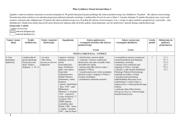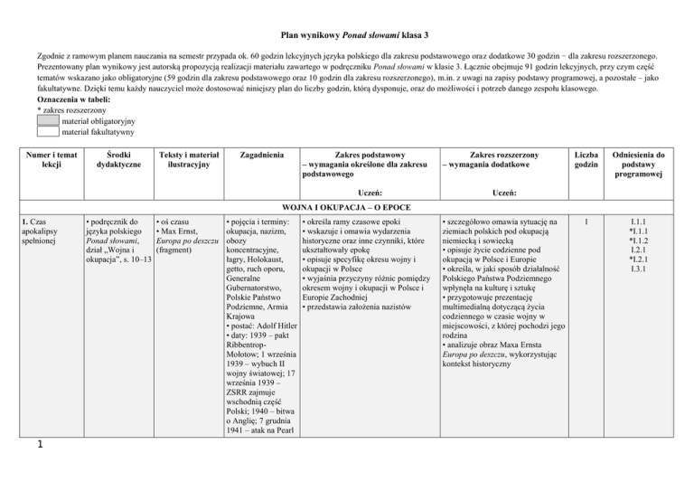 Plan wynikowy Ponad słowami klasa 3 Zgodnie z ramowym planem nauczania na semestr przypada ok. 60 godzin lekcyjnych języka polskiego dla zakresu podstawowego oraz dodatkowe 30 godzin − dla zakresu rozszerzonego. Prezentowany plan wynikowy jest autorską propozycją realizacji materiału zawartego w podręczniku Ponad słowami w klasie 3. Łącznie obejmuje 91 godzin lekcyjnych, przy czym część tematów wskazano jako obligatoryjne (59 godzin dla zakresu podstawowego oraz 10 godzin dla zakresu rozszerzonego), m.in. z uwagi na zapisy podstawy programowej, a pozostałe – jako fakultatywne. Dzięki temu każdy nauczyciel może dostosować niniejszy plan do liczby godzin, którą dysponuje, oraz do możliwości i potrzeb danego zespołu klasowego. Oznaczenia w tabeli: * zakres rozszerzony materiał obligatoryjny materiał fakultatywny Numer i temat lekcji Środki dydaktyczne Teksty i materiał ilustracyjny Zagadnienia Zakres podstawowy – wymagania określone dla zakresu podstawowego Uczeń: Zakres rozszerzony – wymagania dodatkowe Liczba godzin Odniesienia do podstawy programowej 1 I.1.1 *I.1.1 *I.1.2 I.2.1 *I.2.1 I.3.1 Uczeń: WOJNA I OKUPACJA – O EPOCE 1. Czas apokalipsy spełnionej 1 • podręcznik do języka polskiego Ponad słowami, dział „Wojna i okupacja”, s. 10–13 • oś czasu • Max Ernst, Europa po deszczu (fragment) • pojęcia i terminy: okupacja, nazizm, obozy koncentracyjne, łagry, Holokaust, getto, ruch oporu, Generalne Gubernatorstwo, Polskie Państwo Podziemne, Armia Krajowa • postać: Adolf Hitler • daty: 1939 – pakt RibbentropMołotow; 1 września 1939 – wybuch II wojny światowej; 17 września 1939 – ZSRR zajmuje wschodnią część Polski; 1940 – bitwa o Anglię; 7 grudnia 1941 – atak na Pearl • określa ramy czasowe epoki • wskazuje i omawia wydarzenia historyczne oraz inne czynniki, które ukształtowały epokę • opisuje specyfikę okresu wojny i okupacji w Polsce • wyjaśnia przyczyny różnic pomiędzy okresem wojny i okupacji w Polsce i Europie Zachodniej • przedstawia założenia nazistów • szczegółowo omawia sytuację na ziemiach polskich pod okupacją niemiecką i sowiecką • opisuje życie codzienne pod okupacją w Polsce i Europie • określa, w jaki sposób działalność Polskiego Państwa Podziemnego wpłynęła na kulturę i sztukę • przygotowuje prezentację multimedialną dotyczącą życia codziennego w czasie wojny w miejscowości, z której pochodzi jego rodzina • analizuje obraz Maxa Ernsta Europa po deszczu, wykorzystując kontekst historyczny Harbor, Stany Zjednoczone przystępują do wojny; 1942 – bitwa o Stalingrad; 19 kwietnia 1943 – wybuch powstania w getcie warszawskim; 6 czerwca 1944 – lądowanie aliantów w Normandii; 1 sierpnia 1944 – wybuch powstania warszawskiego; 4–11 lutego 1945 – konferencja w Jałcie, na której przedstawiciele USA, ZSRR i Wielkiej Brytanii ustalają powojenny porządek polityczny w Europie; 8 maja 1945 – zakończenie II wojny światowej w Europie; 6 i 9 sierpnia 1945 – Amerykanie zrzucają bomby atomowe na Hiroszimę i Nagasaki; 2 września 1945 − Japonia podpisuje kapitulację; 1947 – po sfałszowanych wyborach komuniści przejmują władzę w Polsce 2. Ćwiczenia maturalne – czytanie ze zrozumieniem 2 • podręcznik do języka polskiego Ponad słowami, dział „Wojna i • Marcin Jakimowicz, Słoik pełen życia (fragmenty) • czyta ze zrozumieniem tekst nieliteracki • formułuje odpowiedzi na pytania do tekstu na podstawie wskazówek 1 I.1.1 I.1.2 okupacja”, s. 47–50 • Ks. Stanisław Musiał, Ordynator oddziału konających dzieci (fragmenty) 3. Sztuka wobec wojny • podręcznik do języka polskiego Ponad słowami, dział „Wojna i okupacja”, s. 14– 16, 26 4. Ćwiczenia • podręcznik do maturalne – języka polskiego wypowiedź ustna Ponad słowami, dział „Wojna i okupacja”, s. 57–58 • Polski plakat propagandowy z 1939 r. • Joe Rosenthal, zdjęcie przedstawiające zdobycie Iwo Jimy 23 lutego 1945 r. • Bronisław Wojciech Linke, Plucha • Andrzej Wróblewski, obrazy z cyklu Rozstrzelanie • pojęcia i terminy: wojenna agitacja, propaganda, sztuka ulotna, artystyczny hołd • postacie: Bronisław Wojciech Linke, Andrzej Wróblewski, Alina Szapocznikow, Charlie Chaplin • Miron Białoszewski, Pamiętnik z powstania warszawskiego (fragmenty) • prezentuje specyfikę wojennej sztuki propagandowej i agitacyjnej • przedstawia różnice w dostępie do kultury pomiędzy Polską a Europą Zachodnią okresu okupacji • omawia tematykę dzieł sztuki okresu wojennego i powojennego • interpretuje obraz Bronisława Wojciecha Linkego Plucha, wykorzystując szerokie konteksty • określa, w jaki sposób wojna wpłynęła na rozwój sztuki i sytuację artystów • omawia dorobek Bronisława Wojciecha Linkego bądź Andrzeja Wróblewskiego • orientuje się w twórczości muzycznej okresu wojny i okupacji • omawia film Charlie’ego Chaplina Dyktator • interpretuje kadr z filmu Dyktator w kontekście historycznym • wypowiada się na temat roli humoru i satyry w twórczości artystów pokolenia wojny i okupacji na podstawie samodzielnie wybranych polskich rysunków satyrycznych • przedstawia, jak funkcjonował teatr w czasie wojny • analizuje temat wypowiedzi ustnej • wybiera i interpretuje odpowiedni materiał literacki • wygłasza uporządkowaną wypowiedź, dbając o formę językową 1 I.1.1 *I.1.1 I.1.2 I.2.1 II.1.1 II.1.2 II.1.3 II.3.1 II.3.2 II.3.4 1 I.1.1 II.1.2 II.2.1 (gimnazjum) II.3.1 III.1.1 (gimnazjum) III.1.1 III.1.3 III.1.4 2 II.1.1 II.1.2 II.1.3 II.2.1 II.2.2 II.2.4 II.3.1 WOJNA I OKUPACJA – TEKSTY Z EPOKI 5. i 6. Stracone pokolenie – o wierszach Krzysztofa Kamila Baczyńskiego 3 • podręcznik do języka polskiego Ponad słowami, dział „Wojna i okupacja”, s. 18– 20, 43 • Krzysztof Kamil Baczyński, Pokolenie, *** [Niebo złote ci otworzę] • Lori Nix, Bibliot