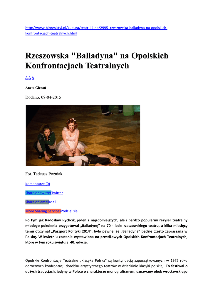 http://www.biznesistyl.pl/kultura/teatr-i-kino/2995_rzeszowska-balladyna-na-opolskichkonfrontacjach-teatralnych.html Rzeszowska "Balladyna" na Opolskich Konfrontacjach Teatralnych AAA Aneta Gieroń Dodano: 08-04-2015 Fot. Tadeusz Poźniak Komentarze (0) Share on twitterTwitter Share on emailMail More Sharing ServicesPodziel się Po tym jak Radosław Rychcik, jeden z najzdolniejszych, ale i bardzo popularny reżyser teatralny młodego pokolenia przygotował „Balladynę” na 70 - lecie rzeszowskiego teatru, a kilka miesięcy temu otrzymał „Paszport Polityki 2014”, było pewne, że „Balladyna” będzie często zapraszana w Polskę. W kwietniu zostanie wystawiona na prestiżowych Opolskich Konfrontacjach Teatralnych, które w tym roku świętują 40. edycję. Opolskie Konfrontacje Teatralne „Klasyka Polska” są kontynuacją zapoczątkowanych w 1975 roku dorocznych konfrontacji dorobku artystycznego teatrów w dziedzinie klasyki polskiej. To festiwal o dużych tradycjach, jedyny w Polsce o charakterze monograficznym, uznawany obok wrocławskiego „Dialogu” i toruńskiego „Kontaktu”, za jeden z najważniejszych festiwali teatralnych w Polsce. Festiwal klasyki co roku gości świetnych twórców i najlepsze spektakle z całego kraju. Wierne realizacje klasyki są tu konfrontowane z eksperymentalnymi interpretacjami tego repertuaru. Na opolskim festiwalu prezentowali się tak wybitni twórcy jak: Jerzy Grzegorzewski, Krystian Lupa czy Andrzej Wajda, ale też młodzi, dopiero rozpoczynający swą teatralną karierę, m.in. Anna Augustynowicz, Grzegorz Jarzyna, Marek Fiedor, Paweł Passini, Michał Zadara, czy Jan Klata. W tym roku także „Balladyna" Juliusza Słowackiego w reżyserii Radosława Rychcika została zaproszona na festiwal Opolskie Konfrontacje Teatralne. Wcześniej rzeszowski teatr był tam tylko trzykrotnie. W 2007 roku w ramach imprez towarzyszących prezentowana była „Matka Courage i jej dzieci" Bertolta Brechta w reż. Katarzyny Deszcz. Spektakl był prezentowany poza konkursem - w ramach prezentacji najlepszych inscenizacji klasyki europejskiej z ostatniego sezonu. W 1981 roku w ramach konkursu Opolskich Konfrontacji Teatralnych Teatr im. Wandy Siemaszkowej zaprezentował „Pastorałkę" Leona Schillera w reżyserii Leszka Czarnoty, zaś w 1975 roku na pierwszych Konfrontacjach wystawiany był spektakl "Szewcy" w reż. Stanisława Wieszczyckiego. „Balladyna" wyreżyserowana przez Rychcika w Teatrze im. W. Siemaszkowej, to jak mówi sam reżyser: historia zbrodni, winy i kary, której bohaterkami są kobiety. Osadzona w kontekście I wojny światowej, wielkiej wojny z lat 1914-1918, której 100-lecie niedawno obchodziliśmy, jest opowieścią o praźródłach XX w. jako epoki wojen i rodzącego się ruchu emancypacji kobiet. „Balladyna" opowiada o walce, o pojedynku, o konfrontacji, która rodzi nowe formy. To wojna o terytorium, w której siostra zabija siostrę, córka wygania matkę, żona morduje męża. To czas, kiedy kobiety walczą o prawo do głosowania. I jak to u Rychcika, reżyser pełnymi garściami czerpie z amerykańskiej popkultury. Czy słusznie i udanie?! Jak w przypadku większości artystycznych eksperymentów zdania są podzielone. Na pewno jednak spektakl wart jest obejrzenia. Tagi: Balladyna, Radosław Rychcik, Opolskie Konfrontacje Teatralne