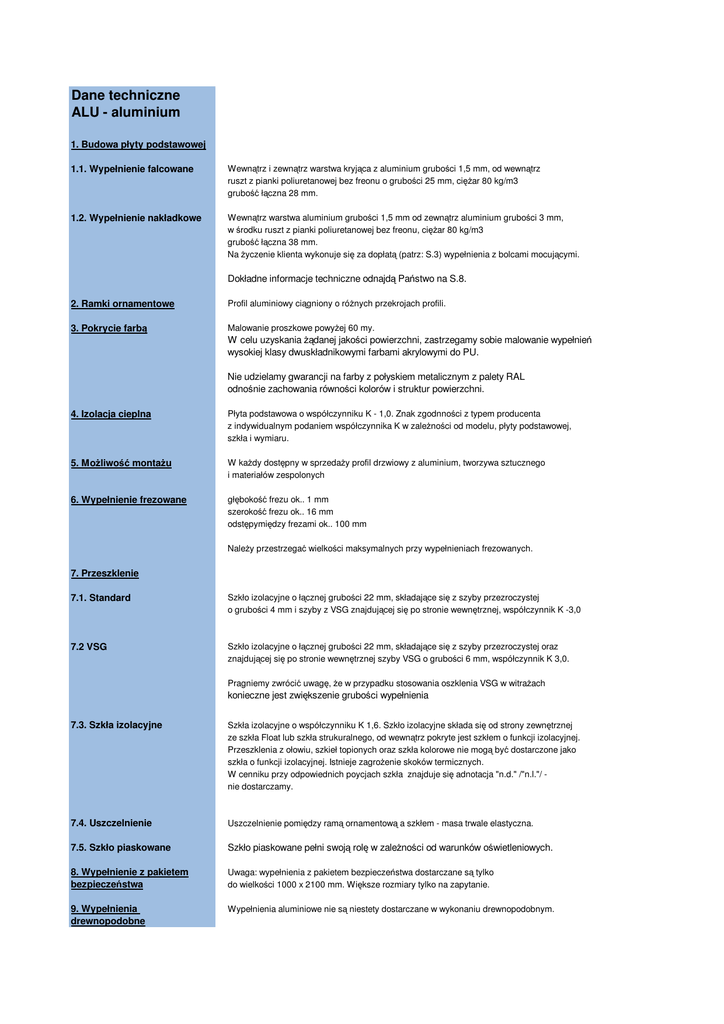 Dane techniczne ALU - aluminium 1. Budowa płyty podstawowej 1.1. Wypełnienie falcowane Wewn trz i zewn trz warstwa kryj ca z aluminium grubo ci 1,5 mm, od wewn trz ruszt z pianki poliuretanowej bez freonu o grubo ci 25 mm, ci ar 80 kg/m3 grubo ł czna 28 mm. 1.2. Wypełnienie nakładkowe Wewn trz warstwa aluminium grubo ci 1,5 mm od zewn trz aluminium grubo ci 3 mm, w rodku ruszt z pianki poliuretanowej bez freonu, ci ar 80 kg/m3 grubo ł czna 38 mm. Na yczenie klienta wykonuje si za dopłat (patrz: S.3) wypełnienia z bolcami mocuj cymi. Dokładne informacje techniczne odnajd Pa stwo na S.8. 2. Ramki ornamentowe Profil aluminiowy ci gniony o ró nych przekrojach profili. 3. Pokrycie farb Malowanie proszkowe powy ej 60 my. W celu uzyskania danej jako ci powierzchni, zastrzegamy sobie malowanie wypełnie wysokiej klasy dwuskładnikowymi farbami akrylowymi do PU. Nie udzielamy gwarancji na farby z połyskiem metalicznym z palety RAL odno nie zachowania równo ci kolorów i struktur powierzchni. 4. Izolacja cieplna Płyta podstawowa o współczynniku K - 1,0. Znak zgodnno ci z typem producenta z indywidualnym podaniem współczynnika K w zale no ci od modelu, płyty podstawowej, szkła i wymiaru. 5. Mo liwo W ka dy dost pny w sprzeda y profil drzwiowy z aluminium, tworzywa sztucznego i materiałów zespolonych monta u 6. Wypełnienie frezowane gł boko frezu ok.. 1 mm szeroko frezu ok.. 16 mm odst pymi dzy frezami ok.. 100 mm Nale y przestrzega wielko ci maksymalnych przy wypełnieniach frezowanych. 7. Przeszklenie 7.1. Standard Szkło izolacyjne o ł cznej grubo ci 22 mm, składaj ce si z szyby przezroczystej o grubo ci 4 mm i szyby z VSG znajduj cej si po stronie wewn trznej, współczynnik K -3,0 7.2 VSG Szkło izolacyjne o ł cznej grubo ci 22 mm, składaj ce si z szyby przezroczystej oraz znajduj cej si po stronie wewn trznej szyby VSG o grubo ci 6 mm, współczynnik K 3,0. Pragniemy zwróci uwag , e w przypadku stosowania oszklenia VSG w witra ach konieczne jest zwi kszenie grubo ci wypełnienia 7.3. Szkła izolacyjne Szkła izolacyjne o współczynniku K 1,6. Szkło izolacyjne składa si od strony zewn trznej ze szkła Float lub szkła strukuralnego, od wewn trz pokryte jest szkłem o funkcji izolacyjnej. Przeszklenia z ołowiu, szkieł topionych oraz szkła kolorowe nie mog by dostarczone jako szkła o funkcji izolacyjnej. Istnieje zagro enie skoków termicznych. W cenniku przy odpowiednich poycjach szkła znajduje si adnotacja "n.d." /"n.l."/ nie dostarczamy. 7.4. Uszczelnienie Uszczelnienie pomi dzy ram ornamentow a szkłem - masa trwale elastyczna. 7.5. Szkło piaskowane Szkło piaskowane pełni swoj rol w zale no ci od warunków o wietleniowych. 8. Wypełnienie z pakietem bezpiecze stwa Uwaga: wypełnienia z pakietem bezpiecze stwa dostarczane s tylko do wielko ci 1000 x 2100 mm. Wi ksze rozmiary tylko na zapytanie. 9. Wypełnienia drewnopodobne Wypełnienia aluminiowe nie s niestety dostarczane w wykonaniu drewnopodobnym. 10. Efekt pod wietlenia Wypełnienia z efektem o wietlenia zaprezentowane w ofercie wyposa one s w moduły diod elektroluminescencyjnych. W przypdku wi kszo ci modeli moduły te zamontowane s bezpo rednio w szkle izolacyjnym. W modelach Actio, Lys i Tera moduły elektroluminescencyjne umieszczone s poza oszkleniem. Moduły elektroluminescencyjne s wyposa one wewn trz oszklenia w wiatłomierz, sterowany przez transformator (nightmatic). Ł cznie z dostaw otrzymuj Pa stwo zacisk przewodu, 1 kabel (3- yłowy) z wtyczk , transformator 24 V oraz instrukcj monta u Przył cze elektryczne musi by wykonane we własnym zakresie. Po redni efekt o wietlenia nie nadaje si do o wietlania wej cia do domu. 11. Oznaczenie zgodno ci z typem producenta Wskazówki ogólne Podane ceny s cenami netto. Nale y doliczy do nich aktualnie obowi zuj cy podatek VAT Tranport dokonywany jest wg yczenia przez spedycj . Mo liwy jest odbiór własny po wcze niejszym uzgodnieniu. Koszty transportu ponosi Kupuj cy. Zmiany w zamówieniu s mo liwe tylko 1 dzie po wpłyni ciu zamówienia. Obowi zuj nasze warunki sprzeda y i dostaw. Zastrzegamy sobie prawo dokonywania zmian. Dane techniczne ALU - aluminium 1. Wypełnienia nakładkowe 1.1. Dane techniczne Wewn trz warstwa aluminium grubo ci 1,5 mm od zewn trz aluminium grubo ci 3 mm, w rodku ruszt z pianki poliuretanowej bez freonu, ci ar 80 kg/m3 grubo ł czna 38 mm. Nale y zwróci uwag na gł boko listwy do oszklenia w zastosowanym profilu. Na yczenie klienta wykonuje si za dopłat (patrz: S.3) wypełnienia z bolcami mocuj cymi. 1.2. Wskazówki do monta u Poni ej przedstawiamy wskazówki do monta u: 1. Przyci w garek do oszklenia przy profilu skrzydła ok.. 5 mm. 2. Wypełnienie uło y na stole roboczym przedni ochranian stron . 3. Wyczy ci i lekko wyszlifowa płyt nakładkow wypełnienia oraz pozostał cz przedniej strony skrzydła. 4. Nanie na płyt nakładkow klej długotrwale elastyczny do PU (np.. Sikka-Flex 221) 5. Poło y skrzydło przedni stron na płyt nakładkow , wyrówna i przymocowa zaciskami. 6. Wypełnienie obło y klinami po przek tnej. 7. Szpar pomi dzy wypełnieniam a profilem skrzydła wypełni całkowicie piank monta ow nie wywieraj c nacisku. 8. Po wyschni ciu pianki monta owej przyczepi listwy do szkła. 9. Zgodnie z wymaganiami wywierci otwory do cylindrów profili lub mocowa pochwytu. 1.3. Szczegóły W przypdku drzwi ze skrzydłem bocznym nale y uwzgl dni ró ne mo liwo ci uło enia ramek ornamentowych. Na specjalne yczenie mog Pa stwo otrzyma od naszych przedstawicieli handlowych odpowiednie rysunki z ró nymi wariantami 1.4. Arkusz wymiarów Na ostatniej stronie cennika znajd Pa stwo arkusz wymiarów wypełnienia nakładkowego. Aby unikn nieporozumie , prosimy z ka dym zamówieniem przysyła wypełniony arkusz. W przypadku niejasno ci prosimy o przesłanie szkicu przekroju poprzecznego stosowanego przez Pa stwa profilu.