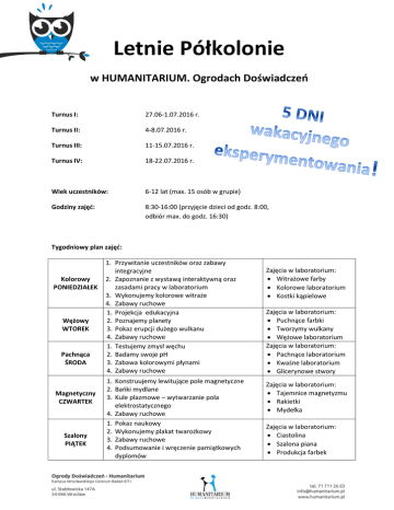 OFERTA Półkolonii Letnich 2016 - Humanitarium