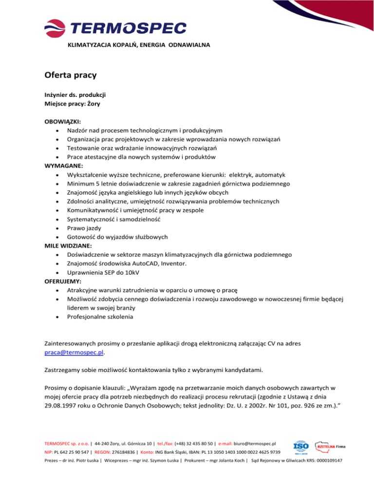 KLIMATYZACJA KOPALŃ, ENERGIA ODNAWIALNA Oferta pracy Inżynier ds. produkcji Miejsce pracy: Żory OBOWIĄZKI: Nadzór nad procesem technologicznym i produkcyjnym Organizacja prac projektowych w zakresie wprowadzania nowych rozwiązań Testowanie oraz wdrażanie innowacyjnych rozwiązań Prace atestacyjne dla nowych systemów i produktów WYMAGANE: Wykształcenie wyższe techniczne, preferowane kierunki: elektryk, automatyk Minimum 5 letnie doświadczenie w zakresie zagadnień górnictwa podziemnego Znajomość języka angielskiego lub innych języków obcych Zdolności analityczne, umiejętność rozwiązywania problemów technicznych Komunikatywność i umiejętność pracy w zespole Systematyczność i samodzielność Prawo jazdy Gotowość do wyjazdów służbowych MILE WIDZIANE: Doświadczenie w sektorze maszyn klimatyzacyjnych dla górnictwa podziemnego Znajomość środowiska AutoCAD, Inventor. Uprawnienia SEP do 10kV OFERUJEMY: Atrakcyjne warunki zatrudnienia w oparciu o umowę o pracę Możliwość zdobycia cennego doświadczenia i rozwoju zawodowego w nowoczesnej firmie będącej liderem w swojej branży Profesjonalne szkolenia Zainteresowanych prosimy o przesłanie aplikacji drogą elektroniczną załączając CV na adres [email protected]. Zastrzegamy sobie możliwość kontaktowania tylko z wybranymi kandydatami. Prosimy o dopisanie klauzuli: „Wyrażam zgodę na przetwarzanie moich danych osobowych zawartych w mojej ofercie pracy dla potrzeb niezbędnych do realizacji procesu rekrutacji (zgodnie z Ustawą z dnia 29.08.1997 roku o Ochronie Danych Osobowych; tekst jednolity: Dz. U. z 2002r. Nr 101, poz. 926 ze zm.).” TERMOSPEC sp. z o.o. | 44-240 Żory, ul. Górnicza 10 | tel./fax: (+48) 32 435 80 50 | e-mail: [email protected] NIP: PL 642 25 90 547 | REGON: 276184836 | Konto: ING Bank Śląski, IBAN: PL 13 1050 1403 1000 0022 4625 9739 Prezes – dr inż. Piotr Łuska | Wiceprezes – mgr inż. Szymon Łuska | Prokurent – mgr Jolanta Koch | Sąd Rejonowy w Gliwicach KRS: 0000109147