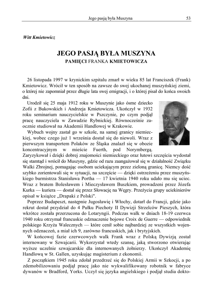 Jego pasją była Muszyna 53 Witt Kmietowicz JEGO PASJĄ BYŁA MUSZYNA PAMIĘCI FRANKA KMIETOWICZA 26 listopada 1997 w krynickim szpitalu zmarł w wieku 85 lat Franciszek (Frank) Kmietowicz. Wrócił w ten sposób na zawsze do swej ukochanej muszyńskiej ziemi, o której nie zapomniał przez długie lata swej emigracji, i o której pisał do końca swoich dni. Urodził się 25 maja 1912 roku w Muszynie jako ósme dziecko Zofii z Bukowskich i Andrzeja Kmietowicza. Ukończył w 1932 roku seminarium nauczycielskie w Pszczynie, po czym podjął pracę nauczyciela w Zawadzie Rybnickiej. Równocześnie zaocznie studiował na Akademii Handlowej w Krakowie. Wybuch wojny zastał go w szkole, na samej granicy niemieckiej, wobec czego już 1 września dostał się do niewoli. Wraz z pierwszym transportem Polaków ze Śląska znalazł się w obozie koncentracyjnym w mieście Fuerth, pod Norymbergą. Zaryzykował i dzięki dobrej znajomości niemieckiego oraz łutowi szczęścia wydostał się stamtąd i wrócił do Muszyny, gdzie od razu zaangażował się w działalność Związku Walki Zbrojnej, pomagając osobom uciekającym przez zieloną granicę. Niemcy dość szybko zorientowali się w sytuacji, na szczęście — dzięki ostrzeżeniu przez muszyńskiego burmistrza Stanisława Portha — 17 kwietnia 1940 roku udało mu się uciec. Wraz z bratem Bolesławem i Mieczysławem Buszkiem, prowadzeni przez Józefa Kurka — kuriera — dostał się przez Słowację na Węgry. Przeżycia grupy uciekinierów opisał w książce „Drapaki z Polski". Poprzez Budapeszt, następnie Jugosławię i Włochy, dotarł do Francji, gdzie jako rekrut dostał przydział do 4 Pułku Piechoty II Dywizji Strzelców Pieszych, która wkrótce została przerzucona do Lotaryngii. Podczas walk w dniach 18-19 czerwca 1940 roku otrzymał francuskie odznaczenie bojowe Croix de Guerre — odpowiednik polskiego Krzyża Walecznych — które cenił sobie najbardziej ze wszystkich wojennych odznaczeń, a miał ich 9, zarówno francuskich, jak i brytyjskich. W końcowej fazie czerwcowych walk Frank wraz z Polską Dywizją został internowany w Szwajcarii. Wykorzystał wtedy szansę, jaką stworzono otwierając wyższe uczelnie szwajcarskie dla internowanych żołnierzy. Ukończył Akademię Handlową w St. Gallen, uzyskując magisterium z ekonomii. Z początkiem 1945 roku zdołał przedrzeć się do Polskiej Armii w Szkocji, a po zdemobilizowaniu podjął pracę jako nie wykwalifikowany robotnik w fabryce dywanów w Bradford, Yorks. Uczył się języka angielskiego i podjął studia dokto- 54 Witt Kmietowicz ranckie na Uniwersytecie w Londynie, gdzie doktoryzował się z ekonomii w 1950 roku. Jednocześnie rozpoczęła się jego kariera dziennikarska, bowiem ukończył kursy dziennikarskie i został korespondentem terenowym „Dziennika Polskiego" w Londynie. W roku 1954 podjął pracę w zespole redakcyjnym tygodnika „Związkowiec" w Toronto, w związku z czym przeniósł się do Kanady. Obywatelstwo kanadyjskie otrzymał w 1960 roku i wtedy skrócił swoje polskie imię do łatwego dla Anglosasów „Frank". W pięć lat później przeszedł do polonijnego tygodnika „Gwiazda Polarna" w Stevens Point w Stanach Zjednoczonych, gdzie pozostał do emerytury. Był równocześnie czynnym działaczem polonijnym, współtwórcą „Credit Union" i fundatorem stypendium dla młodych Polaków, pragnących studiować na amerykańskich czy kanadyjskich uczelniach. Po przejściu na emeryturę w 1977 roku wrócił do Kanady i osiadł w Winsdor, Ontario. Na trzy ostatnie lata życia wrócił do rodzinnej Muszyny, którą tak bardzo ukochał i jak mało kto znał jej historię, wierzenia i obyczaje. W dorobku pisarskim dra Franka Kmietowicza znajduje się wiele niezmiernie interesujących prac. Jedną z pierwszych była, opublikowana w Anglii w roku 1956 w nakładzie 250 egzemplarzy, powieść „Czarownica". Dzisiaj w Muszynie w rękach prywatnych jest być może około 10 egzemplarzy. Są też pojedyncze kopie przepisywane na maszynie. Książka ta obrosła już pewną legendą. Wiele osób wie o jej istnieniu, a nawet ją czytało, ale nikt nie wie, gdzie można ją pożyczyć, choćby po to, by zrobić jakiekolwiek notatki. Frank pisał „Czarownicę" — jak sam wspominał — przez 5 lat. Książka ta składa się z 13 rozdziałów, z których każdy rozpoczyna się czterowierszem, stanowiącym fragment pieśni ludowej śpiewanej za czasów młodości autora w Muszynie czy okolicy. Czterowiersz ten jest zapowiedzią wydarzeń, odczuć i nastrojów osób występujących w danym rozdziale. Ciekawe, że p. Podczerwiński sporządzając swoje notatki w 1946 roku wymienia te same pieśni jako przyśpiewki zapustne zasłyszane w „Barze Mieszczańskim" (czyżby tu później była Podhalanka?). Fabuła „Czarownicy" jest tylko tłem do opisu zwyczajów i wierzeń mieszkańców bardzo starej Muszyny. Treść powieści przytoczył już w Almanachu Muszyny 1996 Adam Ziemianin w artykule pt. „Region muszyński w literaturze i poezji" (s. 6-7). Zwróćmy uwagę na język powieści, język, jakim posługiwali się mieszkańcy „biskupiego miasteczka" jeszcze na początku tego wieku. Niepowtarzalna gwara muszyńska stała się źródłem i bodźcem do badań zjawisk tego języka, jego gramatyki i słownictwa przez prof. Eugeniusza Pawłowskiego, a także W. Wiśniowskiego. Muszyńska gwara zawsze stanowiła pasję Franka Kmietowicza. Prawie do samej śmierci zbierał poszczególne jej słowa niby paciorki i zapisywał w specjalnym notatniku. Chciał koniecznie zrozumieć, jak to się stało, że ludność Muszyny i Tylicza, stanowiąca polską enklawę na pograniczu słowacko-łemkowskiego „morza" zachowała swój język, choć z naleciałościami z węgierskiego, słowackiego, czy łemkowskiego. To tu, w Muszynie, bardzo szybko polonizowali się Łemkowie i Słowacy. Jego pasją była Muszyna 55 Jest też „Czarownica" swoistym katalogiem