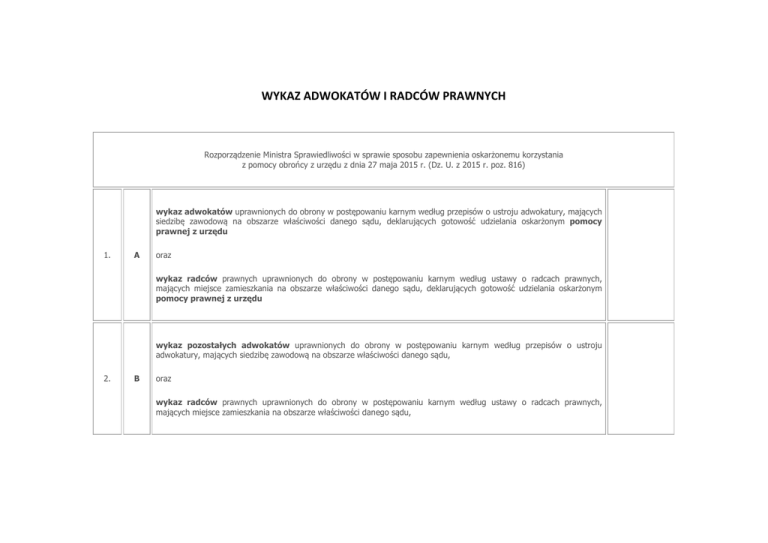WYKAZ ADWOKATÓW I RADCÓW PRAWNYCH Rozporządzenie Ministra Sprawiedliwości w sprawie sposobu zapewnienia oskarżonemu korzystania z pomocy obrońcy z urzędu z dnia 27 maja 2015 r. (Dz. U. z 2015 r. poz. 816) wykaz adwokatów uprawnionych do obrony w postępowaniu karnym według przepisów o ustroju adwokatury, mających siedzibę zawodową na obszarze właściwości danego sądu, deklarujących gotowość udzielania oskarżonym pomocy prawnej z urzędu 1. A oraz wykaz radców prawnych uprawnionych do obrony w postępowaniu karnym według ustawy o radcach prawnych, mających miejsce zamieszkania na obszarze właściwości danego sądu, deklarujących gotowość udzielania oskarżonym pomocy prawnej z urzędu wykaz pozostałych adwokatów uprawnionych do obrony w postępowaniu karnym według przepisów o ustroju adwokatury, mających siedzibę zawodową na obszarze właściwości danego sądu, 2. B oraz wykaz radców prawnych uprawnionych do obrony w postępowaniu karnym według ustawy o radcach prawnych, mających miejsce zamieszkania na obszarze właściwości danego sądu, LISTA A Nazwisko Imię Zawód Proszewski Marek adwokat Proszewski Wojciech adwokat Stelmach Jan adwokat Szyszka Krzysztof adwokat Wójcik Józef adwokat Nazwisko Imię Borowiec Wiesława Zawód radca prawny Flak Edward Huszno Łukasz Kucharczyk Mariusz Adres do doręczeń 46-300 Olesno ul. Kościuszki 16 45-401 Opole ul. Krzemieniecka 19/13 46-300 Olesno ul. Kościuszki 16 46-300 Olesno ul. Kościuszki 10 46-300 Olesno ul. Kościuszki 12 Telefon 34 3583719 602 191 331 E-mail [email protected] 77 5515340 510 707 807 [email protected] 34 3583719 604 252 618 [email protected] 695 539 697 34 3582456 604 596 447 [email protected] [email protected] LISTA B adwokat radca prawny radca prawny Adres do doręczeń 46-320 Praszka ul. Chłopska 22 46-300 Olesno ul. Kościuszki 10 46-320 Kowale ul. Ożarowska 43 46-300 Olesno ul. Brzozowa 9 Telefon E-mail 604 442 786 [email protected] 606 475 206 [email protected] 696 926 943 [email protected]