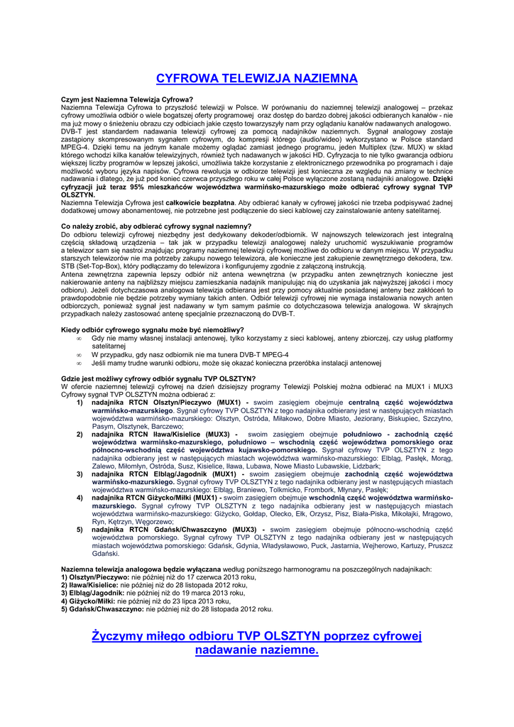 CYFROWA TELEWIZJA NAZIEMNA Czym jest Naziemna Telewizja Cyfrowa? Naziemna Telewizja Cyfrowa to przyszłość telewizji w Polsce. W porównaniu do naziemnej telewizji analogowej – przekaz cyfrowy umożliwia odbiór o wiele bogatszej oferty programowej oraz dostęp do bardzo dobrej jakości odbieranych kanałów - nie ma już mowy o śnieżeniu obrazu czy odbiciach jakie często towarzyszyły nam przy oglądaniu kanałów nadawanych analogowo. DVB-T jest standardem nadawania telewizji cyfrowej za pomocą nadajników naziemnych. Sygnał analogowy zostaje zastąpiony skompresowanym sygnałem cyfrowym, do kompresji którego (audio/wideo) wykorzystano w Polsce standard MPEG-4. Dzięki temu na jednym kanale możemy oglądać zamiast jednego programu, jeden Multiplex (tzw. MUX) w skład którego wchodzi kilka kanałów telewizyjnych, również tych nadawanych w jakości HD. Cyfryzacja to nie tylko gwarancja odbioru większej liczby programów w lepszej jakości, umożliwia także korzystanie z elektronicznego przewodnika po programach i daje możliwość wyboru języka napisów. Cyfrowa rewolucja w odbiorze telewizji jest konieczna ze względu na zmiany w technice nadawania i dlatego, że już pod koniec czerwca przyszłego roku w całej Polsce wyłączone zostaną nadajniki analogowe. Dzięki cyfryzacji już teraz 95% mieszkańców województwa warmińsko-mazurskiego może odbierać cyfrowy sygnał TVP OLSZTYN. Naziemna Telewizja Cyfrowa jest całkowicie bezpłatna. Aby odbierać kanały w cyfrowej jakości nie trzeba podpisywać żadnej dodatkowej umowy abonamentowej, nie potrzebne jest podłączenie do sieci kablowej czy zainstalowanie anteny satelitarnej. Co należy zrobić, aby odbierać cyfrowy sygnał naziemny? Do odbioru telewizji cyfrowej niezbędny jest dedykowany dekoder/odbiornik. W najnowszych telewizorach jest integralną częścią składową urządzenia – tak jak w przypadku telewizji analogowej należy uruchomić wyszukiwanie programów a telewizor sam się nastroi znajdując programy naziemnej telewizji cyfrowej możliwe do odbioru w danym miejscu. W przypadku starszych telewizorów nie ma potrzeby zakupu nowego telewizora, ale konieczne jest zakupienie zewnętrznego dekodera, tzw. STB (Set-Top-Box), który podłączamy do telewizora i konfigurujemy zgodnie z załączoną instrukcją. Antena zewnętrzna zapewnia lepszy odbiór niż antena wewnętrzna (w przypadku anten zewnętrznych konieczne jest nakierowanie anteny na najbliższy miejscu zamieszkania nadajnik manipulując nią do uzyskania jak najwyższej jakości i mocy odbioru). Jeżeli dotychczasowa analogowa telewizja odbierana jest przy pomocy aktualnie posiadanej anteny bez zakłóceń to prawdopodobnie nie będzie potrzeby wymiany takich anten. Odbiór telewizji cyfrowej nie wymaga instalowania nowych anten odbiorczych, ponieważ sygnał jest nadawany w tym samym paśmie co dotychczasowa telewizja analogowa. W skrajnych przypadkach należy zastosować antenę specjalnie przeznaczoną do DVB-T. Kiedy odbiór cyfrowego sygnału może być niemożliwy? • Gdy nie mamy własnej instalacji antenowej, tylko korzystamy z sieci kablowej, anteny zbiorczej, czy usług platformy satelitarnej • W przypadku, gdy nasz odbiornik nie ma tunera DVB-T MPEG-4 • Jeśli mamy trudne warunki odbioru, może się okazać konieczna przeróbka instalacji antenowej Gdzie jest możliwy cyfrowy odbiór sygnału TVP OLSZTYN? W ofercie naziemnej telewizji cyfrowej na dzień dzisiejszy programy Telewizji Polskiej można odbierać na MUX1 i MUX3 Cyfrowy sygnał TVP OLSZTYN można odbierać z: 1) nadajnika RTCN Olsztyn/Pieczywo (MUX1) - swoim zasięgiem obejmuje centralną część województwa warmińsko-mazurskiego. Sygnał cyfrowy TVP OLSZTYN z tego nadajnika odbierany jest w następujących miastach województwa warmińsko-mazurskiego: Olsztyn, Ostróda, Miłakowo, Dobre Miasto, Jeziorany, Biskupiec, Szczytno, Pasym, Olsztynek, Barczewo; 2) nadajnika RTCN Iława/Kisielice (MUX3) swoim zasięgiem obejmuje południowo - zachodnią część województwa warmińsko-mazurskiego, południowo – wschodnią część województwa pomorskiego oraz północno-wschodnią część województwa kujawsko-pomorskiego. Sygnał cyfrowy TVP OLSZTYN z tego nadajnika odbierany jest w następujących miastach województwa warmińsko-mazurskiego: Elbląg, Pasłęk, Morąg, Zalewo, Miłomłyn, Ostróda, Susz, Kisielice, Iława, Lubawa, Nowe Miasto Lubawskie, Lidzbark; 3) nadajnika RTCN Elbląg/Jagodnik (MUX1) - swoim zasięgiem obejmuje zachodnią część województwa warmińsko-mazurskiego. Sygnał cyfrowy TVP OLSZTYN z tego nadajnika odbierany jest w następujących miastach województwa warmińsko-mazurskiego: Elbląg, Braniewo, Tolkmicko, Frombork, Młynary, Pasłęk; 4) nadajnika RTCN Giżycko/Miłki (MUX1) - swoim zasięgiem obejmuje wschodnią część województwa warmińskomazurskiego. Sygnał cyfrowy TVP OLSZTYN z tego nadajnika odbierany jest w następujących miastach województwa warmińsko-mazurskiego: Giżycko, Gołdap, Olecko, Ełk, Orzysz, Pisz, Biała-Piska, Mikołajki, Mrągowo, Ryn, Kętrzyn, Węgorzewo; 5) nadajnika RTCN Gdańsk/Chwaszczyno (MUX3) - swoim zasięgiem obejmuje północno-wschodnią część województwa pomorskiego. Sygnał cyfrowy TVP OLSZTYN z tego nadajnika odbierany jest w następujących miastach województwa pomorskiego: Gdańsk, Gdynia, Władysławowo, Puck, Jastarnia, Wejherowo, Kartuzy, Pruszcz Gdański. Naziemna telewizja analogowa będzie wyłączana według poniższego harmonogramu na poszczególnych nadajnikach: 1) Olsztyn/Pieczywo: nie później niż do 17 czerwca 2013 roku, 2) Iława/Kisielice: nie później niż do 28 listopada 2012 roku, 3) Elbląg/Jagodnik: nie później niż do 19 marca 2013 roku, 4) Giżycko/Miłki: nie później niż do 23 lipca 2013 roku, 5) Gdańsk/Chwaszczyno: nie później niż do 28 listopada 2012 roku. Życzymy miłego odbioru TVP OLSZTYN poprzez cyfrowej nadawanie naziemne.