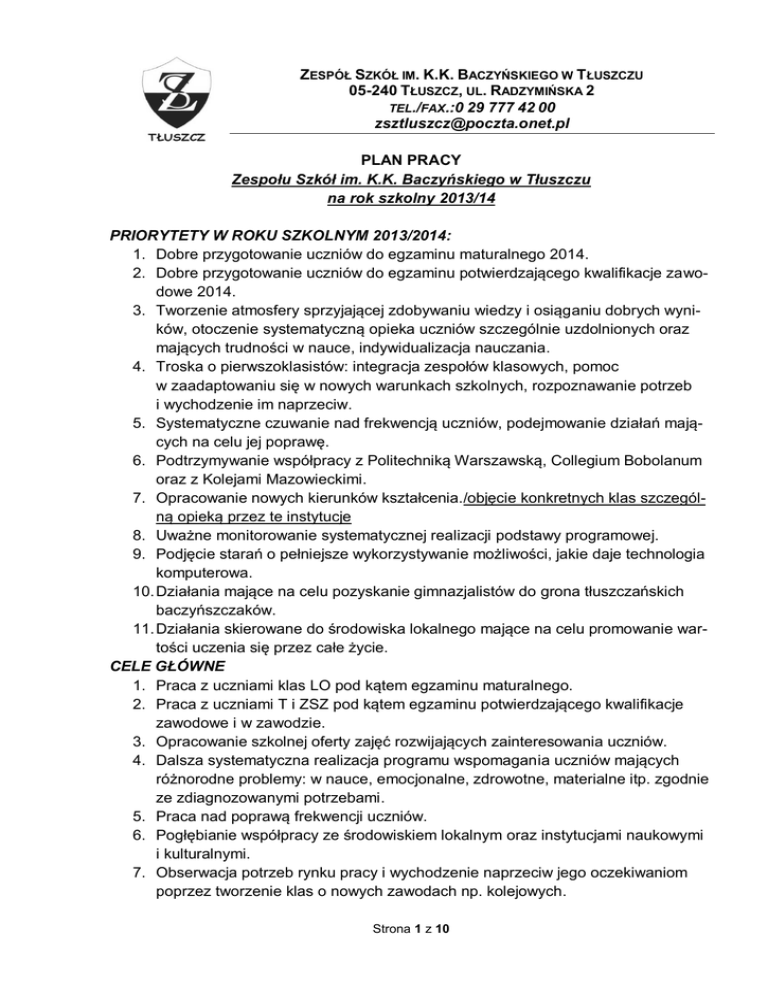 ZESPÓŁ SZKÓŁ IM. K.K. BACZYŃSKIEGO W TŁUSZCZU 05-240 TŁUSZCZ, UL. RADZYMIŃSKA 2 TEL./FAX.:0 29 777 42 00 [email protected] PLAN PRACY Zespołu Szkół im. K.K. Baczyńskiego w Tłuszczu na rok szkolny 2013/14 PRIORYTETY W ROKU SZKOLNYM 2013/2014: 1. Dobre przygotowanie uczniów do egzaminu maturalnego 2014. 2. Dobre przygotowanie uczniów do egzaminu potwierdzającego kwalifikacje zawodowe 2014. 3. Tworzenie atmosfery sprzyjającej zdobywaniu wiedzy i osiąganiu dobrych wyników, otoczenie systematyczną opieka uczniów szczególnie uzdolnionych oraz mających trudności w nauce, indywidualizacja nauczania. 4. Troska o pierwszoklasistów: integracja zespołów klasowych, pomoc w zaadaptowaniu się w nowych warunkach szkolnych, rozpoznawanie potrzeb i wychodzenie im naprzeciw. 5. Systematyczne czuwanie nad frekwencją uczniów, podejmowanie działań mających na celu jej poprawę. 6. Podtrzymywanie współpracy z Politechniką Warszawską, Collegium Bobolanum oraz z Kolejami Mazowieckimi. 7. Opracowanie nowych kierunków kształcenia./objęcie konkretnych klas szczególną opieką przez te instytucje 8. Uważne monitorowanie systematycznej realizacji podstawy programowej. 9. Podjęcie starań o pełniejsze wykorzystywanie możliwości, jakie daje technologia komputerowa. 10. Działania mające na celu pozyskanie gimnazjalistów do grona tłuszczańskich baczyńszczaków. 11. Działania skierowane do środowiska lokalnego mające na celu promowanie wartości uczenia się przez całe życie. CELE GŁÓWNE 1. Praca z uczniami klas LO pod kątem egzaminu maturalnego. 2. Praca z uczniami T i ZSZ pod kątem egzaminu potwierdzającego kwalifikacje zawodowe i w zawodzie. 3. Opracowanie szkolnej oferty zajęć rozwijających zainteresowania uczniów. 4. Dalsza systematyczna realizacja programu wspomagania uczniów mających różnorodne problemy: w nauce, emocjonalne, zdrowotne, materialne itp. zgodnie ze zdiagnozowanymi potrzebami. 5. Praca nad poprawą frekwencji uczniów. 6. Pogłębianie współpracy ze środowiskiem lokalnym oraz instytucjami naukowymi i kulturalnymi. 7. Obserwacja potrzeb rynku pracy i wychodzenie naprzeciw jego oczekiwaniom poprzez tworzenie klas o nowych zawodach np. kolejowych. Strona 1 z 10 8. Monitorowanie realizacji nowej podstawy kształcenia ogólnego i kształcenia w zawodach. 9. Jak najczęstsze stosowanie w pracy z uczniem pomocy dydaktycznych z zakresu technologii informacyjnej. 10. Wzmocnienie wizerunku i pozycji szkoły w środowisku lokalnym. 11. Promowanie działań o charakterze kulturalno – artystycznym oraz pożądanych postaw uczniów i ich osiągnięć. 12. Opracowanie propozycji zajęć, spotkań, warsztatów przeznaczonych dla członków społeczności lokalnej. 13. Promowanie działań prozdrowotnych – zdrowie, higiena, bezpieczeństwo. OCZEKIWANE EFEKTY 1. Dobre wyniki egzaminu maturalnego 2014. 2. Dobre wyniki egzaminu potwierdzającego kwalifikacje zawodowe 2014. 3. Lepszy start pierwszoklasistów. 4. Poprawa wyników w nauce, frekwencji uczniów oraz ich własnej samooceny. 5. Uczestnictwo i sukcesy uczniów w olimpiadach, konkursach, programach, projektach i akcjach. 6. Rozszerzenie zakresu współpracy z uczelniami wyższymi, instytucjami naukowymi i kulturalnymi. 7. Wzmocnienie zainteresowania absolwentów gimnazjów ofertą naszej szkoły, pozyskanie uczniów do klas o nowych zawodach. 8. Utrzymanie pozytywnego wizerunku szkoły w środowisku lokalnym. 9. Pełna, systematyczna i rzetelna realizacja podstawy programowej. 10. Pogłębianie przez pracowników wiedzy i umiejętności potrzebnych do wdrożenia i realizacji zmian organizacyjnych w roku szkolnym 2013/14. 11. Przeprowadzenie zajęć promujących w środowisku wartość uczenia się przez całe życie. 12. Podniesienie świadomości szkodliwości stosowania używek-palenia Strona 2 z 10 OBSZAR ZADANIA SPOSOBY REALIZACJI TERMIN 1. Opracowanie oferty zajęć dla uczniów. IX 2013 wicedyrektor 2. Systematyczne prowadzenie kół zainteresowań zaproponowanych przez nauczycieli. Cały rok opiekunowie kół zainteresowań 3. Motywowanie uczniów do udziału w konkursach, zawodach, programach, projektach, akcjach i olimpiadach Cały rok przedmiotowych. Tworzenia warunków 4. Przyznawanie uczniom osiągającym najlepsze wyniki w IX 2013 do samodzielnego nauce stypendium Starosty. zdobywania wiedzy, świadomego uczenia 5. Cykliczne zajęcia w Collegium Bobolanum i na Politechnice Warszawskiej oraz spotkania w Muzeum PoCały rok się i rozwijania zaintewstania Warszawskiego resowań DYDAKTYKA ODPOWIEDZIALNI nauczyciele przedmiotów wicedyrektor nauczyciele przedmiotów 6. Organizowanie szkolnych i międzyszkolnych konkursów, wycieczek krajoznawczych i tematycznych oraz imprez kulturalnych. Cały rok nauczyciele przedmiotów 7. Piknik Naukowy Szkoły Odkrywców Talentów IV 2014 nauczyciele, wicedyrektor 8. Przygotowanie młodzieży do udziału w olimpiadach i konkursach. Cały rok nauczyciele przedmiotów IX 2013 nauczyciele, wicedyrektor IV/V 2014 nauczyciele, wicedyrektor XII 2013 nauczyciele, wicedyrektor 9. Pomiary dydaktyczne: Podnoszenie jakości Sprawdzian umiejętności klas pierwszych pracy szkoły poprzez organizowanie pomia- Sprawdziany dyrektorskie rów dydaktycznych Próbna matura z OPERONEM dla uczniów klas trzeciej i czwartych Strona 3 z 10 OBSZAR ZADANIA Doskonalenie umiejętności nauczycieli SPOSOBY REALIZACJI TERMIN ODPOWIEDZIALNI Próbny egzamin potwierdzający kwalifikacje zawodowe: - technik mechanik - technik usług fryzjerskich - sprzedawca, kucharz małej gastronomii II 2014, dyrektor, kierownik szkolenia praktycznego Matura 2013 Omówienie wyników na radzie pedagogicznej; przedstawienie wniosków; analiza porównawcza „zewnętrznych” wyników egzaminu maturalnego z wynikami badania osiągnięć edukacyjnych uczniów. Egzamin zawodowy 2013 Omówienie wyników na radzie pedagogicznej; przedstawienie wniosków; analiza porównawcza „zewnętrznych” w