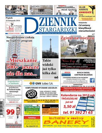 Dolice- Warsin Ambasador Tajwanu z wizytą w szpitalu s. 5 ARMA Nieruchomości J Borek- Sperber Most który łączy s. 12 s. 4 Piątek 25 listopada 2016 Kobylanka Cd zmiany klasyfikacji nieruchomości Nr 90 (1731) Cena:2,00 zł (w tym 8% VAT) ISSN 1644-1249 INDEKS 349887 WYDAWCA POLSKI s. 7 Zginął na miejscu Stargardzianie czekają na rządowy program ,,Mieszkanie 500+" jeszcze nie dla nas... s. 4 reklama s. 3 Takie widoki już tylko kilka dni s. 4 Gospodarstwo w Karkowie Poszukuje pracownika gospodarstwa Bosch Diesel Centrum Bojarski CODZIENNIE PROMOCJE NA FACEBOOK – WYBIERZ PROMOCJE DLA SIEBIE www.facebook.com/ServiceBojarski/ lub mgr inż. Tadeusz Bojarski ul. Pomorska 57b na www.autobojarski.com.pl/aktualności 74-100 Gryfino tel. +48 91 415 02 90 ZAPRASZAMY tel. +48 91 415 12 48 [email protected] GRYFINO • UL. POMORSKA 57B • TEL. 91 415 02 90 Zapraszamy na obsługę samochodów – szybkie naprawy, przeglądy przed zimą Oferujemy: - atrakcyjne wynagrodzenie - stabilną pracę Kalendarze na 2017 rok TRÓJDZIELNE już od 609 341 111 Galeria Starówka Najkorzystniejsze ul. B. Chrobrego 8 kursy walut Pon. - Pt. 9:00 - 21:00 N e g o c j o w a n e Sob. 09:00 - 21:00 SPRAWDŹ Nd. 10.00 - 20.00 +48 91 836 93 30 www.dukato.szczecin.pl Autoskup - skupujemy każde pojazdy, płacimy nawet za wraki, oferujemy najwyższe ceny. Tel. 536 079 721 5,50 zł tel. 91 392 21 65 NAJTANIEJ w okolicy BANERY WYDRUKI na folii One Way Vision, naklejki tel. 91 577 2007 [email protected] Zainteresowanych prosimy o kontakt telefoniczny: Regulamin dostępny w salonie BOSCH DIESEL CENTRUM BOJARSKI www.autobojarski.com.pl do hodowli bydła opasowego Kompletna para okularów już od 99 zł reklama 2 Nr 90 (1731) Puls Miasta Nasza Sonda O co mieszkańcy zapytaliby posła Michała Jacha? Jerzy Krzysztof Kwieciński Zapytałbym posła o to, co zmieni się w stargardzkiej komunikacji. Z tego, co już wiem, ma powstać nowe rondo. Chciałbym wiedzieć, czy jest już nazwa tego ronda. A może tak zapytać mieszkańców Stargardu o nazwę? Można byłoby temu nowemu rondu nadać nazwę, np. Pionierów Stargardu, Niepodległości czy może jednego z obecnych bohaterów - Żołnierzy Wyklętych. Widać, że idzie się obecnie w kierunku polityki historycznej. Cóż jest warty naród bez historii? Widziałem kilka wystąpień posła M. Jacha w TVP i były dość życiowe i konkretne. Myślę, że zmiana, która teraz nastąpiła będzie dobra, ale ostateczną ocenę wydamy po upływie kadencji. Ryszard Hodyl Nie zapytałbym posła o nic, bo go nie znam. Pewnie jest wiele spraw, o które można zapytać posła. Jak mi wiadomo, mają usunąć radziecką gwiazdę. I dobrze, bo faktycznie jest ona niepotrzebna. Komuny już nie ma. I czerwonej gwiazdy też nie będzie. Niemniej uważam, że powinno się tutaj ustawić jakiś inny obelisk. Np. pomnik kogoś zasłużonego. 121 Niemal codziennie w godzinach porannych, tuż po odjeździe autobusu MZK z przystanku przy ul. Wyszyńskiego, można ujrzeć widok uwieczniony na zdjęciu. Pełno śmieci, łupinek słonecznika itd., to pozostałości po czekającej na autobus młodzieży szkolnej, która kłębi się przed godziną 8:00 przy Netto. Jest to tym bardziej przykre, że kilka metrów dalej stoi przecież śmietnik… 122 Od początku tygodnia trwają prace związane z instalacjami ozdób świątecznych. Wykonawcy przy użyciu podnośników rozwieszają kolorowe lampki m.in. na ulicznych lampach. Już niebawem świąteczne iluminacje rozbłysną nocami na ulicach Stargardu, wprowadzając miasto w należyty świąteczny nastrój. KR Antoni Skoczylas Zapytałbym o to, czy ludzie niepełnosprawni w tym kraju, a szczególnie w tym mieście są gorszym gatunkiem ludzi? Jestem niepełnosprawny na pierwszej grupie w stopniu znacznym. Nie ma zjazdów, ani podjazdów na przejściach dla pieszych. Już mi 4 opony z dętkami popękały od pojazdu inwalidzkiego! Kto mi za to odda pieniądze?! Mam bardzo uszkodzone biodra i kręgosłup. Kto to wymyślił, że w gospodarstwie jednoosobowym, w jakim jestem, płacę za mieszkanie 360 zł czynszu!? Od 500 do 700 zł miesięcznie muszę wydać na leki! Jestem po dwóch wylewach. Jednego doznałem w domu a drugiego w szpitalu. Pani neurolog stwierdziła, że przeżyłem dzięki temu, że jestem wysportowany, ponieważ byłem w przeszłości biegaczem. Marlena Berent Zapytałabym posła, kiedy zostanie odnowiony amfiteatr i kiedy zostanie rozbudowany basen na OSiRze, chociaż to raczej pytanie do prezydenta miasta. Gabriela Kucharczyk Miałabym kilka pytań, np. co będzie z gimnazjami? Interesuje mnie, co przyniesie reforma edukacji. Ponadto, zadałabym pytanie o obietnice rządu np. w związku z 500 plus, tzn. czy ta forma finansowego wsparcia dalej będzie po nowym roku, czy skończy się na tym roku. Nurtuje mnie też los naszej służby zdrowia. (ps) Straż Miejska pomoże uruchomić zamarznięty silnik Idzie zima, mróz doskwiera kierowcom. Rano zawiódł nas samochód i nie można go odpalić… W tym przypadku możemy liczyć na pomoc stargardzkiej Straży Miejskiej. Warto zapisać sobie numer 986. Straż Miejska już od trzech lat pomaga przy odpalaniu samochodów, w których posłuszeństwa odmówił akumulator. W tym roku strażnicy zaopatrzyli się w specjalne urządzenie rozruchowe. Przyjeżdżają z nim do unieruchomionego samochodu i szybko ładują akumulator. – Spodziewamy się, że wraz z ukazaniem się tej informacji, będziemy mieli tej zimy pełne ręce roboty. Mamy nadzieję pomóc uruchomić samochód jak największej liczbie kierowców – Nowe urządzenie rozruchowe zakupione przez Straż Miejską.jpg mówi komendant Wiesław Dubij. Awarie akumulatorów z powodu niskich temperatur moż- na zgłaszać Straży Miejskiej pod numerem 986. red Komunikat Podczas zbiórki ulicznej PCK, która odbyła się we środę 23.11. 2016 udało się zebrać 1084,57 zł 1 euro i 3 centy. Zebrane środki zostaną przeznaczone na przygo