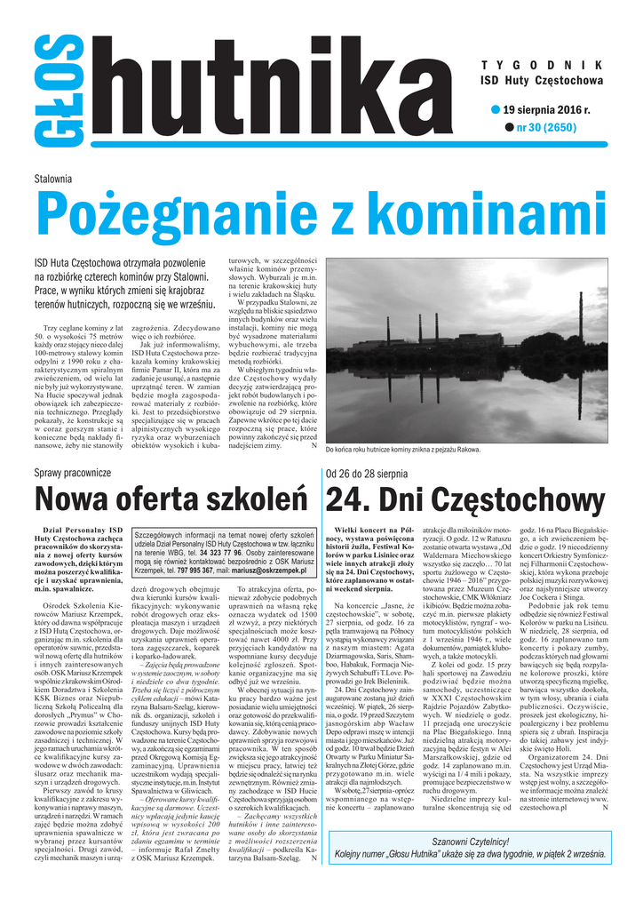 t y g o d n i k ISD Huty Częstochowa l 19 sierpnia 2016 r. l nr 30 (2650) Stalownia Pożegnanie z kominami ISD Huta Częstochowa otrzymała pozwolenie na rozbiórkę czterech kominów przy Stalowni. Prace, w wyniku których zmieni się krajobraz terenów hutniczych, rozpoczną się we wrześniu. Trzy ceglane kominy z lat 50. o wysokości 75 metrów każdy oraz stojący nieco dalej 100-metrowy stalowy komin odpylni z 1990 roku z charakterystycznym spiralnym zwieńczeniem, od wielu lat nie były już wykorzystywane. Na Hucie spoczywał jednak obowiązek ich zabezpieczenia technicznego. Przeglądy pokazały, że konstrukcje są w coraz gorszym stanie i konieczne będą nakłady finansowe, żeby nie stanowiły zagrożenia. Zdecydowano więc o ich rozbiórce. Jak już informowaliśmy, ISD Huta Częstochowa przekazała kominy krakowskiej firmie Pamar II, która ma za zadanie je usunąć, a następnie uprzątnąć teren. W zamian będzie mogła zagospodarować materiały z rozbiórki. Jest to przedsiębiorstwo specjalizujące się w pracach alpinistycznych wysokiego ryzyka oraz wyburzeniach obiektów wysokich i kuba- turowych, w szczególności właśnie kominów przemysłowych. Wyburzali je m.in. na terenie krakowskiej huty i wielu zakładach na Śląsku. W przypadku Stalowni, ze względu na bliskie sąsiedztwo innych budynków oraz wielu instalacji, kominy nie mogą być wysadzone materiałami wybuchowymi, ale trzeba będzie rozbierać tradycyjna metodą rozbiórki. W ubiegłym tygodniu władze Częstochowy wydały decyzję zatwierdzającą projekt robót budowlanych i pozwolenie na rozbiórkę, które obowiązuje od 29 sierpnia. Zapewne wkrótce po tej dacie rozpoczną się prace, które powinny zakończyć się przed nadejściem zimy. N Sprawy pracownicze Do końca roku hutnicze kominy znikna z pejzażu Rakowa. Od 26 do 28 sierpnia Nowa oferta szkoleń 24. Dni Częstochowy Dział Personalny ISD Huty Częstochowa zachęca pracowników do skorzystania z nowej oferty kursów zawodowych, dzięki którym można poszerzyć kwalifikacje i uzyskać uprawnienia, m.in. spawalnicze. Ośrodek Szkolenia Kierowców Mariusz Krzempek, który od dawna współpracuje z ISD Hutą Częstochowa, organizując m.in. szkolenia dla operatorów suwnic, przedstawił nową ofertę dla hutników i innych zainteresowanych osób. OSK Mariusz Krzempek wspólnie z krakowskim Ośrodkiem Doradztwa i Szkolenia KSK Biznes oraz Niepubliczną Szkołą Policealną dla dorosłych „Prymus” w Chorzowie prowadzi kształcenie zawodowe na poziomie szkoły zasadniczej i technicznej. W jego ramach uruchamia wkrótce kwalifikacyjne kursy zawodowe w dwóch zawodach: ślusarz oraz mechanik maszyn i urządzeń drogowych. Pierwszy zawód to krusy kwalifikacyjne z zakresu wykonywania i naprawy maszyn, urządzeń i narzędzi. W ramach zajęć będzie można zdobyć uprawnienia spawalnicze w wybranej przez kursantów specjalności. Drugi zawód, czyli mechanik maszyn i urzą- Szczegółowych informacji na temat nowej oferty szkoleń udziela Dział Personalny ISD Huty Częstochowa w tzw. łączniku na terenie WBG, tel. 34 323 77 96. Osoby zainteresowane mogą się również kontaktować bezpośrednio z OSK Mariusz Krzempek, tel. 797 995 367, mail: [email protected] dzeń drogowych obejmuje dwa kierunki kursów kwalifikacyjnych: wykonywanie robót drogowych oraz eksploatacja maszyn i urządzeń drogowych. Daje możliwość uzyskania uprawnień operatora zagęszczarek, koparek i koparko-ładowarek. – Zajęcia będą prowadzone w systemie zaocznym, w soboty i niedziele co dwa tygodnie. Trzeba się liczyć z półrocznym cyklem edukacji – mówi Katarzyna Balsam-Szeląg, kierownik ds. organizacji, szkoleń i funduszy unijnych ISD Huty Częstochowa. Kursy będą prowadzone na terenie Częstochowy, a zakończą się egzaminami przed Okręgową Komisją Egzaminacyjną. Uprawnienia uczestnikom wydają specjalistyczne instytucje, m.in. Instytut Spawalnictwa w Gliwicach. – Oferowane kursy kwalifikacyjne są darmowe. Uczestnicy wpłacają jedynie kaucję wpisową w wysokości 200 zł, która jest zwracana po zdaniu egzaminu w terminie – informuje Rafał Zmełty z OSK Mariusz Krzempek. To atrakcyjna oferta, ponieważ zdobycie podobnych uprawnień na własną rękę oznacza wydatek od 1500 zł wzwyż, a przy niektórych specjalnościach może kosztować nawet 4000 zł. Przy przyjęciach kandydatów na wspomniane kursy decyduje kolejność zgłoszeń. Spotkanie organizacyjne ma się odbyć już we wrześniu. W obecnej sytuacji na rynku pracy bardzo ważne jest posiadanie wielu umiejętności oraz gotowość do przekwalifikowania się, którą cenią pracodawcy. Zdobywanie nowych uprawnień sprzyja rozwojowi pracownika. W ten sposób zwiększa się jego atrakcyjność w miejscu pracy, łatwiej też będzie się odnaleźć się na rynku zewnętrznym. Również zmiany zachodzące w ISD Hucie Częstochowa sprzyjają osobom o szerokich kwalifikacjach. – Zachęcamy wszystkich hutników i inne zainteresowane osoby do skorzystania z możliwości rozszerzenia kwalifikacji – podkreśla Katarzyna Balsam-Szeląg. N Wielki koncert na Północy, wystawa poświęcona historii żużla, Festiwal Kolorów w parku Lisiniec oraz wiele innych atrakcji złoży się na 24. Dni Częstochowy, które zaplanowano w ostatni weekend sierpnia. Na koncercie „Jasne, że częstochowskie”, w sobotę, 27 sierpnia, od godz. 16 za pętla tramwajową na Północy wystąpią wykonawcy związani z naszym miastem: Agata Dziarmagowska, Saris, Shamboo, Habakuk, Formacja Nieżywych Schabuff i T.Love. Poprowadzi go Irek Bieleninik. 24. Dni Częstochowy zainaugurowane zostaną już dzień wcześniej. W piątek, 26 sierpnia, o godz. 19 przed Szczytem jasnogórskim abp Wacław Depo odprawi mszę w intencji miasta i jego mieszkańców. Już od godz. 10 trwał będzie Dzień Otwarty w Parku Miniatur Sakralnych na Złotej Górze, gdzie przygotowano m.in. wiele atrakcji dla najmłodszych. Ws