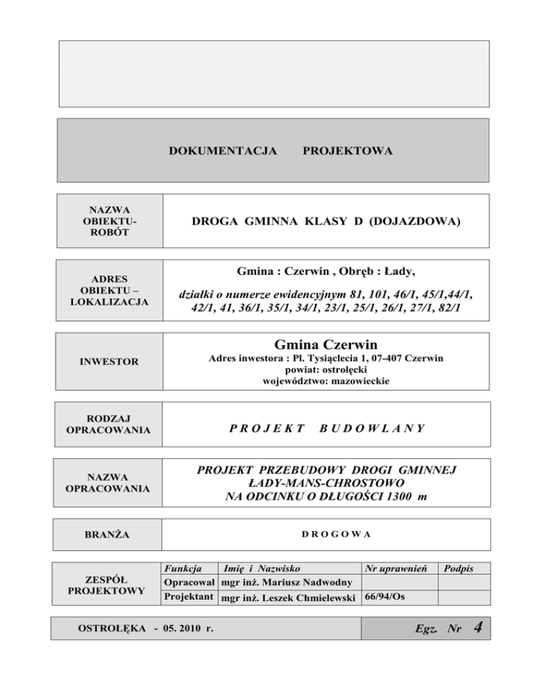 DOKUMENTACJA NAZWA OBIEKTUROBÓT ADRES OBIEKTU – LOKALIZACJA PROJEKTOWA DROGA GMINNA KLASY D (DOJAZDOWA) Gmina : Czerwin , Obręb : Łady, działki o numerze ewidencyjnym 81, 101, 46/1, 45/1,44/1, 42/1, 41, 36/1, 35/1, 34/1, 23/1, 25/1, 26/1, 27/1, 82/1 Gmina Czerwin INWESTOR Adres inwestora : Pl. Tysiąclecia 1, 07-407 Czerwin powiat: ostrołęcki województwo: mazowieckie RODZAJ OPRACOWANIA NAZWA OPRACOWANIA PROJEKT PROJEKT PRZEBUDOWY DROGI GMINNEJ ŁADY-MANS-CHROSTOWO NA ODCINKU O DŁUGOŚCI 1300 m DROGOWA BRANśA ZESPÓŁ PROJEKTOWY BUDOWLANY Funkcja Imię i Nazwisko Nr uprawnień Opracował mgr inŜ. Mariusz Nadwodny Projektant mgr inŜ. Leszek Chmielewski 66/94/Os OSTROŁĘKA - 05. 2010 r. Podpis Egz. Nr 4 ZAWARTOŚĆ I. C Z Ę ŚĆ OPRACOWANIA OPISOWA 1.Strona tytułowa 2.Zawartość opracowania 3.Oświadczenie projektanta 4.Potwierdzenie przygotowania zawodowego projektanta 5.Potwierdzenie przynaleŜności do MOIIB w Warszawie 6.Opis techniczny 7. Parametry projektowanych łuków II. CZĘŚĆ RYSUNKOWA 1.Plan orientacyjny przebiegu drogi – rysunek nr 1 2. Plan sytuacyjny drogi–zagospodarowani eterenu - rysunek nr 2 3. Profil podłuŜny - rysunek nr .3 4. Wykaz znaków do wykonania stałej organizacji ruchu - rysunek nr 4.1 5. Sposób ustawienia oznakowania - rysunek nr 4.2 6. Przekrój normalny i konstrukcja nawierzchni – rysunek nr 5.1 i 5.2 Ostrołęka : maj 2010r. O Ś W I A D C Z E N I E Oświadczam niniejszym, Ŝe dokumentacja p.n. Projekt budowlany przebudowy drogi gminnej Łady-Mans-Chrostowo na odcinku o długości 1300 m ( branŜa drogowa) składający się z: - projektu budowlanego branŜy drogowej, została wykonana zgodnie z obowiązującymi przepisami, warunkami uzyskanymi w trakcie opracowania, wytycznymi, normami i zasadami wiedzy technicznej oraz zawartą umową i jest kompletna z punktu widzenia celu jakiemu ma słuŜyć. Podpis projektanta: O P I S T E C H N I C Z N Y DO PROJEKTU PRZEBUDOWY DROGI GMINNEJ Łady-Mans-Chrostowo na odcinku w km 0 + 000,00 – 1+300,00 I. PODSTAWA OPRACOWANIA Projekt budowlano wykonawczy przebudowy drogi gminnej opracowano na zlecenie Urzędu Gminy Czerwin , który pełni rolę zarządcy drogi i będzie takŜe inwestorem przebudowy tej drogi. Projekt opracowano na podstawie: - II. mapy sytuacyjno – wysokościowej terenu ( skala 1: 1000 ), uzupełniających pomiarów sytuacyjnych wykonanych przez jednostkę projektującą, inwentaryzacji stanu istniejącego zagospodarowania terenu pasa drogowego, inwentaryzacji istniejącej konstrukcji nawierzchni Ŝwirowej, ustaleń uzyskanych od Zamawiającego w zakresie technologii przebudowy istniejącej nawierzchni Ŝwirowej na bitumiczną i zakresu przebudowy, Rozporządzenia M. T. i G. M. z dnia 2 marca 1999r. w sprawie warunków technicznych, jakim powinny odpowiadać drogi publiczne i ich usytuowanie (Dz. U. Nr. 43, poz. 430), Katalogu Typowych Konstrukcji Nawierzchni Podatnych i Półsztywnych GDDKiA Warszawa 1997r. ustaleń w zakresie istniejących warunków gruntowo – wodnych podłoŜa, obowiązujących norm i przepisów prawnych, CEL I ZAKRES OPRACOWANIA Projekt niniejszy ma charakter dokumentacji budowlano– wykonawczej, której celem jest określenie szczegółowego sposobu i zakresu wykonania przebudowy drogi o nawierzchni Ŝwirowej na bitumiczną przez ustalenie przebiegu osi jezdni i krawędzi korony w planie sytuacyjnym ( zagospodarowanie terenu pasa drogowego ), ustalenie technologii przebudowy nawierzchni Ŝwirowej na bitumiczną ( ustalenie konstrukcji nawierzchni), ustalenie sposobu oznakowania pionowego po przebudowie drogi ( stała organizacja ruchu ) oraz określenie ilości robót do wykonania ( sporządzenie przedmiaru robót ). Jednocześnie dokumentacja niniejsza wraz z przedmiarem robót i szczegółowymi specyfikacjami technicznymi wykonania i odbioru robót będzie stanowiła podstawę do przeprowadzenia przetargu publicznego w celu wyłonienia wykonawcy przebudowy drogi oraz określenia warunków wykonania i odbioru robót. Projekt - zawiera w szczególności: ustalenie przebiegu jezdni i poboczy drogi w planie sytuacyjnym, ustalenie przekroju normalnego i konstrukcji nawierzchni jezdni, sporządzenie przedmiaru robót do wykonania przy przebudowie istniejącej nawierzchni Ŝwirowej na bitumiczną, szczegółowe specyfikacje techniczne wykonania i odbioru robót, stałe oznakowanie pionowe po przebudowie drogi, ustalenie niwelety jezdni w profilu podłuŜnym drogi, III. STAN ISTNIEJĄCY Odcinek drogi objęty opracowaniem zlokalizowany jest w ciągu drogi gminnej klasy D ( dojazdowej ) Łady-Mans-Chrostowo w gminie Czerwin i słuŜy obsłudze komunikacyjnej zabudowy typu wiejskiego wsi Łady . Jednocześnie droga ta słuŜy jako połączenie komunikacyjne do drogi gminnej o nawierzchni bitumicznej oraz połączenie pomiędzy miejscowościami Łady i Chrostowo . Obecnie droga ta na odcinku objętym opracowaniem ma nawierzchnię Ŝwirową o szerokości od 5,00 m do 6,00 m, a korona drogi ma szerokość około – 7,00 m i wydzielona jest granicami działek i ogrodzeniami posesji . Nawierzchnia Ŝwirowa wykazuje lokalnie utratę nośności objawiającą się przełomami oraz nie ma właściwego profilu poprzecznego i podłuŜnego. Przebieg jezdni Ŝwirowej jest nieuporządkowany i wymaga wyznaczenia odcinków prostych i wpisania w ich załamania łuków kołowych . Obecnie brak jest oznakowania pionowego na drodze i nie są ustalone zasady organizacji ruchu. Lokalizację projektowanego odcinka drogi przedstawiono na mapie topograficznej terenu w skali 1 : 50 000 ( rysunek nr 1 ). IV. PROJEKTOWANY ZAKRES PRZEBUDOWY DROGI 1. W planie sytuacyjnym Przebieg projektowanego do przebudowy odcinka drogi przedstawiono na planie sytuacyjnym ( kopii mapy zasadniczej terenu do celów projektowych ) w skali 1: 1000 (rys. nr 2 ). Początek opracowania przyjęto w km 0+000,00 na krawędzi istniejącej jezdni bitumicznej drogi gminnej . Koniec opracowania przyjęto w km 1 + 3