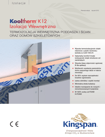 Izolacje Pierwsza edycja styczeń 2012 K12 Izolacja Wewne˛trzna TERMOIZOLACJA WEWNĘTRZNA PODDASZA I ŚCIAN ORAZ DOMÓW SZKIELETOWYCH ● ● ● ● ● Wysoka termoizolacyjnośc dzięki rdzeniowi z pianki rezolowej : lambda (λ) 0,021 W/m.K Optymalny komfort trwała izolacyjność dzięki strukturze cel zamkniętych Wysoka klasa odporności ogniowej B dla aplikacji Możliwość uzyskania parametrów domu pasywnego także w trakcie renowacji Do 50% wyższe oszczędności kosztów ogrzewania ● Łatwa obtróbka i szybki montaż ● Minimalna strata kubatury ● ● Idealne rozwiązanie do nowych i remontowwwanych budynków W 100% wolny od FCKW H-FCKW Energooszczędność Niska Emisja CO2 w Budownictwie Informacje o produkcie Termoizolacja ścian od wewna¸trz Termoizolacja ścian szkieletowych Nie zawsze jest to możliwe mocowanie izolacji ściany od zewnątrz. Kiedy nie ma dostępu do zewnetrznej powierzchni ścian lub odległość od sąsiedniego budynku jest zbyt mała zmuszeni jesteśmy mocować izolację od wewnątrz. Podobnie sprawa się ma w przypadkach kiedy fasada jest chroniona w ramach ochrony zabytków. W takich sytuacjach pozostaje nam również ocieplenie ściany od wewnątrz co nie jest proste i wymaga stosowania odpowiednich materiałów we właściwy sposób. Kooltherm® K12 jest materiałern idealnie do tego rozwiązania pasującym ponieważ dzięki rekordowej wartości współczynnika lambda z apewnia wysoką termoizolacyjność już przy warstwie 5 cm. Taki sarn efekt zapewnia dopiero niemal 10 cm warstwa tradycyjnych izolacji dzięki czernu nie tracimy dużej części powierzchni użytkowej. Ponadto sztywność płyt Kooltherm® zapewnia szczelność termoizolacji po latach, ponieważ w odróznieniu od miękkich izolacji Kooltherm nie osiada i nie kurczy się po czasie. Popularne z uwagi na tempo procesu budowlanego budownictwo szkieletowe opiera się o systemy konstrukcji drewnianej lub rzadziej stalowej. Ramy wykonane z drewnianych belek wypelniane są najczęściej miękką izolacją, której grubość limitowana jest wymiarem tejże belki tworzącej szkielet. Chcąc uzyskać lepsze parametry termoizolacyjnej konieczne byłoby zwiększenie wyrniaru elementów szkieletu co wyrnaga zmian systemu i znacznie podnosi koszty drewna. Zastosowanie płyt Kooltherm® K12 jako dodatkowej termoizolacji ściany umożliwia uzyskanie nawet parametrów dornu pasywnego bez konieczności zmian konstrukcyjnych. Warstwa płyt jest mocowana do zewnętrznej powierzchni szkieletu wypełnionego miękką izolacją a rekordowa wartość współczynnika lambda = 0,021 W/m.K oraz ekran termiczny w postaci okładziny refleksyjnej powoduje tylko nieznaczne zwiększenie grubości całej ściany. Ważne zlecenia wykonawcze Ważne zalecenia wykonawcze Dodatkowa warstwa termoizolacji nie stanowi bariery dla dyfuzji pary wodnej, dlatego uzupełniając ścianę szkieletową płytami Kooltherm® K12 trzeba zastosować wszystkie przewidziane w pierwotnym systemie elementy i membrany, w tym paraizolację. Plyty Kooltherm® K12 są zabezpieczone fabryczną okładziną a sam rdzeń nie chłonie wody, ale niewłaściwy transport pary wodnej mógłby być szkodliwy dla pozostałych elementów systemu. Badania naukowe dowiodły, że ściany maksymalnie przepuszczają 3% całego zużytego powietrza i teoria o oddychających ścianach powoli odchodzi do lamusa. Ważne jest jednak przed przystąpieniern do prac termoizolacyjnych usunięcie źródeł ewentualnego zawilgocenia ścian (wady obróbek dachowych, brak izolacji poziomej itp.) Do suchej i czystej ściany przyklejamy taśmę PE lub pasy foli PE w odstępie odpowiadającym formatowi płyt Kooltherm®. Na pasach folii PE mocujemy stelaż w postaci listew lub profili o grubości minimum 2 cm a do stelaż u mocujemy płyty Kooltherm® K12 dbając o szczelne dosunięcie płyty do płyty. Dzięki stelażowi tworzymy pustkę na wypadek jakiejkolwiek minimalnej kondensacji wynikającej np. z nieszcz elności połączeń itp. Na tak przygotowana powierzchnię płyt Kooltherm® mocujemy warstwę paroizolacji (folia PE) a następnie płyty kartonowo gipsowe, które wykańczamy zgodnie z zaleceniem producenta. 2 Kingspan Izolacje Termoizolacja poddasza od wewna¸trz Opis Kooltherm® K12 to płyta z sztywnej pianki rezolowej w aluminiowej okładzinie wielowarstwowej. Płyty Kooltherm® dzięki rekordowej izolacyjności gwarantują największą wydajność termoizolacji przy minimalnej grubości. Izolacje rezolowe typu Kooltherm® charakteryzują się wysoką odpornością ogniową osiągającą w aplikacji klasę B. Standardowe wymiary i wykończenie Płyty Kooltherm® K12 produkowane są w standardzie w wymiarach 1200 x 600 mm z prostymi krawędziami. Dane techniczne Dach nagrzewający się latern do blisko 80°C oddaje tę temperaturę na poddasze, gdzie ulokowane są zwykle sypialnie i pokoje dziecięce. Przy złej izolacji powoduje to dyskomfort latem, a zimą podwyższa koszty ogrzewania. Budujac dom możemy zapewnić właściwy komfort na poddaszu poprzez zastosowanie płyt Therma™ TP10 oferowanych przez Kingspan Insulation w systemie nakrokwiowym. Jeśli jednak jest to niernożliwe lub remontujerny poddasze bez ingerencji w pokrycie dachu można ocieplić poddasze od wewnątrz z użyciern płyt Kooltherm® K12. Wskażnik Wartość Gęstość Odporność na ściskanie przy 10% odkształceniu (PN EN 826) Stabilność wymiarowa po 48h przy 70ºC i 90% wilgotności względnej min. 35 kg/m³ 100 kPa długość, szerokość, grubość 0,5/1,5 % Wartości Termoizolacyjne Grubosc izolacji (mm) Wartość λ (W/m·K) (PN EN 13165) 20 – 44 45 – 140 0,023 0,021 Współczynnik przenikania ciepła U Często używane między krokwiami elastyczne izolacje przy swoich słabych współczynnikach i limitowanej grubością krokwi warstwie nie zapewniają odpowiedniej izolacyjności. Mocując pod krokwiami 50 mm Kooltherm® K12 jako uzupełnienie 170 mm wcześniej zało