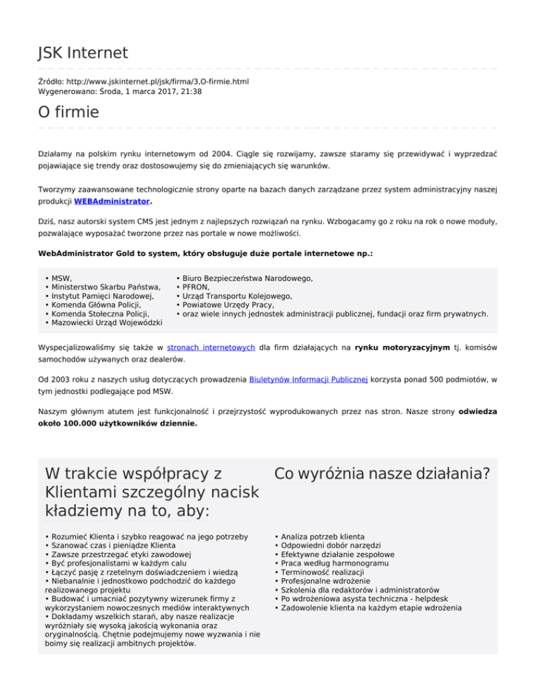 JSK Internet Źródło: http://www.jskinternet.pl/jsk/firma/3,O-firmie.html Wygenerowano: Środa, 1 marca 2017, 21:38 O firmie Działamy na polskim rynku internetowym od 2004. Ciągle się rozwijamy, zawsze staramy się przewidywać i wyprzedzać pojawiające się trendy oraz dostosowujemy się do zmieniających się warunków. Tworzymy zaawansowane technologicznie strony oparte na bazach danych zarządzane przez system administracyjny naszej produkcji WEBAdministrator. Dziś, nasz autorski system CMS jest jednym z najlepszych rozwiązań na rynku. Wzbogacamy go z roku na rok o nowe moduły, pozwalające wyposażać tworzone przez nas portale w nowe możliwości. WebAdministrator Gold to system, który obsługuje duże portale internetowe np.: • MSW, • Ministerstwo Skarbu Państwa, • Instytut Pamięci Narodowej, • Komenda Główna Policji, • Komenda Stołeczna Policji, • Mazowiecki Urząd Wojewódzki • Biuro Bezpieczeństwa Narodowego, • PFRON, • Urząd Transportu Kolejowego, • Powiatowe Urzędy Pracy, • oraz wiele innych jednostek administracji publicznej, fundacji oraz firm prywatnych. Wyspecjalizowaliśmy się także w stronach internetowych dla firm działających na rynku motoryzacyjnym tj. komisów samochodów używanych oraz dealerów. Od 2003 roku z naszych usług dotyczących prowadzenia Biuletynów Informacji Publicznej korzysta ponad 500 podmiotów, w tym jednostki podlegające pod MSW. Naszym głównym atutem jest funkcjonalność i przejrzystość wyprodukowanych przez nas stron. Nasze strony odwiedza około 100.000 użytkowników dziennie. W trakcie współpracy z Co wyróżnia nasze działania? Klientami szczególny nacisk kładziemy na to, aby: • Rozumieć Klienta i szybko reagować na jego potrzeby • Szanować czas i pieniądze Klienta • Zawsze przestrzegać etyki zawodowej • Być profesjonalistami w każdym calu • Łączyć pasję z rzetelnym doświadczeniem i wiedzą • Niebanalnie i jednostkowo podchodzić do każdego realizowanego projektu • Budować i umacniać pozytywny wizerunek firmy z wykorzystaniem nowoczesnych mediów interaktywnych • Dokładamy wszelkich starań, aby nasze realizacje wyróżniały się wysoką jakością wykonania oraz oryginalnością. Chętnie podejmujemy nowe wyzwania i nie boimy się realizacji ambitnych projektów. • Analiza potrzeb klienta • Odpowiedni dobór narzędzi • Efektywne działanie zespołowe • Praca według harmonogramu • Terminowość realizacji • Profesjonalne wdrożenie • Szkolenia dla redaktorów i administratorów • Po wdrożeniowa asysta techniczna - helpdesk • Zadowolenie klienta na każdym etapie wdrożenia Drukuj Generuj PDF Powiadom znajomego Wstecz Rozmiar czcionki: normalna większa duża