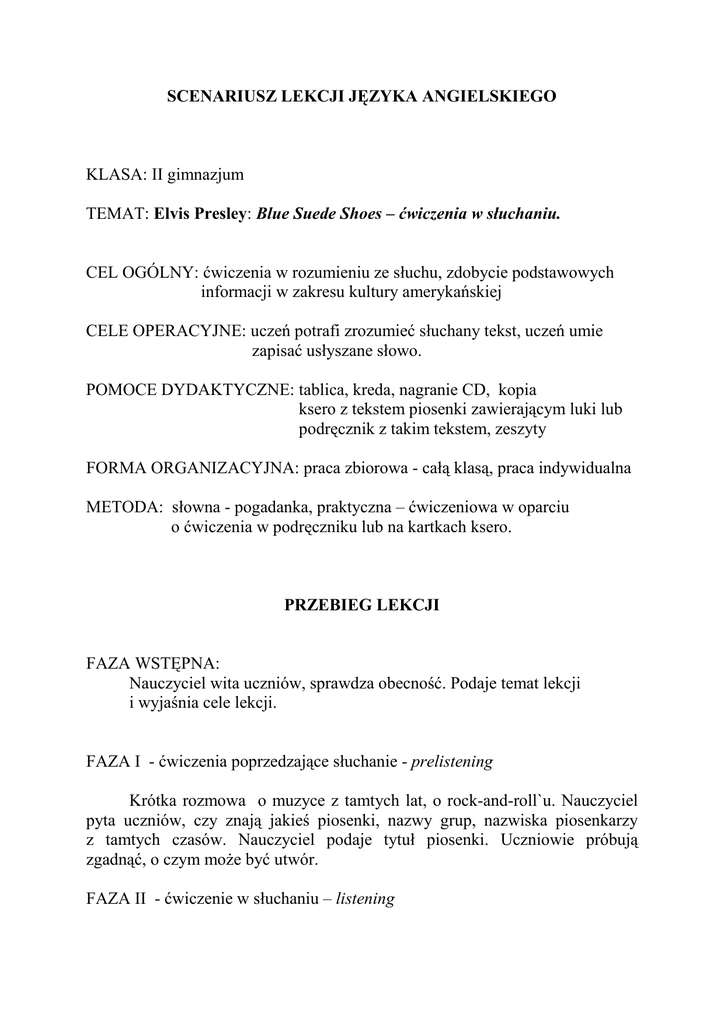SCENARIUSZ LEKCJI JĘZYKA ANGIELSKIEGO KLASA: II gimnazjum TEMAT: Elvis Presley: Blue Suede Shoes – ćwiczenia w słuchaniu. CEL OGÓLNY: ćwiczenia w rozumieniu ze słuchu, zdobycie podstawowych informacji w zakresu kultury amerykańskiej CELE OPERACYJNE: uczeń potrafi zrozumieć słuchany tekst, uczeń umie zapisać usłyszane słowo. POMOCE DYDAKTYCZNE: tablica, kreda, nagranie CD, kopia ksero z tekstem piosenki zawierającym luki lub podręcznik z takim tekstem, zeszyty FORMA ORGANIZACYJNA: praca zbiorowa - całą klasą, praca indywidualna METODA: słowna - pogadanka, praktyczna – ćwiczeniowa w oparciu o ćwiczenia w podręczniku lub na kartkach ksero. PRZEBIEG LEKCJI FAZA WSTĘPNA: Nauczyciel wita uczniów, sprawdza obecność. Podaje temat lekcji i wyjaśnia cele lekcji. FAZA I - ćwiczenia poprzedzające słuchanie - prelistening Krótka rozmowa o muzyce z tamtych lat, o rock-and-roll`u. Nauczyciel pyta uczniów, czy znają jakieś piosenki, nazwy grup, nazwiska piosenkarzy z tamtych czasów. Nauczyciel podaje tytuł piosenki. Uczniowie próbują zgadnąć, o czym moŜe być utwór. FAZA II - ćwiczenie w słuchaniu – listening Uczniowie słuchają piosenki bez zaglądania do tekstu. Następnie nauczyciel rozdaje karki z tekstem piosenki lub uczniowie otwierają podręczniki i czytają po cichu niepełny tekst piosenki. Nauczyciel odtwarza płytę z nagraniem dwa razy, uczniowie wypełniają luki odpowiednimi wyrazami. FAZA III – ćwiczenia po zakończeniu słuchania – postlistening Wybrani uczniowie czytają tekst i słowa, jakie wpisali w brakujące miejsca. Nauczyciel naprowadza, poprawia błędy w wymowie. Uczniowie wzajemnie korygują swoje pomyłki. Nauczyciel zapisuje na tablicy niektóre zwroty i słowa. Wyjaśnienie znaczenia tych wyraŜeń i słów za pomocą gestów, mimiki, ruchu ciała, opisowo. Uczniowie słuchają ponownie nagrania i próbują śpiewać wraz z CD. Podsumowanie i zadanie pracy domowej Nauczyciel opowiada o popularności tej piosenki; pyta uczniów, czy podobał się im utwór, czy tekst piosenki był trudny. Chętni uczniowie odpowiadają. PRACA DOMOWA Uczniowie układają w domu zdania z wyrazami i wyraŜeniami, które zostały wyjaśnione na lekcji. SCENARIUSZ LEKCJI JĘZYKA ANGIELSKIEGO KLASA: II gimnazjum, klasa I liceum profilowanego TEMAT : Film – Star Wars. Part IV – New Hope. Przydatne wyraŜenia. CEL OGÓLNY: ćwiczenia w rozumieniu ze słuchu, zdobycie informacji z kultury amerykańskiej, wzbudzenie zainteresowania kulturą amerykańską. CELE OPERACYJNE: uczeń potrafi zrozumieć określone zwroty podczas oglądania filmu, uczeń umie samodzielnie pracować i notować wybrane wyraŜenia z filmu, uczeń umie pracować w grupie. POMOCE DYDAKTYCZNE: nagranie DVD, tablica, kreda, zeszyty FORMA ORGANIZACYJNA: praca zbiorowa - całą klasą, praca w parach, praca indywidualna. METODA: słowna - pogadanka, praktyczna – ćwiczeniowa w oparciu o film DVD. PRZEBIEG LEKCJI FAZA WSTĘPNA: Nauczyciel wita uczniów, sprawdza obecność. Podaje temat lekcji i wyjaśnia cele lekcji FAZA I - ćwiczenia wstępne Nauczyciel zapytuje uczniów czy znają sagę filmową Star Wars. Chętni uczniowie opowiadają o filmie. Nauczyciel zadaje pytania o reŜysera filmu, muzykę, aktorów. W razie potrzeby opowiada sam ciekawostki o powstaniu filmu i jego popularności na świecie. FAZA II - oglądanie filmu i wykonywanie ćwiczeń w trakcie oglądania. Nauczyciel poleca uczniom w czasie oglądania filmu zapisywać w zeszycie zwroty, słowa i wyraŜenia z zakresu leksyki dnia codziennego, np. Let`s go See what we can do Where are you? As a matter of fact Wait a minute I`m glad to see you At last, where have you been? I don`t know what you are talking about. Help me! You`re my only hope. FAZA III – omówienie pracy uczniów Wybrani uczniowie czytają wyraŜenia i słowa, które zapisali. Następnie nauczyciel dzieli uczniów na grupy i w grupach dzielą się oni swoimi notatkami. Uczniowie czytają jeszcze raz to co zapisali. Nauczyciel co jakiś czas zapytuje o znaczenie wyraŜeń. Chętni uczniowie odpowiadają. FAZA IV – podsumowanie Nauczyciel zapytuje o wraŜenia z oglądanego filmu, zwracając uwagę na język, wymowę. Nauczyciel rozmawia z uczniami na temat filmu: pyta o akcję, aktorów, główny wątek, bohaterów filmu; zapytuje czy uczniowie mieli trudności ze zrozumieniem języka w filmie. Wybrani uczniowie dzielą się swoimi wraŜeniami. Zadanie pracy domowej Uczniowie z tymi wyraŜeniami i zwrotami, które zanotowali, mają ułoŜyć w zeszytach dialogi. Konwersacje te mają dotyczyć sytuacji dnia codziennego, np. przywitać się, poŜegnać, zapytać o coś, poprosić, pochwalić kogoś, udać zaskoczenie, zdziwić się itp. Takich dialogów moŜe być na przykład pięć, jeŜeli będą krótkie – około pięciu zdań lub dwa dłuŜsze – około dziesięciu zdań. SCENARIUSZ LEKCJI JĘZYKA ANGIELSKIEGO KLASA: I gimnazjum PODRĘCZNIK: Click on One TEMAT: Środki transportu – trening słuchania. (Means of transport – listening to a song). CEL OGÓLNY: ćwiczenia w rozumieniu ze słuchu, utrwalenie leksyki z zakresu środków transportu CELE OPERACYJNE: uczeń potrafi zrozumieć słuchany tekst, uczeń umie zapisać usłyszane słowo, uczeń potrafi znaleźć w tekście wyraŜenia dotyczące środków transportu. POMOCE DYDAKTYCZNE: tablica, kreda, nagranie CD, podręcznik, zeszyty FORMA ORGANIZACYJNA: praca zbiorowa - całą klasą, praca indywidualna METODA: słowna - pogadanka, praktyczna – ćwiczeniowa w oparciu o ćwiczenia w podręczniku. PRZEBIEG LEKCJI FAZA WSTĘPNA: Nauczyciel wita uczniów, sprawdza obecność. Podaje temat lekcji i wyjaśnia cele lekcji FAZA I - ćwiczenia przed słuchaniem - prelistening Krótka rozmowa o środkach transportu – przypomnienie leksyki. Nauczyciel podaje tytuł piosenki. Uczniowie próbują zgadnąć, o czym moŜe być utwór. FAZA II - słuchanie - listening Ćwiczenie 1 Uczn