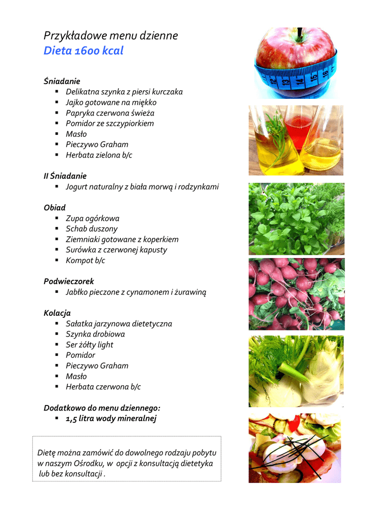 Przykładowe menu dzienne Dieta 1600 kcal Śniadanie Delikatna szynka z piersi kurczaka Jajko gotowane na miękko Papryka czerwona świeża Pomidor ze szczypiorkiem Masło Pieczywo Graham Herbata zielona b/c II Śniadanie Jogurt naturalny z biała morwą i rodzynkami Obiad Zupa ogórkowa Schab duszony Ziemniaki gotowane z koperkiem Surówka z czerwonej kapusty Kompot b/c Podwieczorek Jabłko pieczone z cynamonem i żurawiną Kolacja Sałatka jarzynowa dietetyczna Szynka drobiowa Ser żółty light Pomidor Pieczywo Graham Masło Herbata czerwona b/c Dodatkowo do menu dziennego: 1,5 litra wody mineralnej Dietę można zamówić do dowolnego rodzaju pobytu w naszym Ośrodku, w opcji z konsultacją dietetyka lub bez konsultacji .