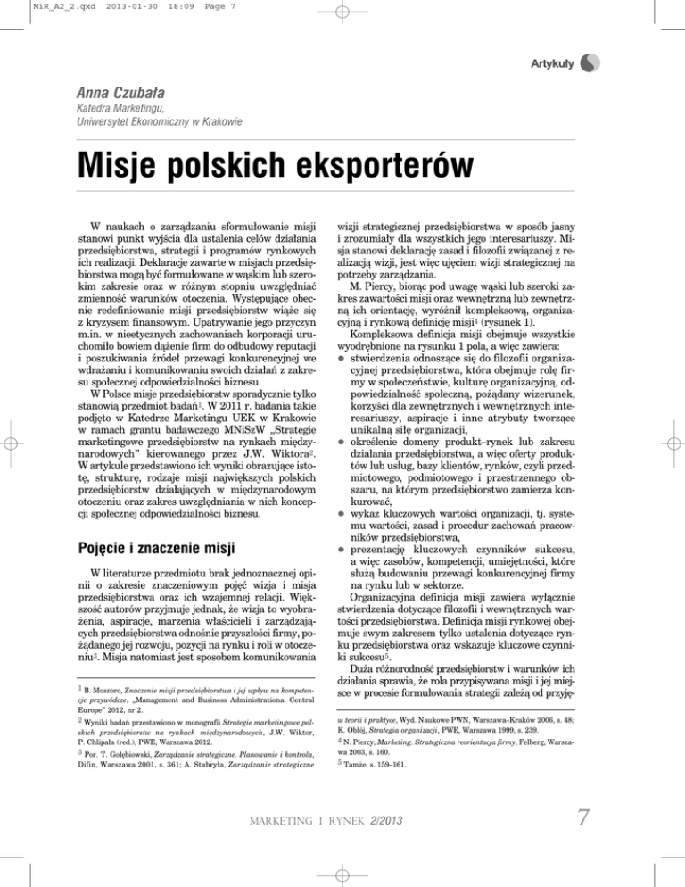 MiR_A2_2.qxd 2013-01-30 18:09 Page 7 Artykuły Anna Czubała Katedra Marketingu, Uniwersytet Ekonomiczny w Krakowie Misje polskich eksporterów W naukach o zarządzaniu sformułowanie misji stanowi punkt wyjścia dla ustalenia celów działania przedsiębiorstwa, strategii i programów rynkowych ich realizacji. Deklaracje zawarte w misjach przedsiębiorstwa mogą być formułowane w wąskim lub szerokim zakresie oraz w różnym stopniu uwzględniać zmienność warunków otoczenia. Występujące obecnie redefiniowanie misji przedsiębiorstw wiąże się z kryzysem finansowym. Upatrywanie jego przyczyn m.in. w nieetycznych zachowaniach korporacji uruchomiło bowiem dążenie firm do odbudowy reputacji i poszukiwania źródeł przewagi konkurencyjnej we wdrażaniu i komunikowaniu swoich działań z zakresu społecznej odpowiedzialności biznesu. W Polsce misje przedsiębiorstw sporadycznie tylko stanowią przedmiot badań1. W 2011 r. badania takie podjęto w Katedrze Marketingu UEK w Krakowie w ramach grantu badawczego MNiSzW „Strategie marketingowe przedsiębiorstw na rynkach międzynarodowych” kierowanego przez J.W. Wiktora2. W artykule przedstawiono ich wyniki obrazujące istotę, strukturę, rodzaje misji największych polskich przedsiębiorstw działających w międzynarodowym otoczeniu oraz zakres uwzględniania w nich koncepcji społecznej odpowiedzialności biznesu. Pojęcie i znaczenie misji W literaturze przedmiotu brak jednoznacznej opinii o zakresie znaczeniowym pojęć wizja i misja przedsiębiorstwa oraz ich wzajemnej relacji. Większość autorów przyjmuje jednak, że wizja to wyobrażenia, aspiracje, marzenia właścicieli i zarządzających przedsiębiorstwa odnośnie przyszłości firmy, pożądanego jej rozwoju, pozycji na rynku i roli w otoczeniu3. Misja natomiast jest sposobem komunikowania 1 B. Moszoro, Znaczenie misji przedsiębiorstwa i jej wpływ na kompetencje przywódcze, „Management and Business Administrationa. Central Europe” 2012, nr 2. 2 Wyniki badań przestawiono w monografii Strategie marketingowe polskich przedsiębiorstw na rynkach międzynarodowych, J.W. Wiktor, P. Chlipała (red.), PWE, Warszawa 2012. 3 Por. T. Gołębiowski, Zarządzanie strategiczne. Planowanie i kontrola, Difin, Warszawa 2001, s. 361; A. Stabryła, Zarządzanie strategiczne wizji strategicznej przedsiębiorstwa w sposób jasny i zrozumiały dla wszystkich jego interesariuszy. Misja stanowi deklarację zasad i filozofii związanej z realizacją wizji, jest więc ujęciem wizji strategicznej na potrzeby zarządzania. M. Piercy, biorąc pod uwagę wąski lub szeroki zakres zawartości misji oraz wewnętrzną lub zewnętrzną ich orientację, wyróżnił kompleksową, organizacyjną i rynkową definicję misji4 (rysunek 1). Kompleksowa definicja misji obejmuje wszystkie wyodrębnione na rysunku 1 pola, a więc zawiera: z stwierdzenia odnoszące się do filozofii organizacyjnej przedsiębiorstwa, która obejmuje rolę firmy w społeczeństwie, kulturę organizacyjną, odpowiedzialność społeczną, pożądany wizerunek, korzyści dla zewnętrznych i wewnętrznych interesariuszy, aspiracje i inne atrybuty tworzące unikalną siłę organizacji, z określenie domeny produkt–rynek lub zakresu działania przedsiębiorstwa, a więc oferty produktów lub usług, bazy klientów, rynków, czyli przedmiotowego, podmiotowego i przestrzennego obszaru, na którym przedsiębiorstwo zamierza konkurować, z wykaz kluczowych wartości organizacji, tj. systemu wartości, zasad i procedur zachowań pracowników przedsiębiorstwa, z prezentację kluczowych czynników sukcesu, a więc zasobów, kompetencji, umiejętności, które służą budowaniu przewagi konkurencyjnej firmy na rynku lub w sektorze. Organizacyjna definicja misji zawiera wyłącznie stwierdzenia dotyczące filozofii i wewnętrznych wartości przedsiębiorstwa. Definicja misji rynkowej obejmuje swym zakresem tylko ustalenia dotyczące rynku przedsiębiorstwa oraz wskazuje kluczowe czynniki sukcesu5. Duża różnorodność przedsiębiorstw i warunków ich działania sprawia, że rola przypisywana misji i jej miejsce w procesie formułowania strategii zależą od przyjęw teorii i praktyce, Wyd. Naukowe PWN, Warszawa–Kraków 2006, s. 48; K. Obłój, Strategia organizacji, PWE, Warszawa 1999, s. 239. 4 N. Piercy, Marketing. Strategiczna reorientacja firmy, Felberg, Warszawa 2003, s. 160. 5 Tamże, s. 159–161. MARKETING I RYNEK 2/2013 7 MiR_A2_2.qxd 2013-01-30 18:09 Page 8 Artykuły Rysunek 1. Model misji WEWNĘTRZNA ZEWNĘTRZNA FILOZOFIA ORGANIZACYJNA DOMENA PRODUKT–RYNEK Czym chcemy być? Gdzie będziemy działać? SZEROKA SZEROKA DEFINICJA MISJI WĄSKA WĄSKA KLUCZOWE WARTOŚCI ORGANIZACYJNE KRYTYCZNE CZYNNIKI SUKCESU Jakiego postępowania oczekujemy od naszych ludzi? W czym musimy być dobrzy w tej branży? WEWNĘTRZNA ZEWNĘTRZNA Ź r ó d ł o: N. Piercy, Marketing. Strategiczna reorientacja firmy, Felberg, Warszawa 2003, s. 159. Tablica 1. Przykład schematu misji Misje cząstkowe działów przedsiębiorstwa Misja przedsiębiorstwa Administracyjno-finansowy Produkcji Sprzedaży Pozostałe działy Służenie naszym klientom Przekraczanie oczekiwań Zaspokajanie potrzeb i potrzeb naszych klientów klientów poprzez jakości i obsługę Zapewnienie udziałowcom (akcjonariuszom) zwrotu z kapitału Zapewnienie marży zysku Zagwarantowanie Monitorowanie z tytułu produktów konkurencyjności kosztów i analizowanie zwrotu przedsiębiorstwa z inwestycji ... Nieustanne wprowadzanie udoskonaleń w naszej organizacji Przekładanie potrzeb klientów na propozycje dotyczące doskonalenia produktów i procesów ... Działanie na rzecz dobrostanu Tworzenie klimatu naszych pracowników rozwoju zawodowego, zaufania i uznawania zasług Działanie na rzecz społeczności Doskonalenie produktów i procesów Optymalizacja finansowania relacji z klientami Dostarczanie informacji niezbędnych do wypleniania misji przedsiębiorstwa Rozbudzan