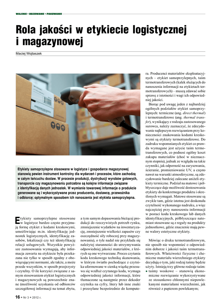 WAZENIE n DOZOWANIE n PAKOWANIE Rola jakości w etykiecie logistycznej i magazynowej Maciej Wojtaszek Etykiety samoprzylepne stosowane w logistyce i gospodarce magazynowej stanowią pewien instrument kontrolny dla wydarzeń i procesów, które zachodzą w całym łańcuchu dostaw. W procesie produkcji, dystrybucji wyrobów gotowych, transporcie czy magazynowaniu potrzebne są kolejne informacje związane z identyfikacją danych jednostek. W wymianie towarowej informacje o produkcie generowane są i wykorzystywane przez producenta, dostawcę, przewoźnika i odbiorcę; optymalnym sposobem ich nanoszenia jest etykieta samoprzylepna. E tykiety samoprzylepne stosowane w logistyce bardzo często przyjmują formę etykiet z kodami kreskowymi, umożliwiając m.in. identyfikację jednostek logistycznych, identyfikację zasobów, lokalizacji czy też identyfikację relacji usługowych. Wszystkie powyższe zastosowania wymagają, aby informacja zawarta na etykiecie była przekazana nie tylko w sposób zgodny z obowiązującymi normami, ale także, a może przede wszystkim, w sposób przejrzysty i czytelny. O ile korzyści związane z samym stosowaniem etykiet logistycznych i magazynowych są powszechnie znane (możliwość uzyskania od odbiorców szczegółowej informacji na temat zbytu, 16 l Nr 3 l 2012 r. a tym samym dopasowania bieżącej produkcji do rzeczywistych potrzeb rynku, zmniejszenie wydatków na inwentaryzację, zmniejszenie wielkości zapasów czy oszczędność siły roboczej przy magazynowaniu), o tyle nadal nie przykłada się należytej staranności do utrzymywania odpowiedniej jakości materiałów, z których są one wytwarzane. Proces czytania kodu kreskowego techniką skanowania, w którym światło pochodzące z czytnika uformowane w cienką wiązkę przesuwa się wzdłuż czytanego kodu, wymaga odpowiedniej jakości informacji, które tłumaczone są następnie przez dekoder czytnika na cyfry, litery lub inne znaki i przesyłane bezpośrednio do kompute- ra. Producenci materiałów eksploatacyjnych – etykiet samoprzylepnych, taśm termotransferowych (kalek służących do nanoszenia informacji na etykietach termotransferowych) – muszą zdawać sobie sprawę z istotności i wagi ich odpowiedniej jakości. Biorąc pod uwagę jeden z najbardziej ogólnych podziałów etykiet samoprzylepnych: termiczne (ang. direct thermal) i termotransferowe (ang. thermal transfer), wynikający z rodzaju zastosowanego surowca, należy zaznaczyć, że zdecydowanie najlepszym rozwiązaniem przy konieczności znakowania kodami kreskowymi są etykiety termotransferowe. Do zadruku wspomnianych etykiet co prawda wymagane jest użycie taśm termotransferowych, co podnosi ogólny koszt zakupu materiałów (choć w nieznacznym stopniu), jednak ze względu na takie czynniki, jak odporność na zarysowania, ścieranie, promieniowanie UV, a często nawet na warunki atmosferyczne, są zdecydowanie bardziej zalecane aniżeli etykiety termiczne. Podział na matowe i półbłyszczące daje możliwość dostosowania etykiety do konkretnego produktu i określonych wymagań. Matowe stosowane są zwykle tam, gdzie istotna jest doskonała czytelność wykonanego nadruku, a więc najczęściej przy nanoszeniu informacji w postaci kodu kreskowego lub danych identyfikacyjnych, półbłyszczące natomiast stosowane są z reguły na produkty jednostkowe, gdzie znaczenie mają pewne walory estetyczne etykiety. Mówiąc o druku termotransferowym, nie sposób nie wspomnieć o odpowiednim doborze i jakości taśm termotransferowych. Właściwości fizyczne i chemiczne materiału wierzchniego etykiety decydują o tym, jaki rodzaj taśmy będzie użyty. Istnieją trzy główne rodzaje taśm: zz taśmy woskowe – stanowią ekonomiczne rozwiązanie wykorzystywane ze stosunkowo chłonnymi niepowlekanymi materiałami wierzchnimi, jak również z papierem powlekanym; WAZENIE n DOZOWANIE n PAKOWANIE zz taśmy woskowo-żywiczne – zapewnia- jące wysoką wydajność w wielu różnych zastosowaniach końcowych. Stosowane z powodzeniem w zestawieniu z materiałami niechłonnymi, jak również z papierami typu Vellum, gdzie wymagana jest wyjątkowa odporność mechaniczna; zz taśmy żywiczne – przeznaczone do bardzo wymagających zastosowań, w których konieczne jest uzyskanie nadruku odpornego na uszkodzenia mechaniczne, działanie rozpuszczalników czy wysokie temperatury. Przewaga jakościowa etykiet termotransferowych nie dyskwalifikuje, rzecz jasna, użycia etykiet termicznych. Wykonane z termoczułego papieru, wykorzystywane są głównie w branży spożywczej (FMCG), gdzie żywotność produktu sięga kilku, kilkunastu dni. Walory ekonomiczne oraz chociażby fakt nieco szybszej możliwości nanoszenia informacji (brak konieczności wygospodarowania czasu na zmianę rolek taśm barwiących) sprawiają, że są one używane także przez producentów branży logistycznej czy magazynowej. Krótki cykl eksploatacji etykiet oraz fakt blaknięcia pod wpływem czasu powodują jednak, że ich główne zastosowania to etykietowanie wagowo-cenowe, w transporcie przemysłowym oraz w etykietowaniu automatycznym w branży spożywczej. Chcąc wspomnieć o jakości druku etykiet termicznych, należy podkreślić, że zależy ona w dużej mierze od czułości papieru; optymalny papier termiczny charakteryzuje się niską czułością statyczną (temperatura, w jakiej rozpoczyna się reakcja chemiczna w powłoce termicznej) w połączeniu z wysoką czułością dynamiczną (prędkość reakcji materiału termicznego podczas drukowania). Choć obie metody wydruku nie są nowe, są coraz częściej stosowane na rynku dzięki większemu wykorzystaniu etykiet w handlu detalicznym i produkcji, tendencji do stosowania mniejszych opakowań (rozmiary etykiet nie maleją wraz z nimi) oraz ograniczonej konkurencyjności innych technologii znakowania. Coraz powszechniej w logistyce, mechanice czy automatyce znajdują zastosowanie etykiety foliowe.