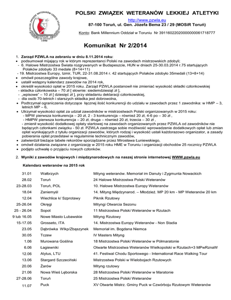 Komunikat Nr 2/2014 - Polski Związek Weteranów Lekkiej Atletyki