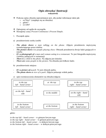 Opis obrazka/ ilustracji wskazówki Podczas opisu obrazka najważniejsze jest, aby podać informacje takie jak: o co?/kto? (znajduje się na obrazku) o gdzie? o co robi? Opisujemy od ogółu do szczegółu. Stosujemy czasy Present Continuous i Present Simple. 1. Początek opisu a) przedstawienie osoby (osób) The photo shows a man talking on the phone. Zdjęcie przedstawia mężczyznę rozmawiającego przez telefon. The picture shows two people playing chess. Obrazek przedstawia dwoje ludzi grających w szachy. It’s a photograph of a man and woman eating in a restaurant. To jest fotografia mężczyzny i kobiety jedzących w restauracji. There is a child in the photo. Na zdjęciu jest dziecko. There are some people in the picture. Na obrazku jest kilkoro ludzi. - b) przedstawienie miejsca It’s a picture of a park. To jest obrazek parku. The photo shows a view of a park. Zdjęcie pokazuje widok parku. - c) opis rozmieszczenia elementów na obrazku/zdjęciu in the top left – hand corner at the top in the top right – hand corner on the left – hand side in the middle on the right – hand side in the bottom left – hand corner at the bottom in the bottom right – hand corner gdzie: in the top left – hand corner – w górnym lewym rogu in the top right – hand corner – w górnym prawym rogu in the bottom left – hand corner – w dolnym lewym rogu in the bottom right – hand corner – w dolnym prawym rogu 1 at the top – na górze at the bottom – na dole on the left – hand side – po lewej stronie on the right – hand side - po prawej stronie in the middle – po środku Np. At the bottom of the picture there is a chessboard. One man is sitting on the grass slightly to the left of the picture. The other man is sitting on the right-hand side of the picture. Na dole obrazka jest szachownica. Jeden mężczyzna siedzi na trawie nieco z lewej strony obrazka. Drugi mężczyzna siedzi po prawej stronie obrazka. d) opis pierwszego i kolejnych planów I plan: In the foreground (of the picture) I can see … Na pierwszym planie (obrazka) widzę … II plan: In the middle distance (of this photo), there is … W środkowej odległości (zdjęcia), jest... III plan: In the background (of the picture) there is … Na drugim planie/ W tle (obrazka) jest … e) opis usytuowania elementów względem siebie - There is a bookcase behind the man on the right. Półka na książki jest za mężczyzną po prawej. behind – za in front of – przed next to – obok beside – przy between – pomiędzy f) opis wyglądu zewnętrznego osoby na ilustracji The man’s sitting on the grass. He is wearing a colourful, checked shirt and light blue jeans. He has very short white hair and he’s wearing glasses. He looks rather old, maybe even 70 or 80 years old, but he seems very energetic. Mężczyzna siedzi na trawie. On ubrany jest w kolorową, koszulę w kratkę i jasno niebieskie dżinsy. Ma krótkie, siwe włosy i nosi okulary. On wygląda raczej staro, może nawet 70 lub 80 lat, ale wydaje się być pełen energii. g) opis czynności wykonywanych przez osoby na ilustracji (czas Present Continuous) - The two men are palying chess. Tych dwóch mężczyzn gra w szachy. He is riding a bike. On jedzie na rowerze. He is similing. On się uśmiecha. h) opis przedmiotów towarzyszących ludziom There are several trees right behind the men on the right of the picture. Between the two men there is a chessboard with chess pieces on it. Jest kilka drzew za mężczyznami po prawej stronie obrazka. Pomiędzy mężczyznami znajduje się szachownica z szachami na niej. 2 i) kolejność przymiotników w opisach opinia – kształt/rozmiar – wiek – kolor – pochodzenie – materiał + RZECZOWNIK expensive beautifull stylish short long huge young black Italian old ligth blue Polish new dark green leather cotton - The man is wearing short, white, Italian, leather jacket. j) plan opisu ilustracji od ogółu do szczegółu zaczynamy od tego, co widzimy na pierwszym planie i przechodzimy do mniej lub bardziej istotnych detali z dalszych planów opisujemy szczegóły w określonym porządku, np. od lewej do prawej lub na odwrót 2. Inne aspekty opisu Jeżeli nie potrafimy jednoznacznie opisać czegoś, to musimy domyślić się, co przedstawia ilustracja. Używamy wtedy zwrotów wyrażających przypuszczenie: - I think the house belongs to very rich people. Sądzę, że ten dom należy do bardzo bogatych ludzi. It may be a family hotel and the three people are guests. To może być rodzinny hotel, a ci troje ludzi są gośćmi. It seems the are having rest. Wydaje się, że oni odpoczywają. (have rest - odpoczywać) I’d say this photo has been taken in London. Powiedziałbym, że to zdjęcie zostało zrobione w Londynie. The child must be a girl, it’s because of the long hair. To diecko to musi być dziewczynka, ponieważ ma długie włosy. The man seems to be tired. Mężczyzna wydaje się być zmęczony. The man looks older than 50. Mężczyzna wygląda starzej niż 50 lat. He is most probably a farmer. On najprawdopodobniej jest rolnikiem. In my opinion, they are having a party. Według mnie, oni mają przyjęcie. 3. Wyrażanie opinii Gdy opisujemy ilustrację, egzaminujący zada nam 2 pytania. Dotyczą one opinii i poglądów związanych z tematem ilustracji. Pytanie 1. dotyczy ilustracji bezpośrednio; jest zwykle pytaniem o Twoją opinię na temat treści materiału (jednego szczegółu) oraz prośba o uzasadnienie Twojej opinii, np.: Pyt. Do you think the child is interested in art? Why do you think so? Czy myślisz, że dziecko jest zainteresowane sztuką? Dlaczego tak myślisz? (pytanie np. do ilustracji na której mężczyzna jest z dzieckiem na rękach w galerii obrazów) Odp. I think the child is not interested in art, because it is not looking at the paintings in the gallery. I would say children should not be taken to the galleries, theatres or operas, because they don’t really underst